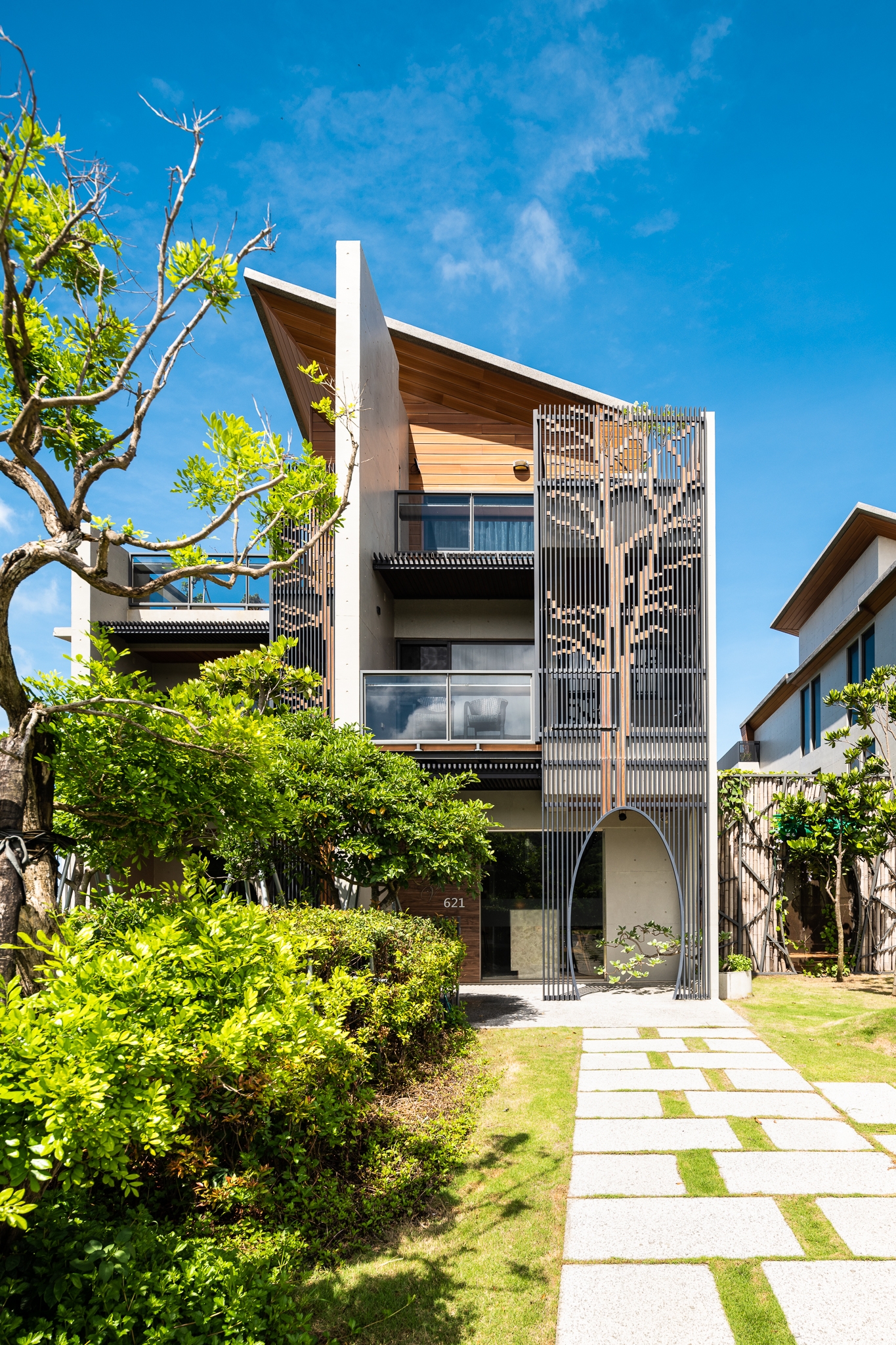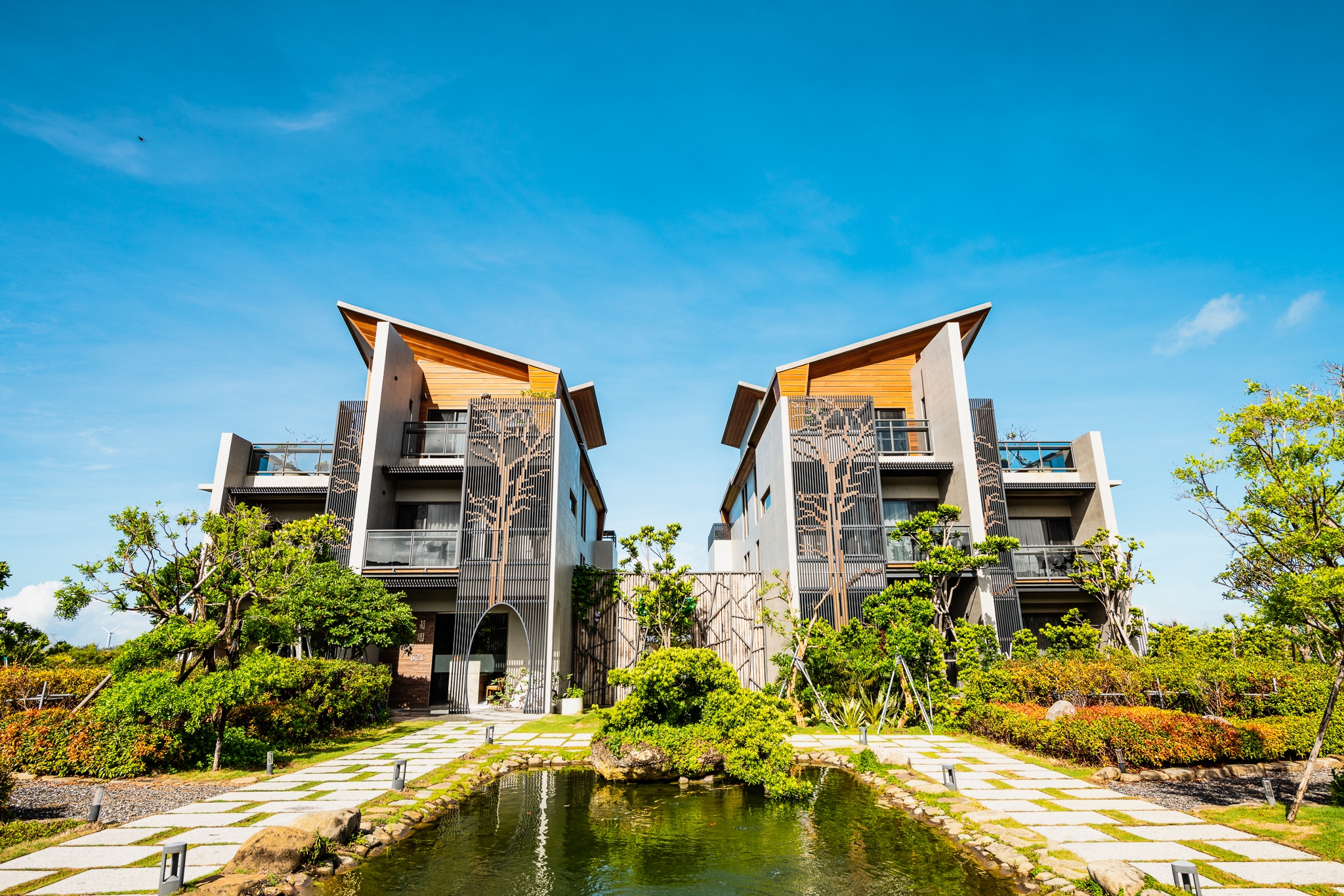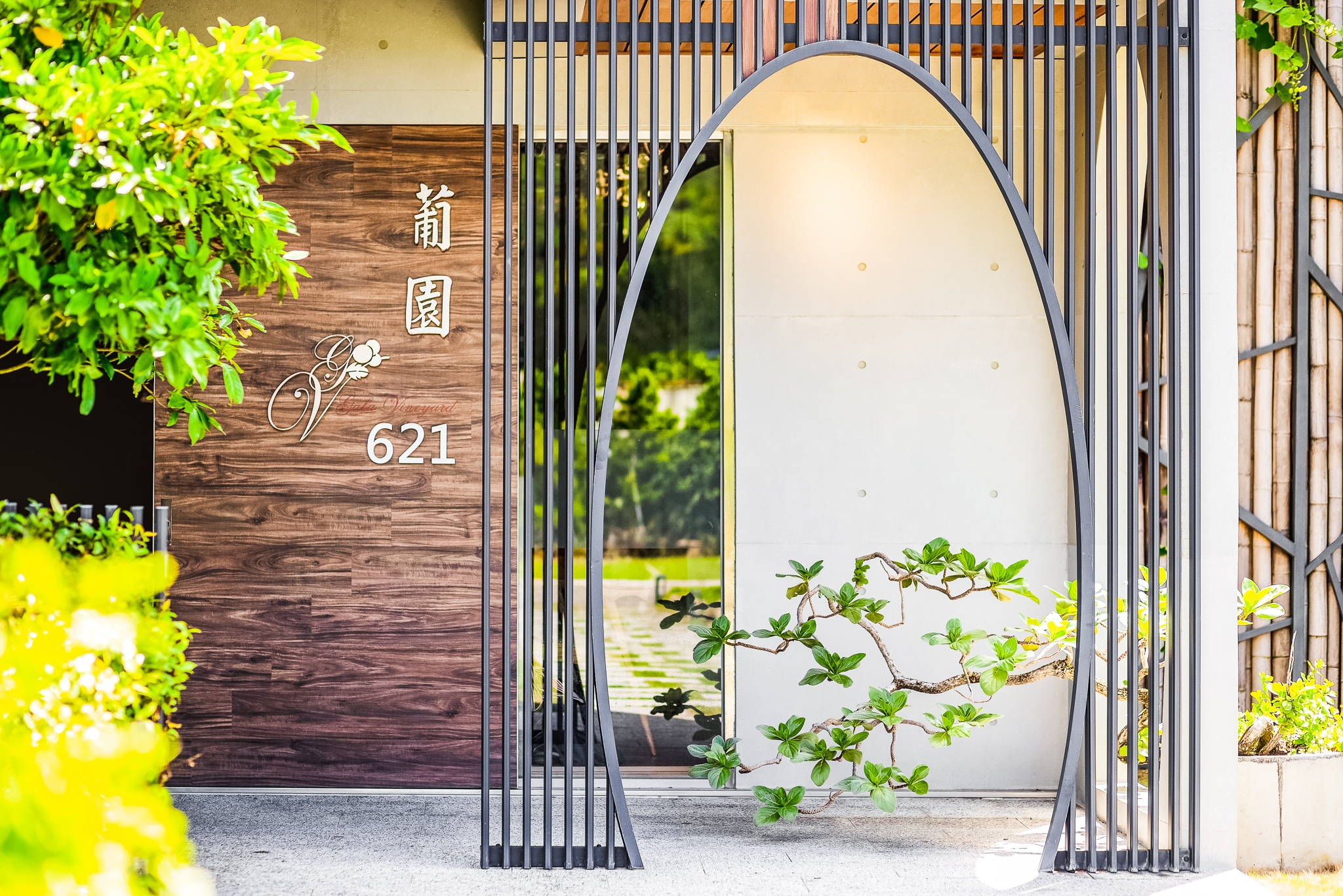By the Longluan Lake and next to a straight highway stand two three-story townhouses symmetrical in form, with their moderate volumes and simple modern concrete structures—Vineyard Clubhouse. The owner seeks to create a manor-style guest house that is low-profile but refined, modern but traditional, on this scenic estate with its face to the sea and back to the mountains, integrating landscaping and mini-fengshui to adjust the mental, physical and spiritual magnetic field. Thus a unique getaway combining nature and aesthetic comes into being. Inspired by nature, the architect bases the design on the interplay of the five elements to initiate the good circle of heaven, humanity and earth, applying how the universe works and circulates to the spatial design. In this way, a simple, serene living environment is made a reality, shaping a quiet, rustic spiritual domain.
