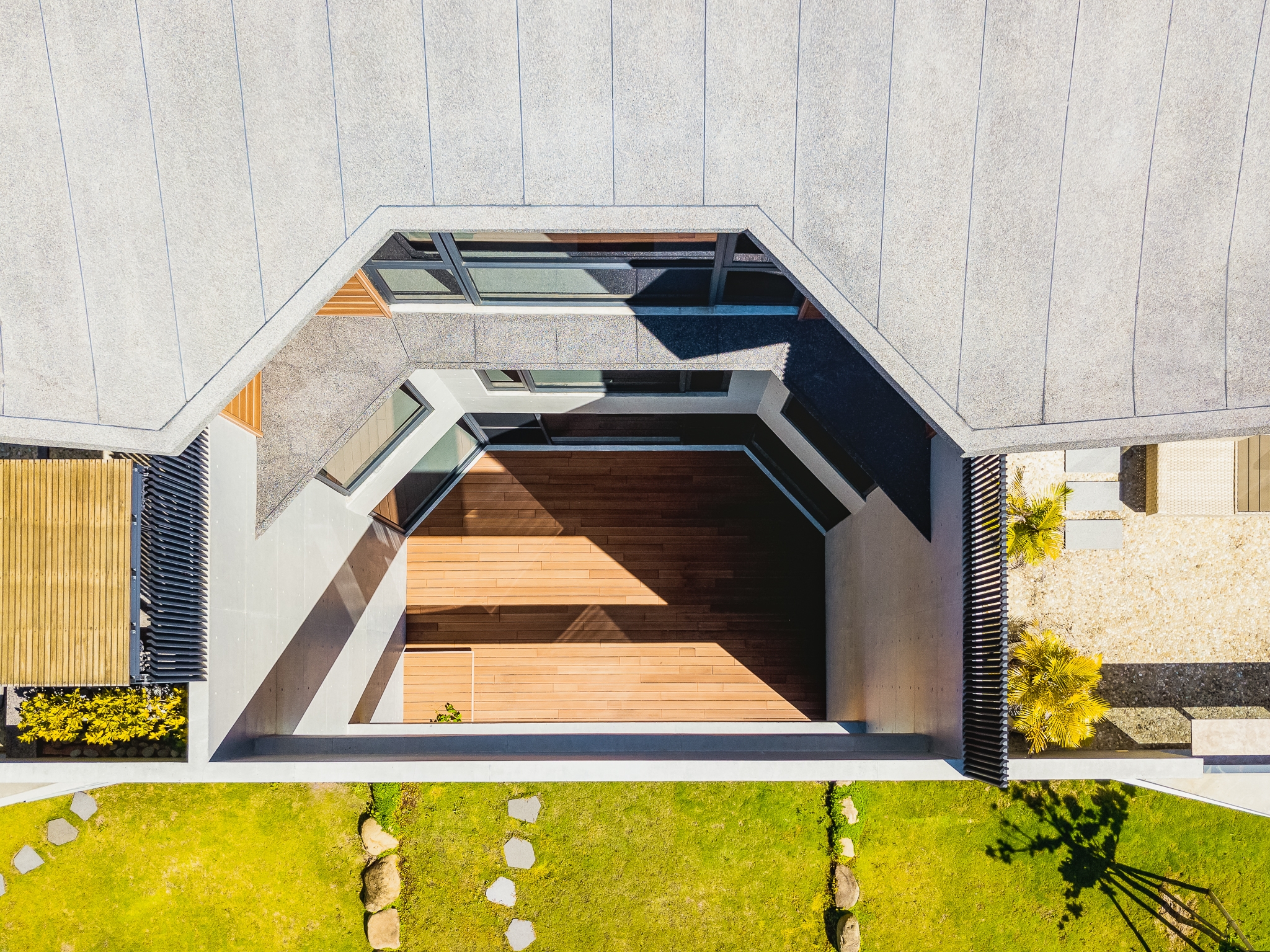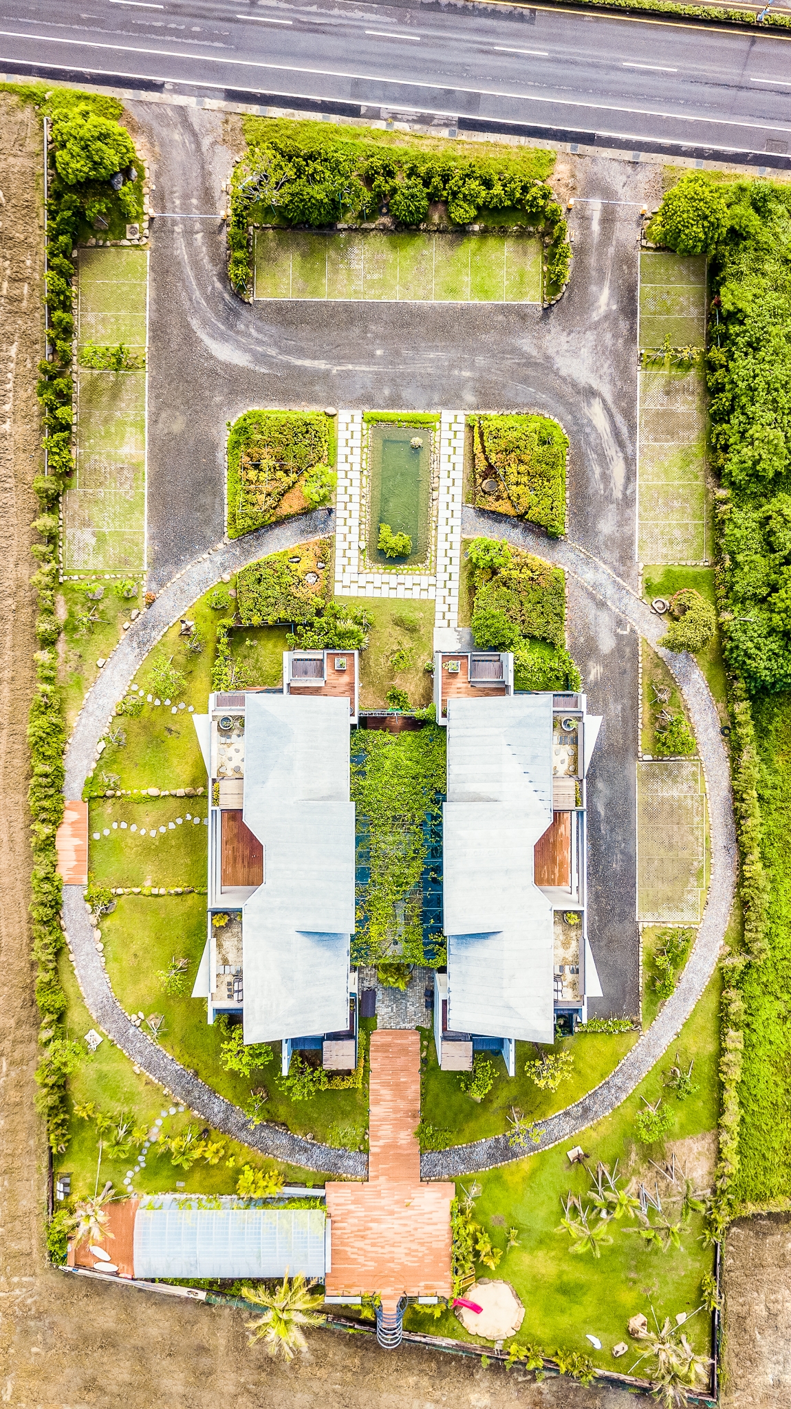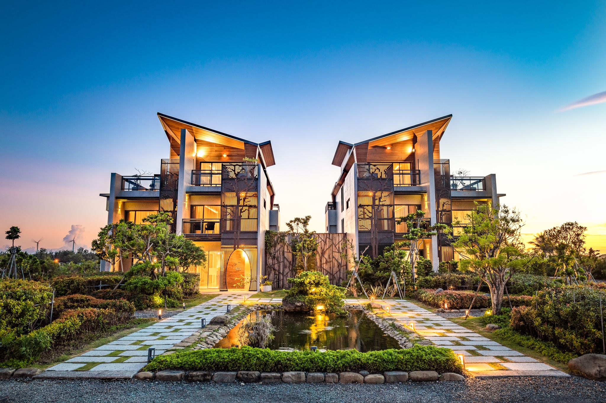 By the Longluan Lake and next to a straight highway stand two three-story townhouses symmetrical in form, with their moderate volumes and simple modern concrete structures—Vineyard Clubhouse. The owner seeks to create a manor-style guest house that is low-profile but refined, modern but traditional, on this scenic estate with its face to the sea and back to the mountains, integrating landscaping and mini-fengshui to adjust the mental, physical and spiritual magnetic field. Thus a unique getaway combining nature and aesthetic comes into being. Inspired by nature, the architect bases the design on the interplay of the five elements to initiate the good circle of heaven, humanity and earth, applying how the universe works and circulates to the spatial design. In this way, a simple, serene living environment is made a reality, shaping a quiet, rustic spiritual domain.