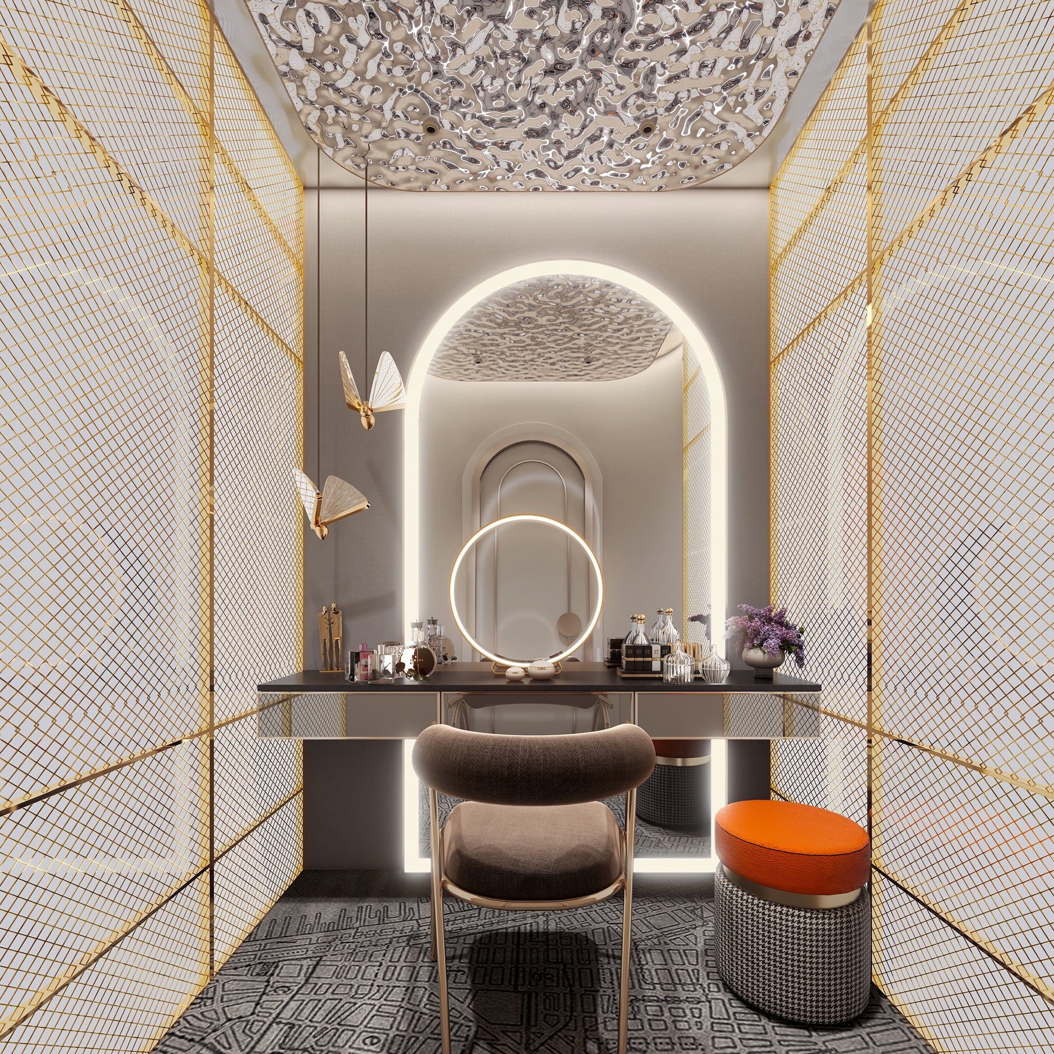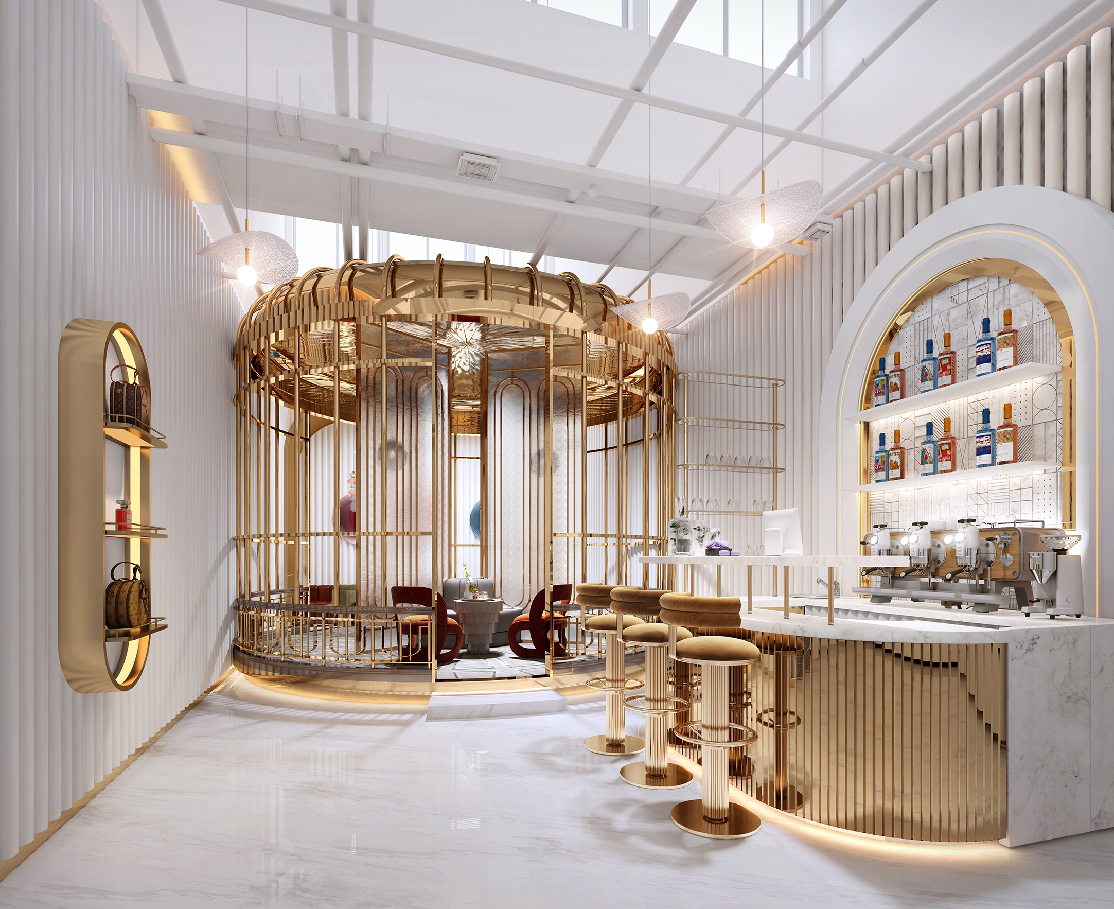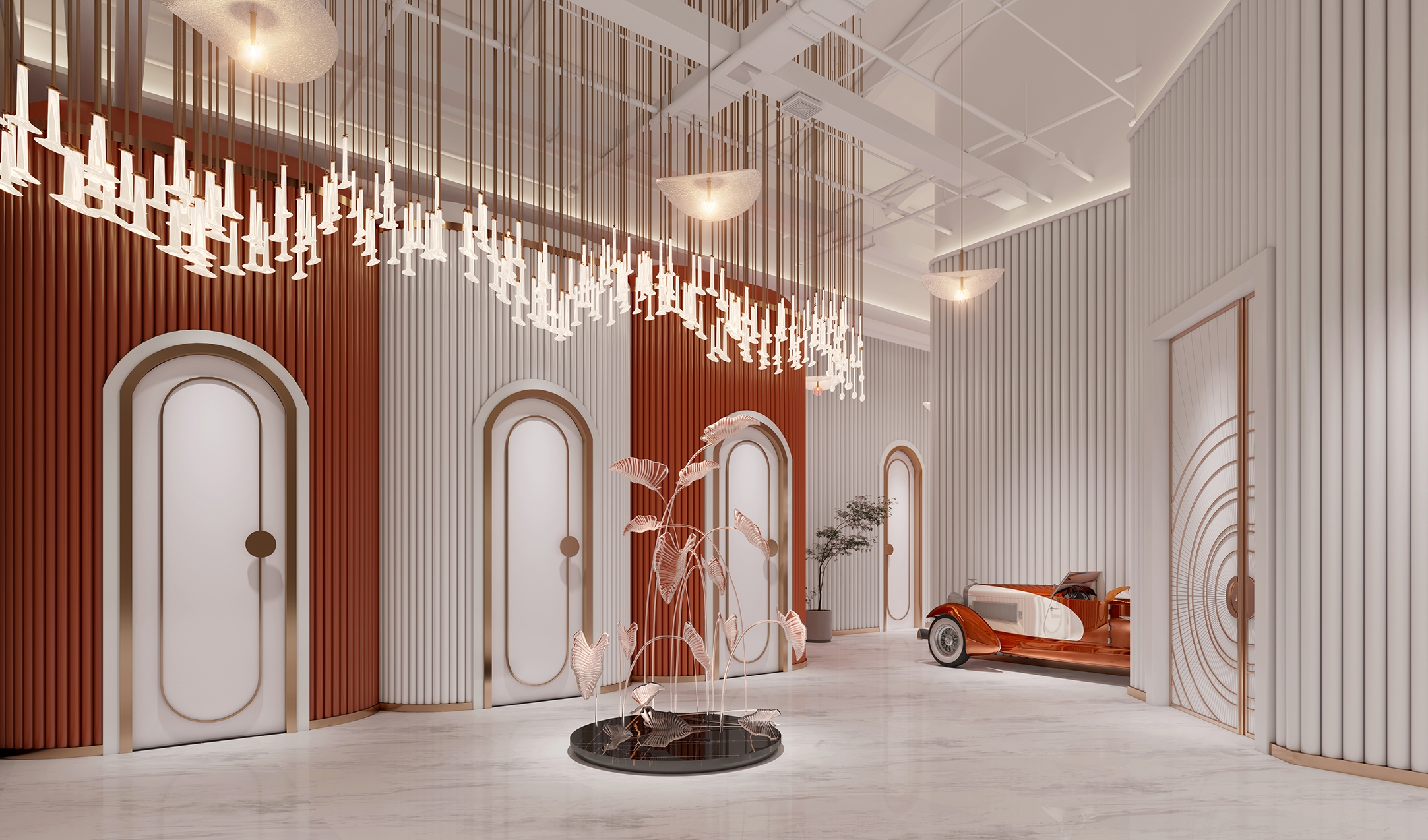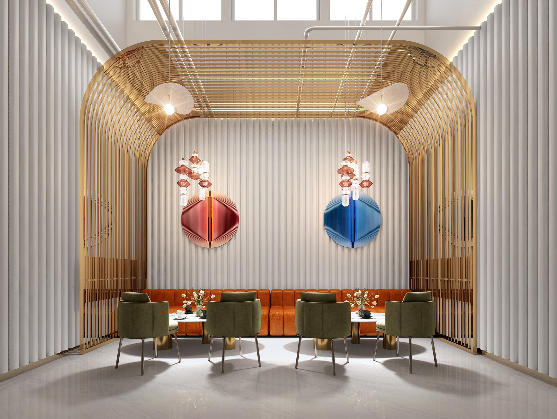 It's a renovation of an old factory. Located outside the studio of the film and Television Company, the main functions include water bar area, photography area, booth area, toilet and dressing room, costume room. The whole area serves as the reception area of the project as well as the tea break area of the shooting object. The whole space to a white semi-cylindrical shape, with brushed champagne gold stroke, decorated with Hermes orange, romantic and expensive gas.