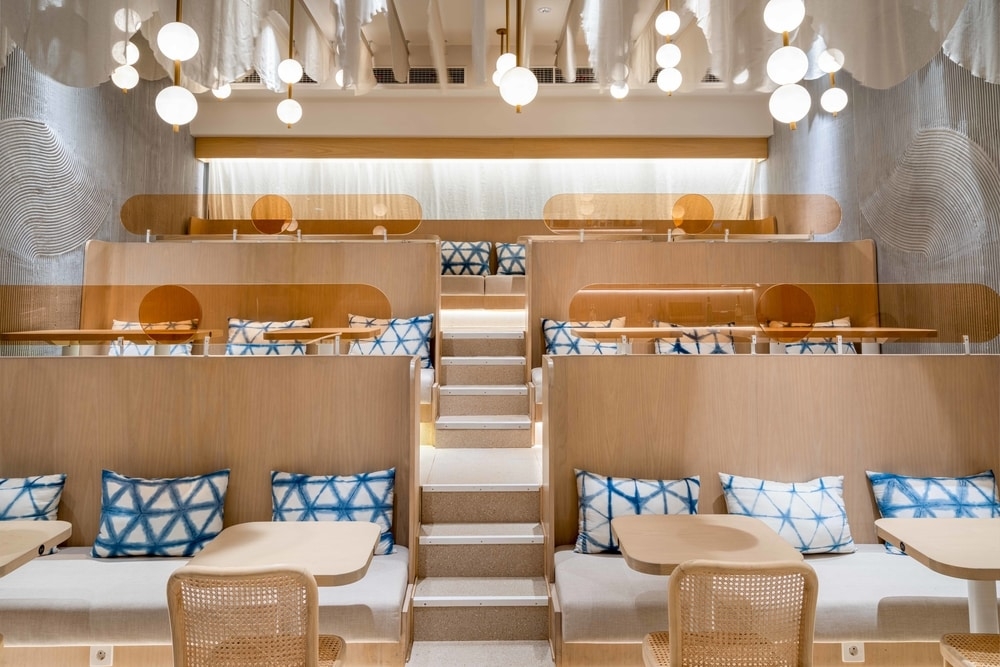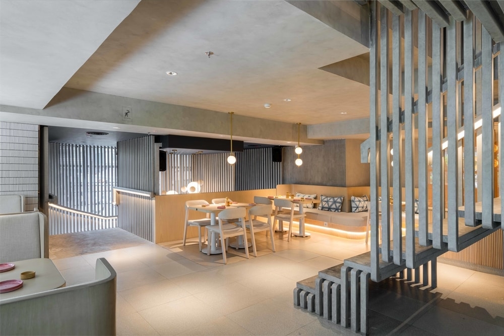 A bold vision to redefine Japanese Sushi and all-day dining for Jakarta, boasts a street-facing retail area, a sushi bar, VIP rooms, children' play area and show kitchen. All of these spaces are weaved together via an impressive main staircase, inspired as a stairway to heaven from the depths of the ocean to the lightness of the sky.