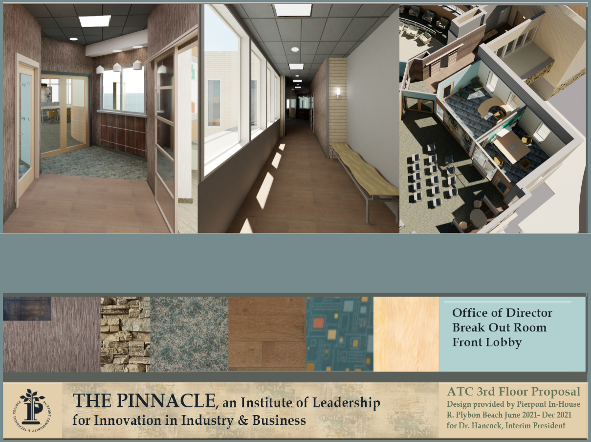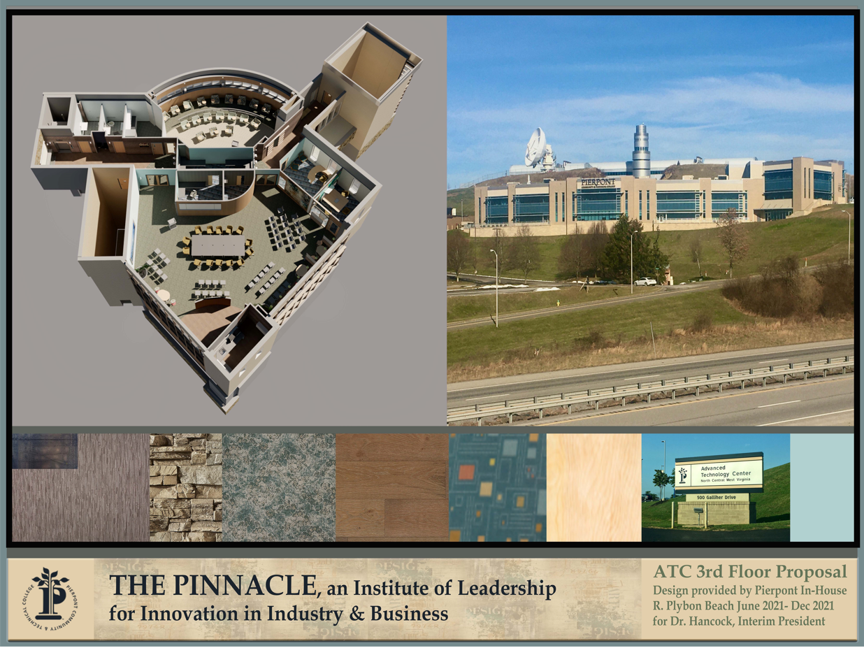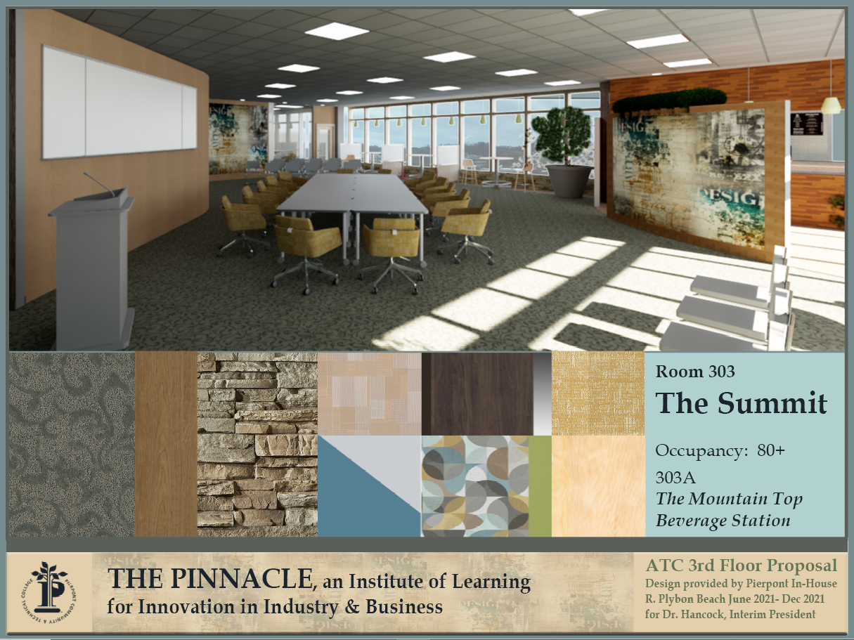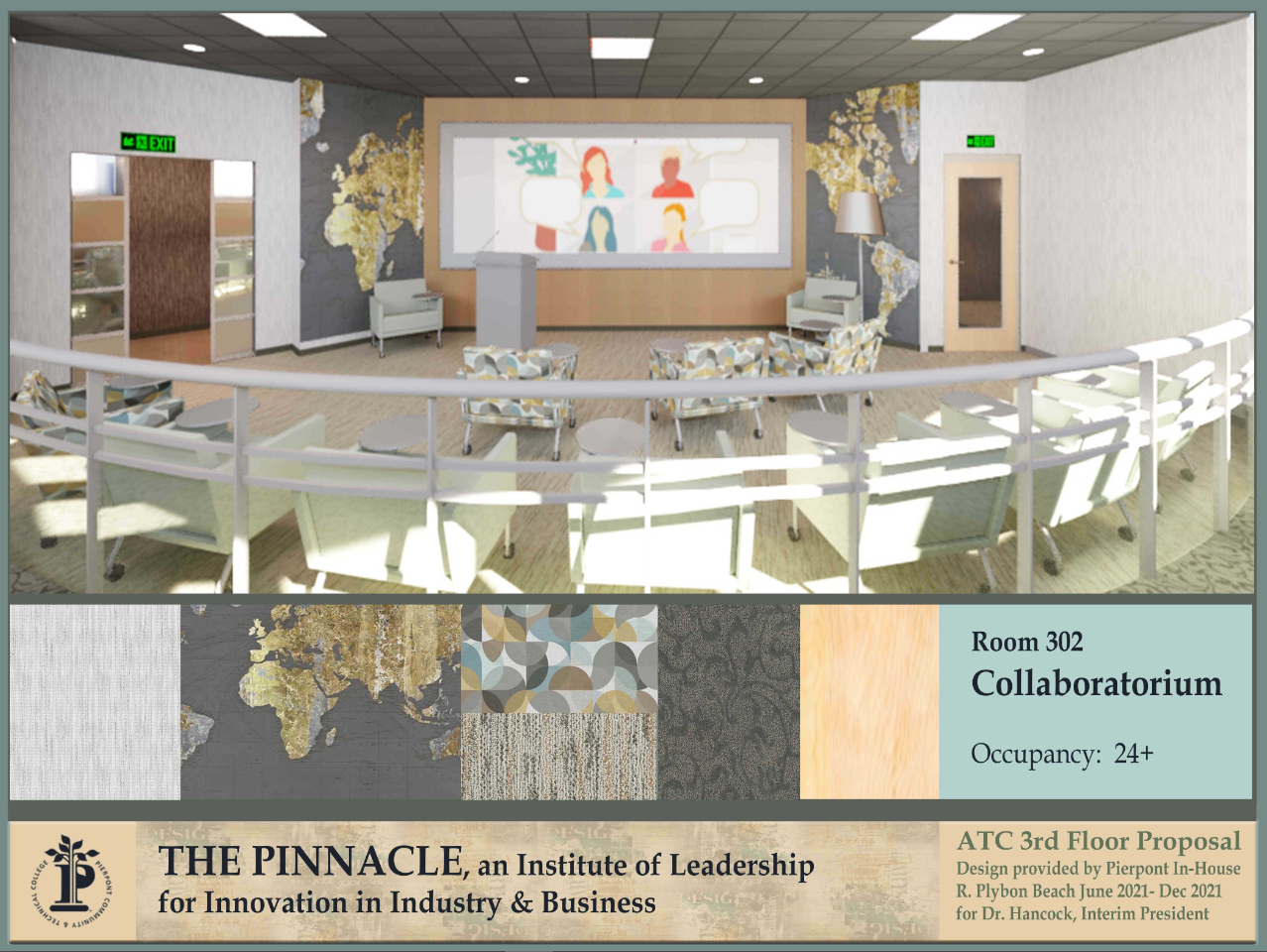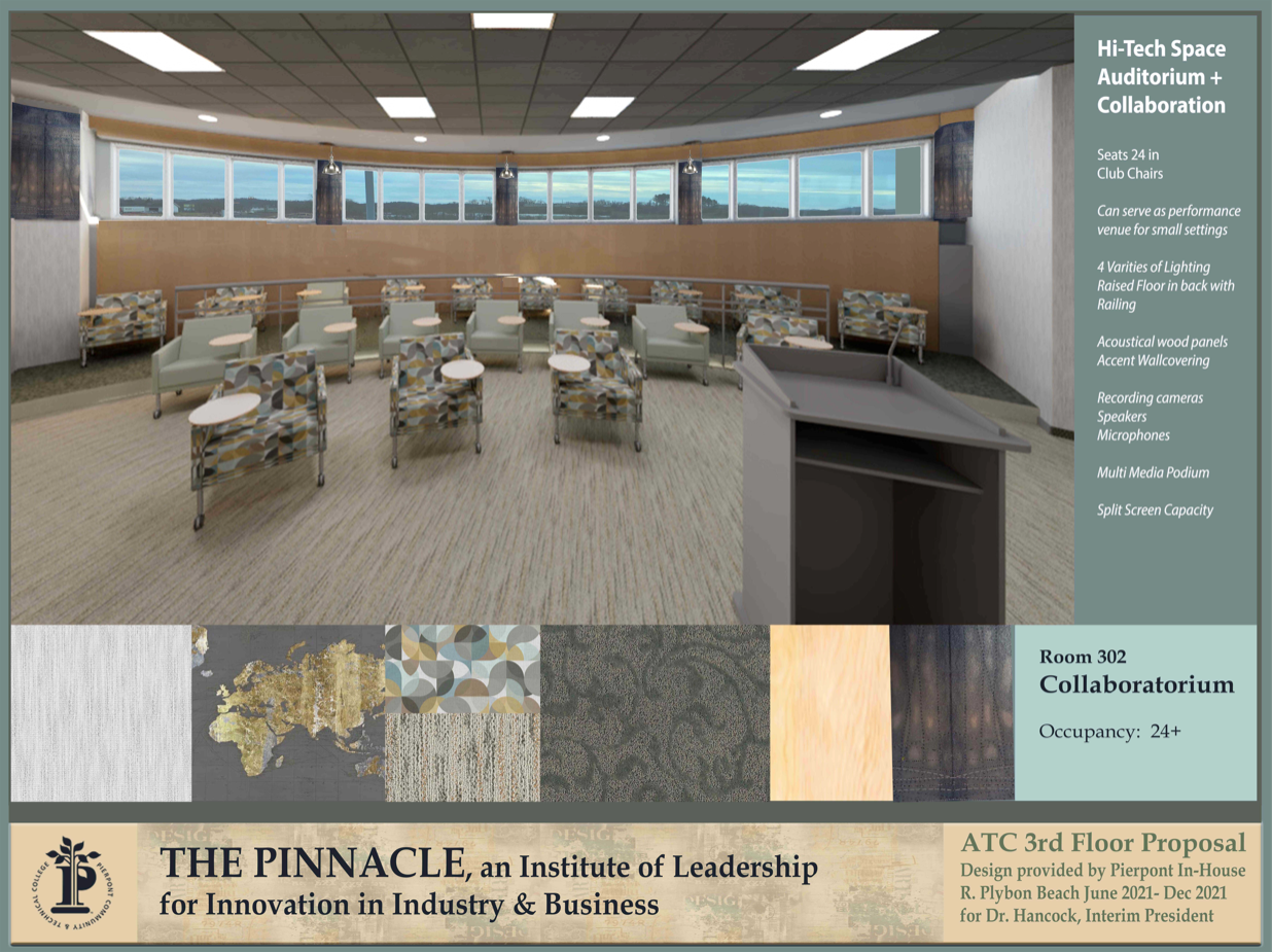 This proposal incorporated the unique cross-discipline approach of providing an event space that is flexible and multifaceted for the design challenge's function to serve a hospitality space for workforce education. The elements of collaboratorium design were sought to integrate solutions that answer the wide range of challenges in the higher education environments and the stakeholders associated with this strategic partner in the region's workforce. The ideas to place synergistic spaces with 21st-century communication and cloud-based collaboration are emphasized in the primary design details that have nuances to address creative interactions. The variety of human-centered experiences should respond to the mindfulness and wellness design attributes in the atmosphere. It will be an addition to the college that has been designed to meet the goals similar to achieving the heights of reaching the top of The Pinnacle.