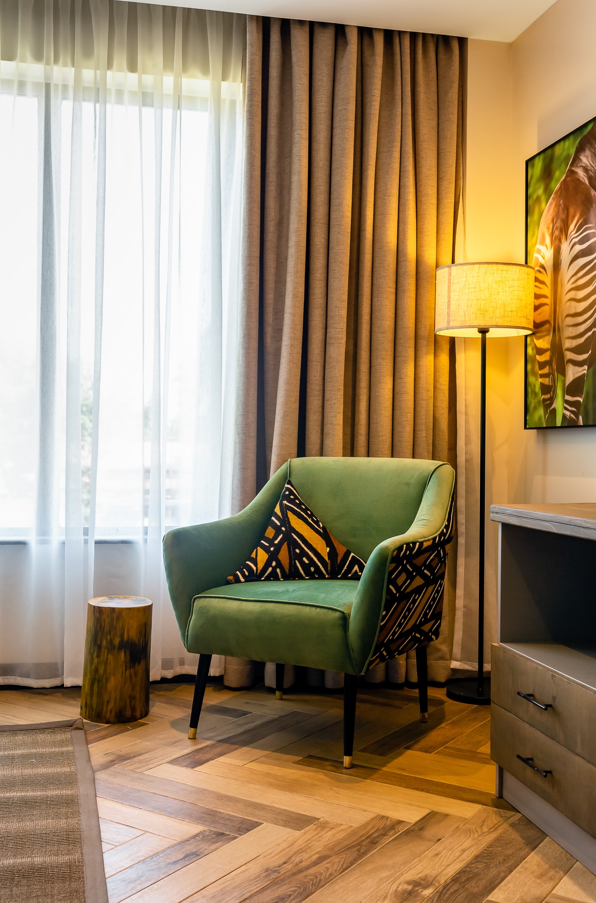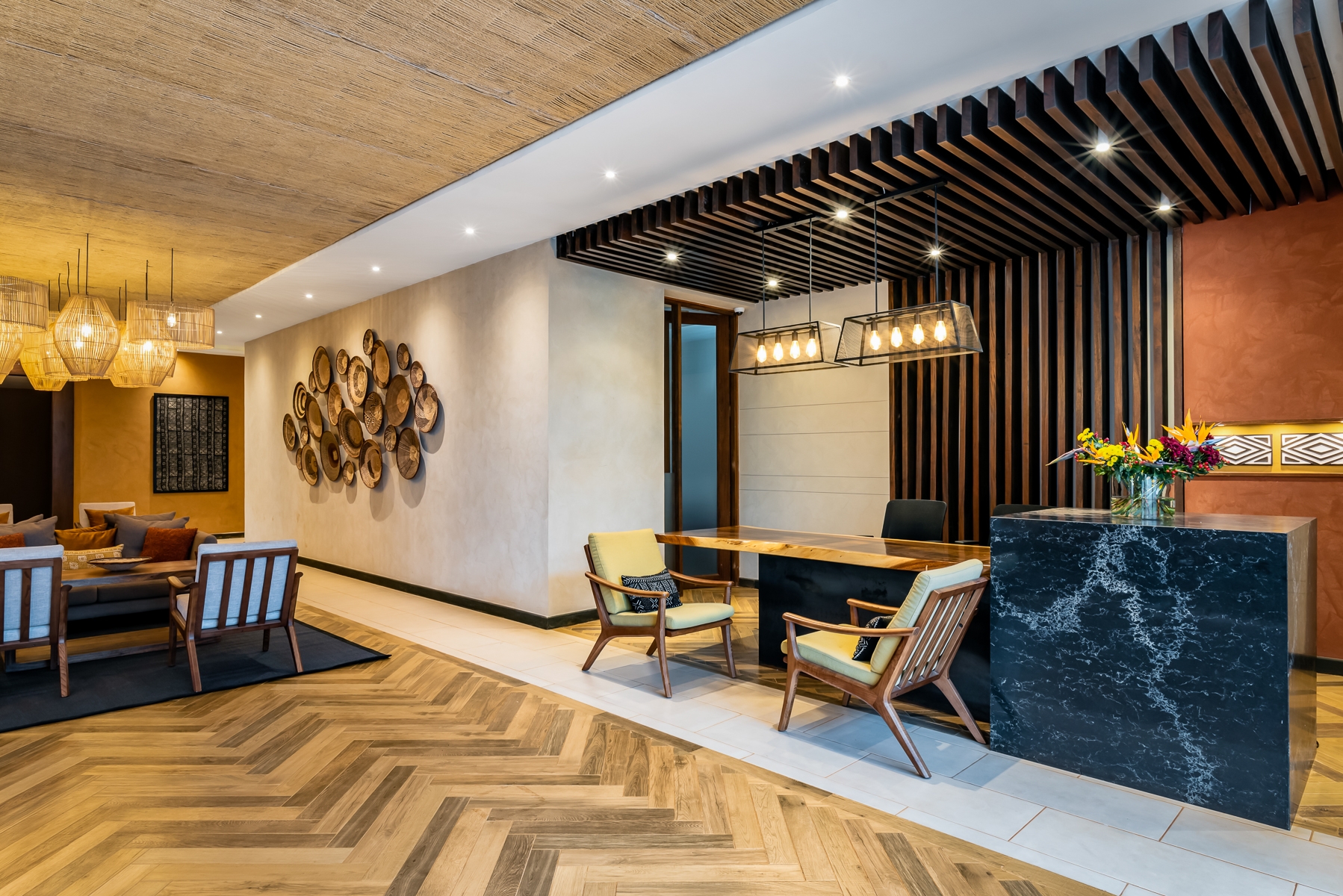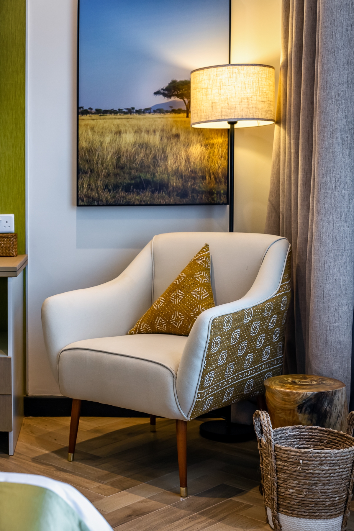 The guest experience throughout the boutique hotel is a rich and authentic journey across these four biomes within a contemporary setting. Savanna grasslands are represented by a pastel palette ranging from straw and taupe with hints of sage. The fertile and forested Tropics are manifested by the forest greens, charcoal, moss, and cedar shades. African deserts are depicted by ochre, red, saffron, and tan colors while a combination of ocean, teal, ivory, and turquoise schemes portray the beautiful Coastal areas. In tandem with the selected African landscape, accessories were sourced from local artisans from the specific regions.