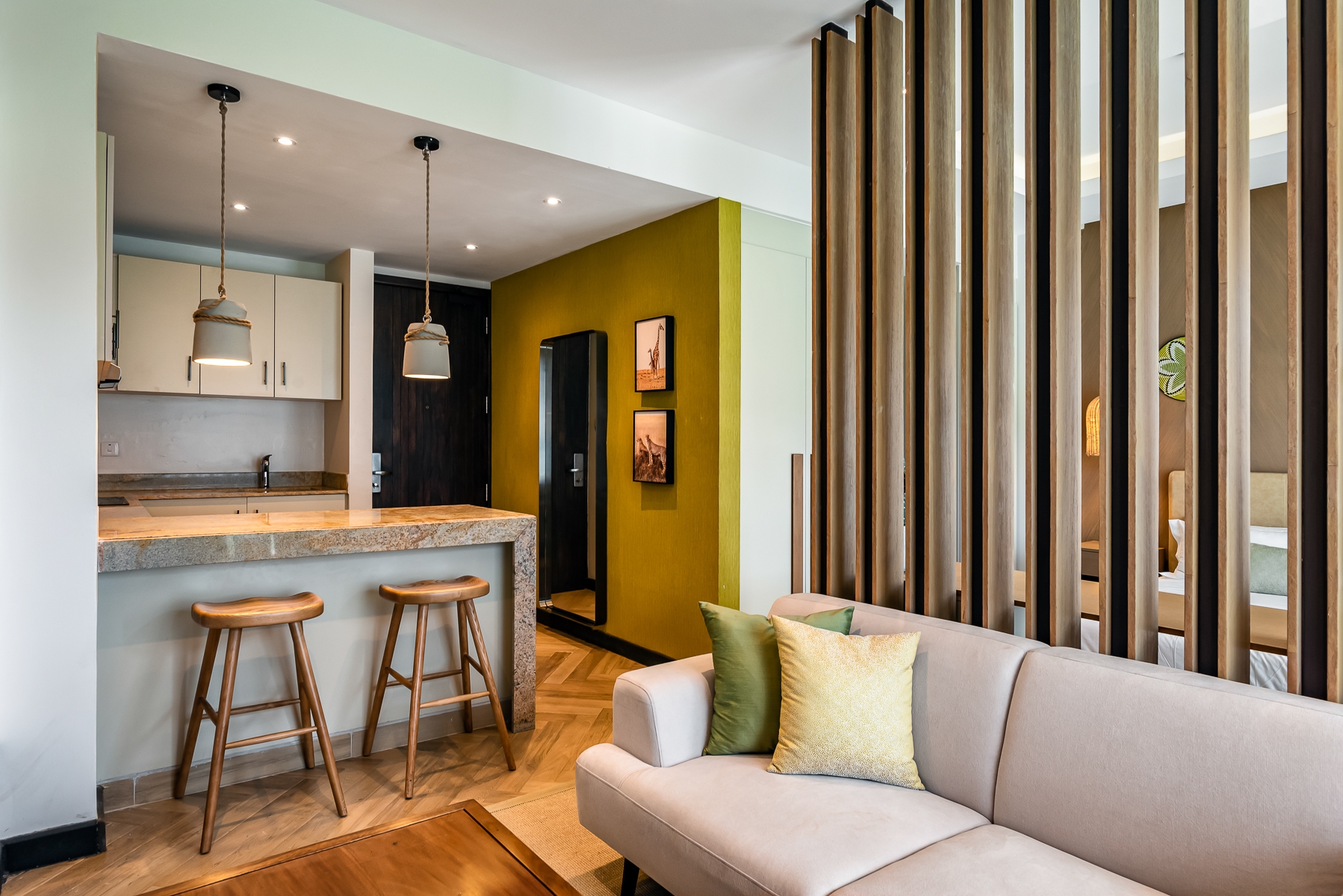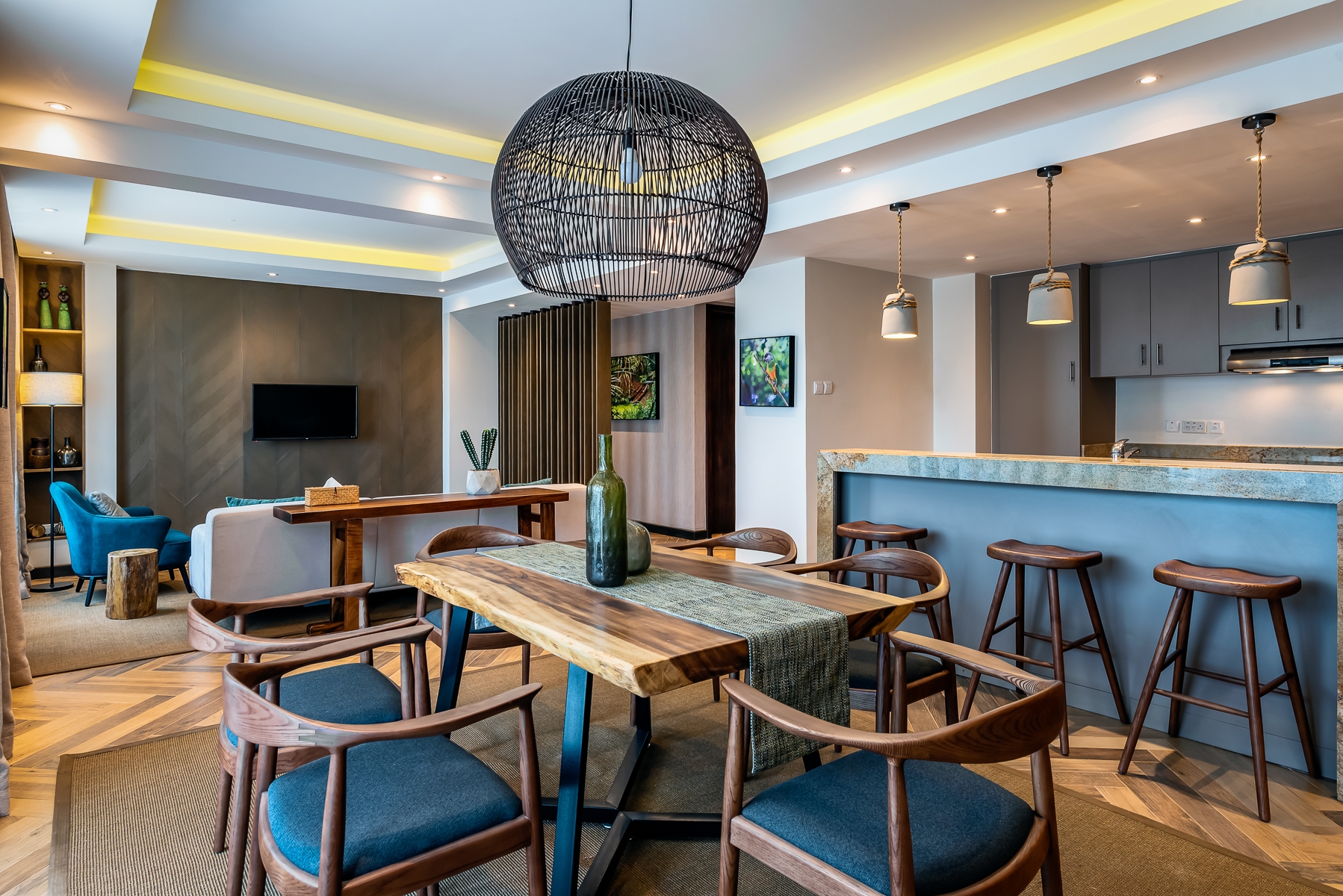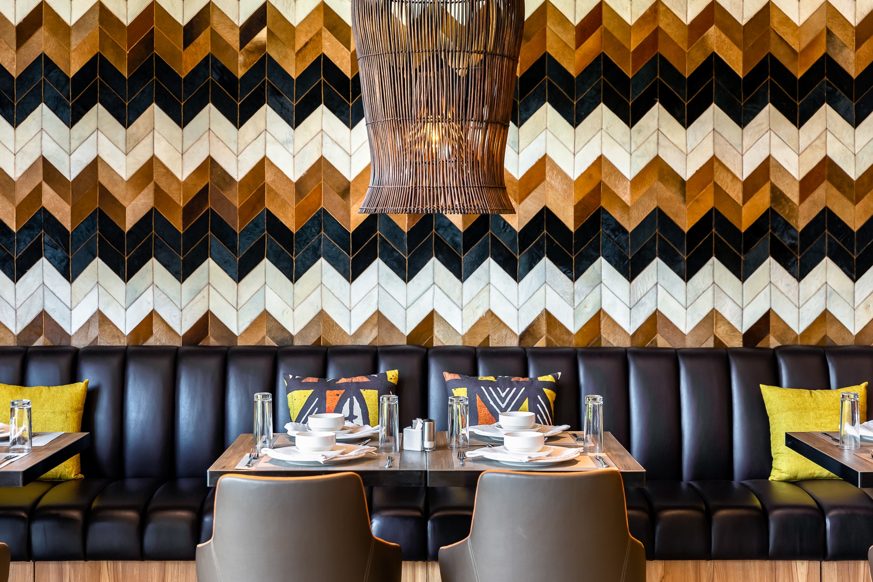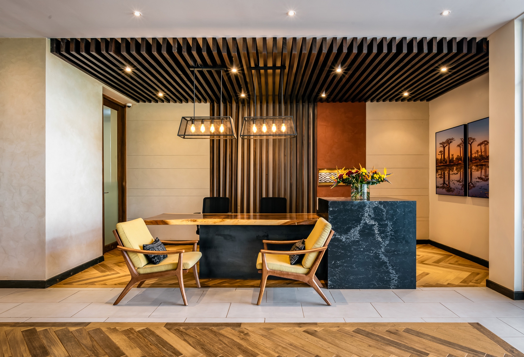 The guest experience throughout the boutique hotel is a rich and authentic journey across these four biomes within a contemporary setting. Savanna grasslands are represented by a pastel palette ranging from straw and taupe with hints of sage. The fertile and forested Tropics are manifested by the forest greens, charcoal, moss, and cedar shades. African deserts are depicted by ochre, red, saffron, and tan colors while a combination of ocean, teal, ivory, and turquoise schemes portray the beautiful Coastal areas. In tandem with the selected African landscape, accessories were sourced from local artisans from the specific regions.