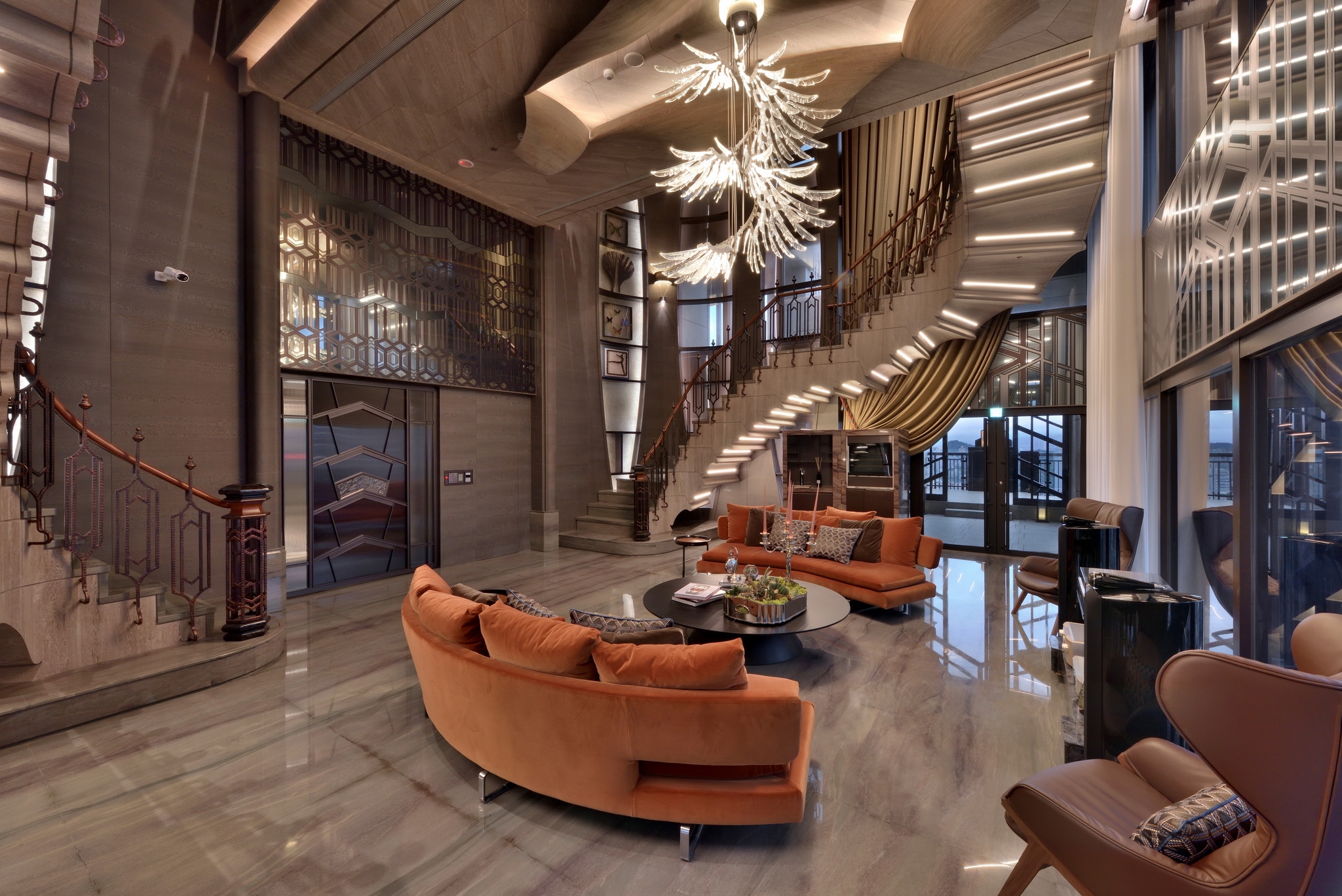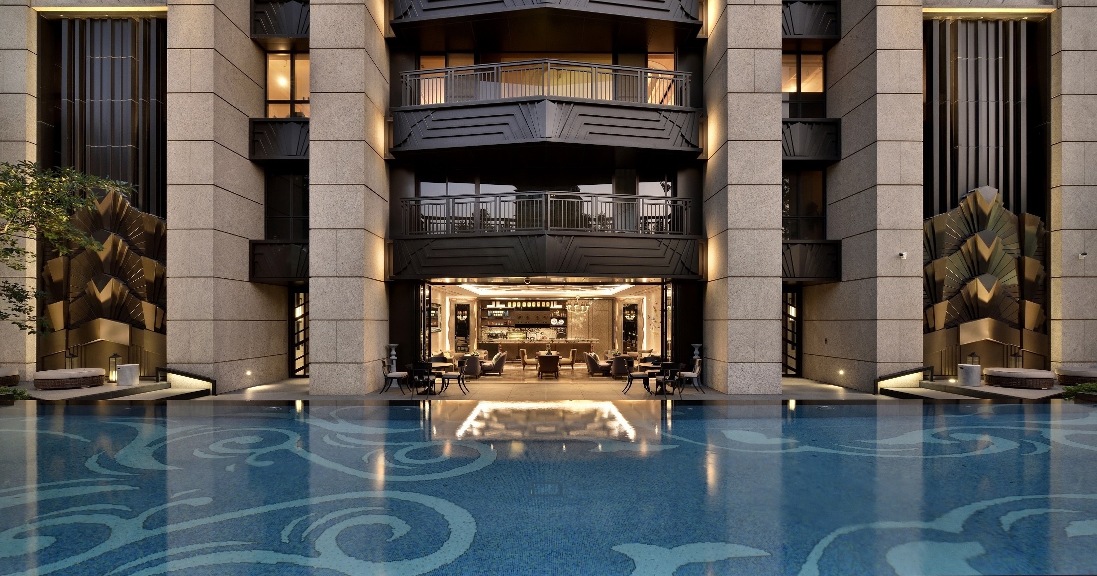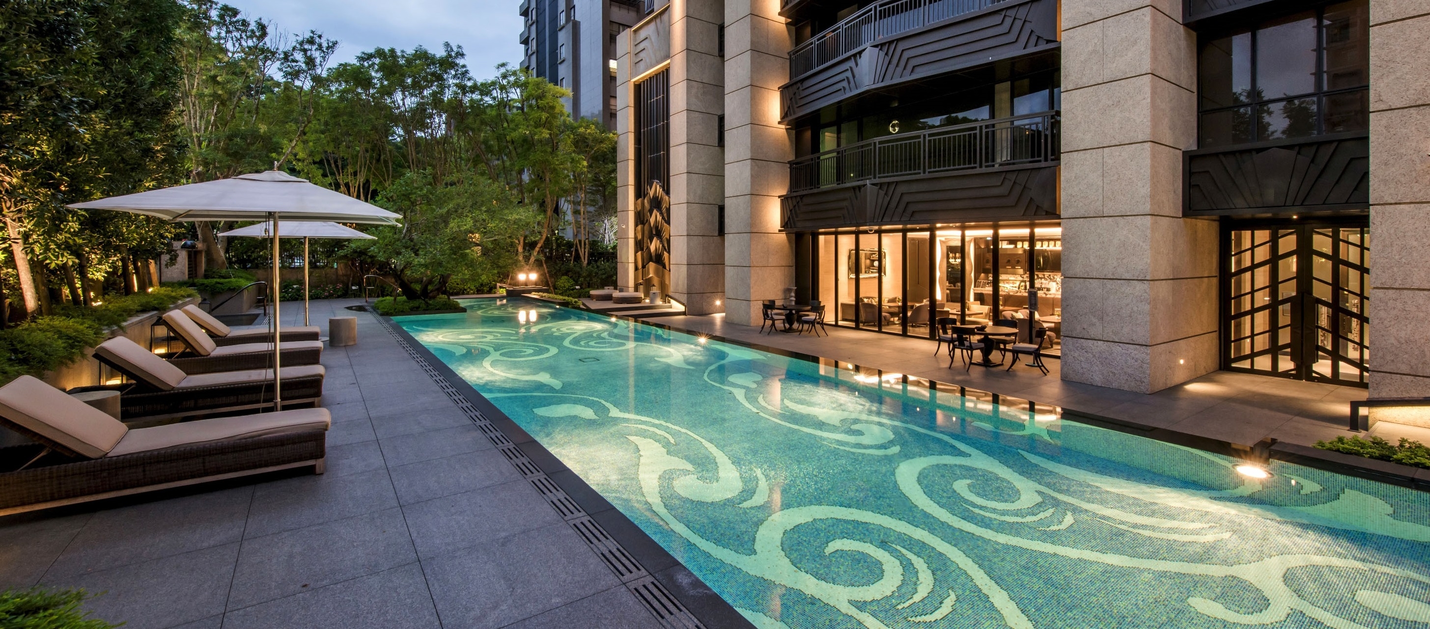 The Keelung River is transformed into the lobby water wall, with geometric lines flowing downward. Residents are greeted by an extraordinary steel unicorn sculpture that is like a dream come to life. The floor blooms like a flower with Azul Bahia granite, black silver and red copper outlining a unique pattern of water ripples, flowers and leaves. The dance of peony on the carpet is gently accompanied by piano music. The reception counter is carved with a rounded arc, and the back wall recalls a gold-faced mountain with layers of rock veins. A six-meter-high titanium-plated bronze electric door is beautifully engraved with a pattern of butterflies. Acting as a stage curtain it gives privacy to residents when closed and reveals the spectacle inside when opened. The courtyard has a large garden and pond, while the backyard reveals a forest and swimming pool for leisure time. Patterns of light blue peonies and azure laurel leaves playfully dance at the bottom of the pool. The sky bar offers elevated vistas of the cityscape and, like a butterfly emerging from its cocoon to spread its wings, the symmetrical spiral staircase stretches to the sky revealing magnificent views of Taipei 101.
