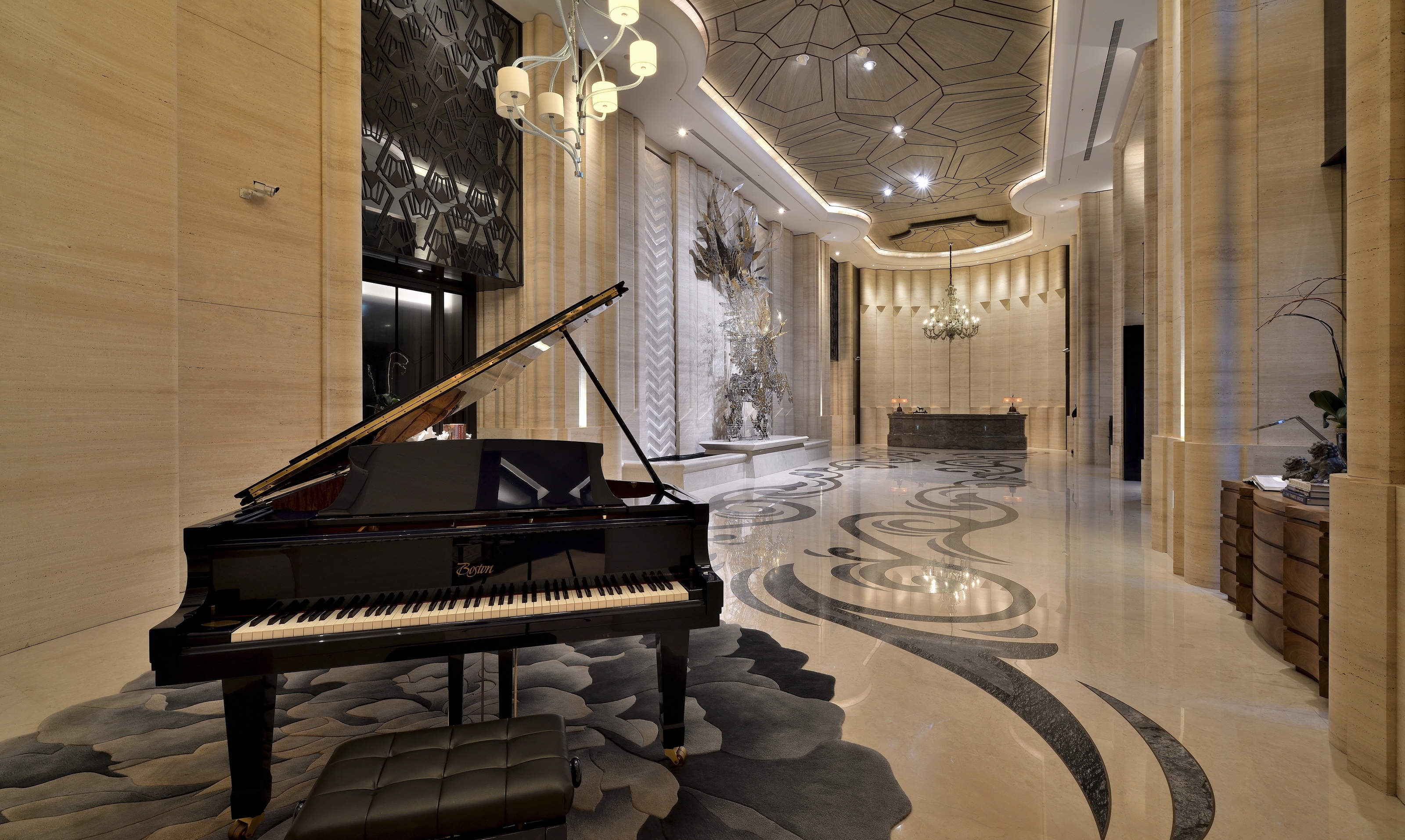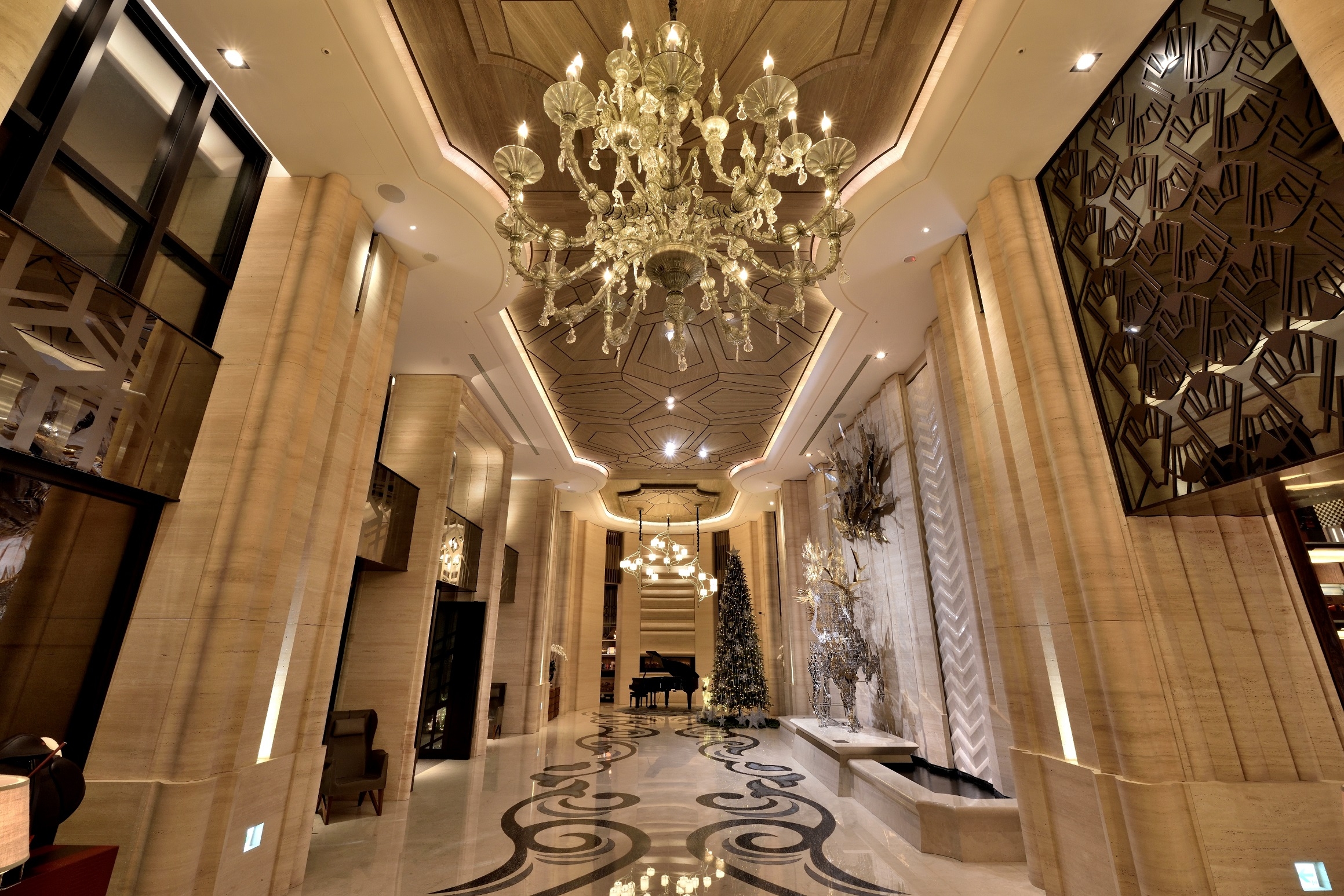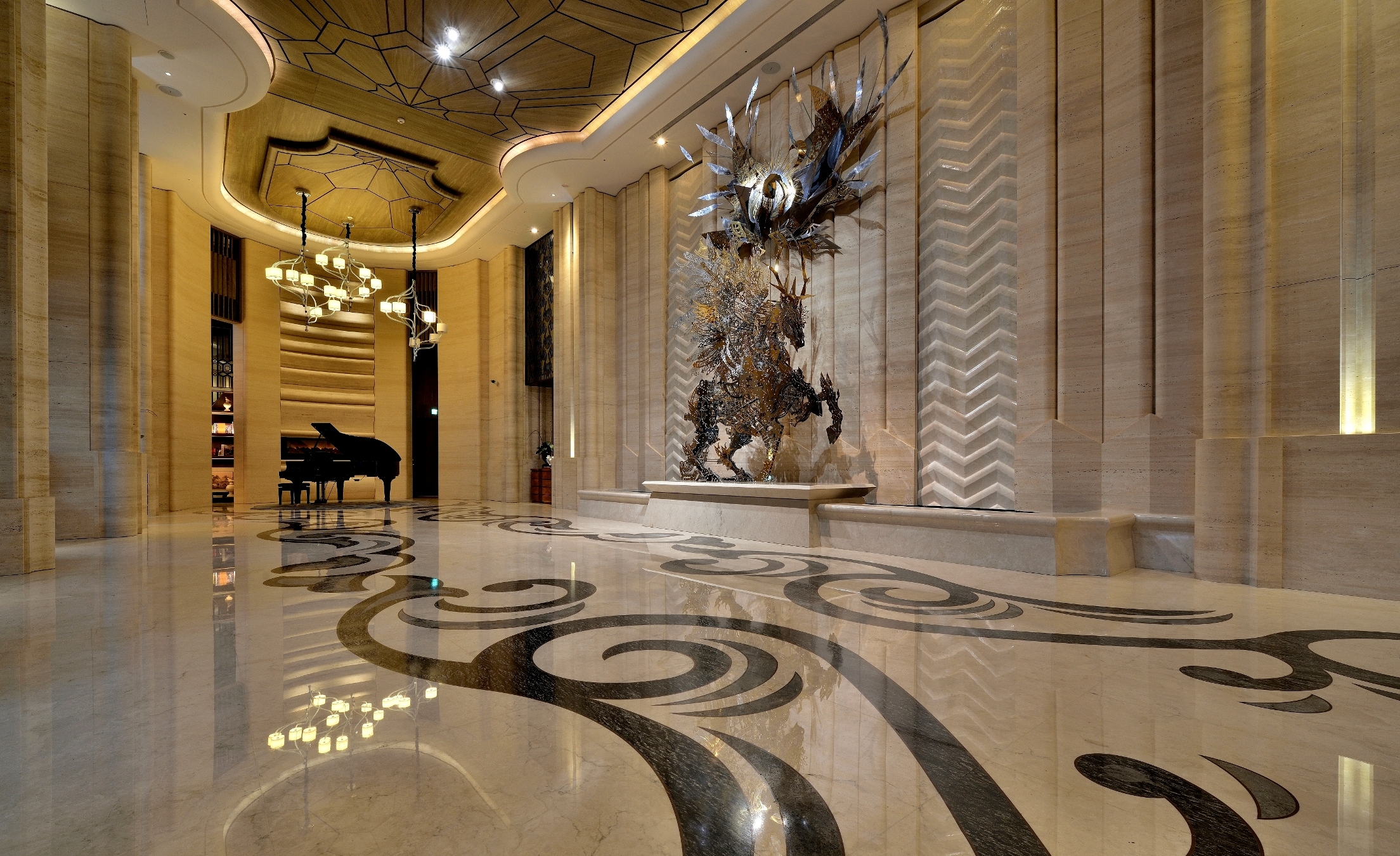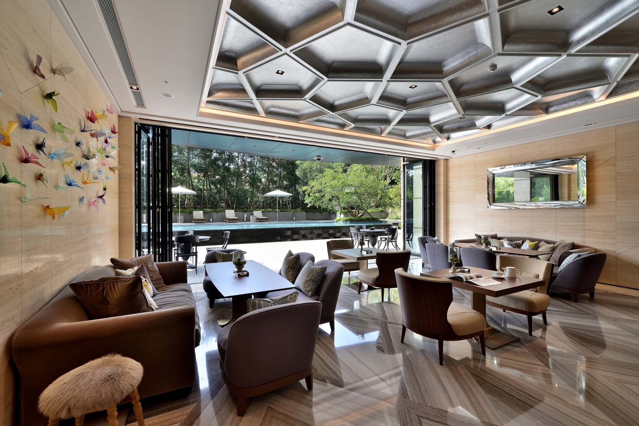 The Keelung River is transformed into the lobby water wall, with geometric lines flowing downward. Residents are greeted by an extraordinary steel unicorn sculpture that is like a dream come to life. The floor blooms like a flower with Azul Bahia granite, black silver and red copper outlining a unique pattern of water ripples, flowers and leaves. The dance of peony on the carpet is gently accompanied by piano music. The reception counter is carved with a rounded arc, and the back wall recalls a gold-faced mountain with layers of rock veins. A six-meter-high titanium-plated bronze electric door is beautifully engraved with a pattern of butterflies. Acting as a stage curtain it gives privacy to residents when closed and reveals the spectacle inside when opened. The courtyard has a large garden and pond, while the backyard reveals a forest and swimming pool for leisure time. Patterns of light blue peonies and azure laurel leaves playfully dance at the bottom of the pool. The sky bar offers elevated vistas of the cityscape and, like a butterfly emerging from its cocoon to spread its wings, the symmetrical spiral staircase stretches to the sky revealing magnificent views of Taipei 101.