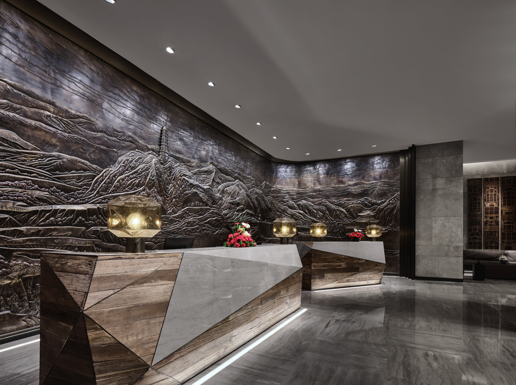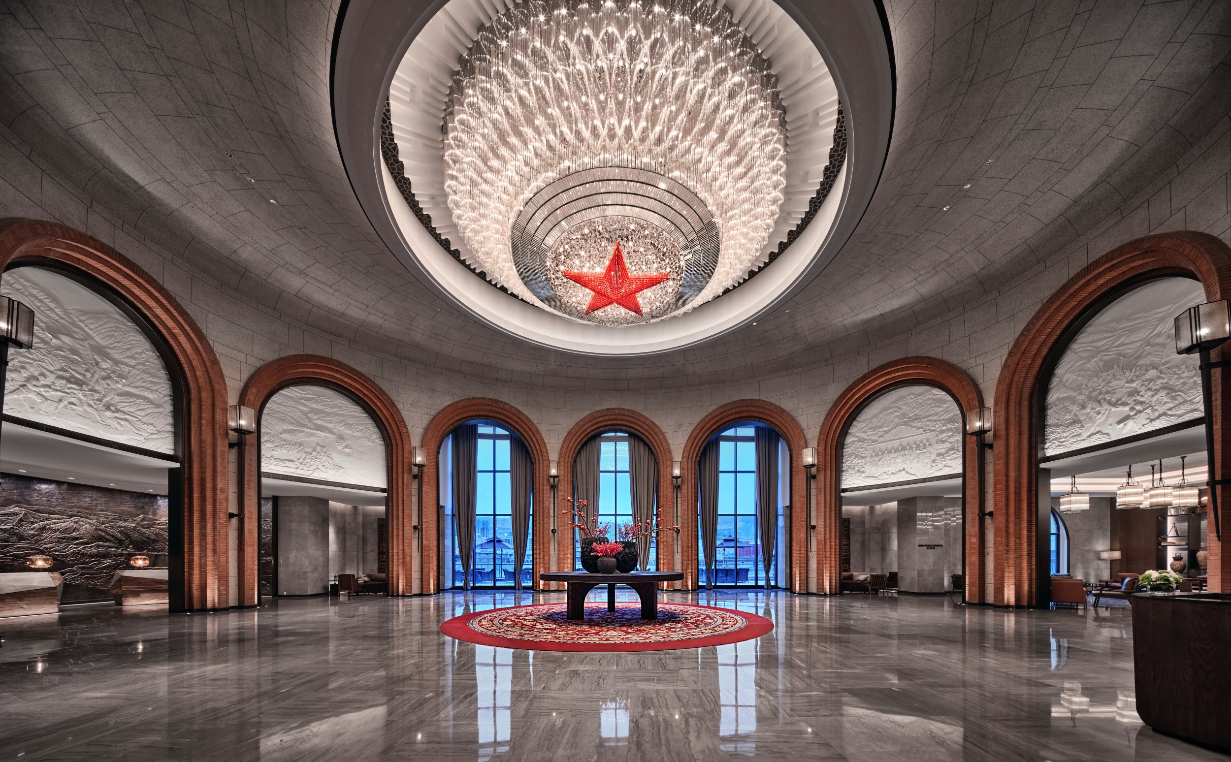 The entire lobby is modeled after the arch-shaped cave. The five arches support the whole space, extending the space upward, and rendering a majestic outlook. The peak of the arch catches the most attention. The crystal lamps are combined to form a wave, which surround the center of a red star and light up the entire lobby. The lobby carries the concept that a single spark can start a prairie fire. The colors decorating the space are derived from the adobes of the cave, evoking people’s memory of historic events. The main background of the lobby is a huge bronze sculpture depicting Baota Mountain, mapping the idea that we will continue to break the ground and long live the revolutionary spirit.
