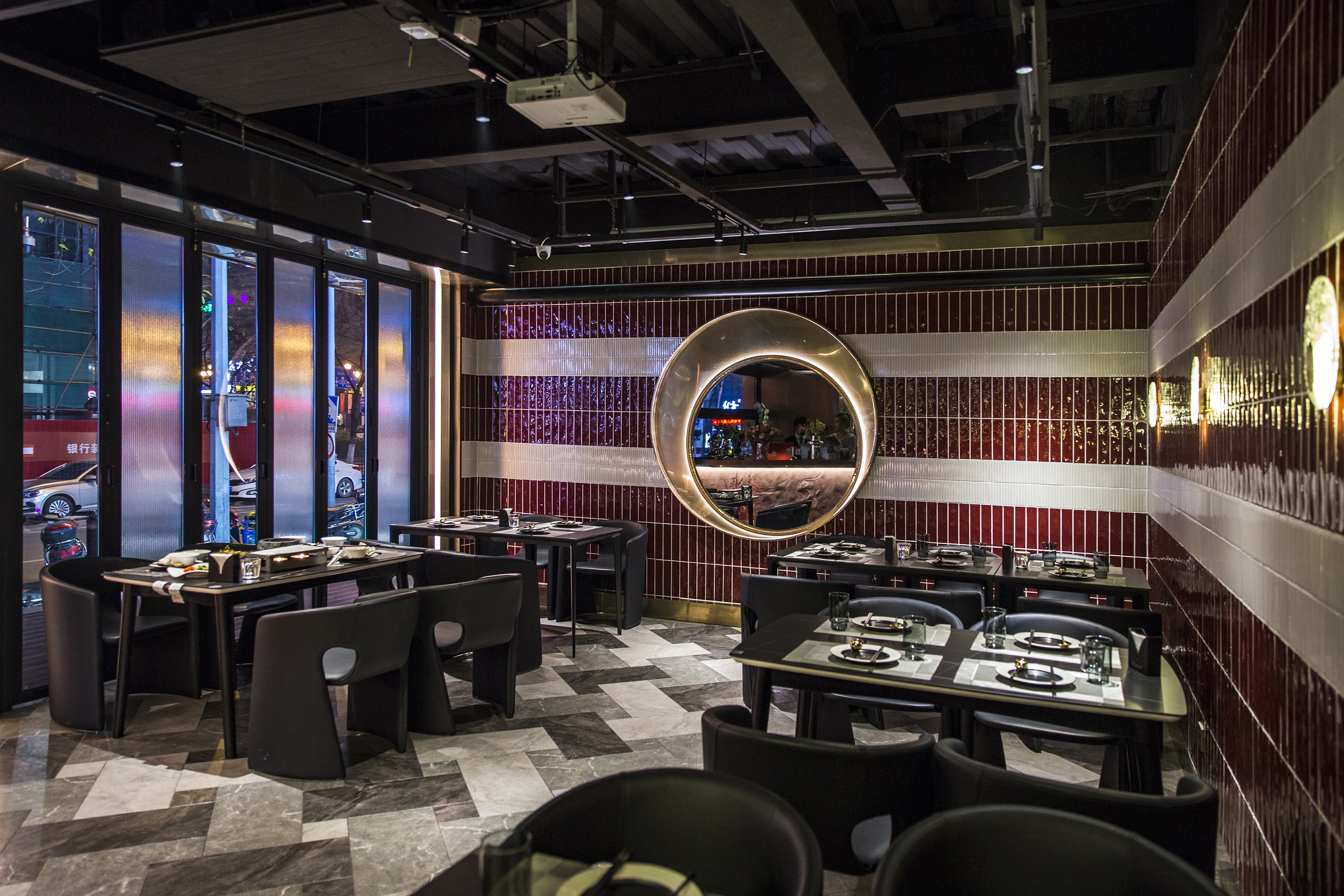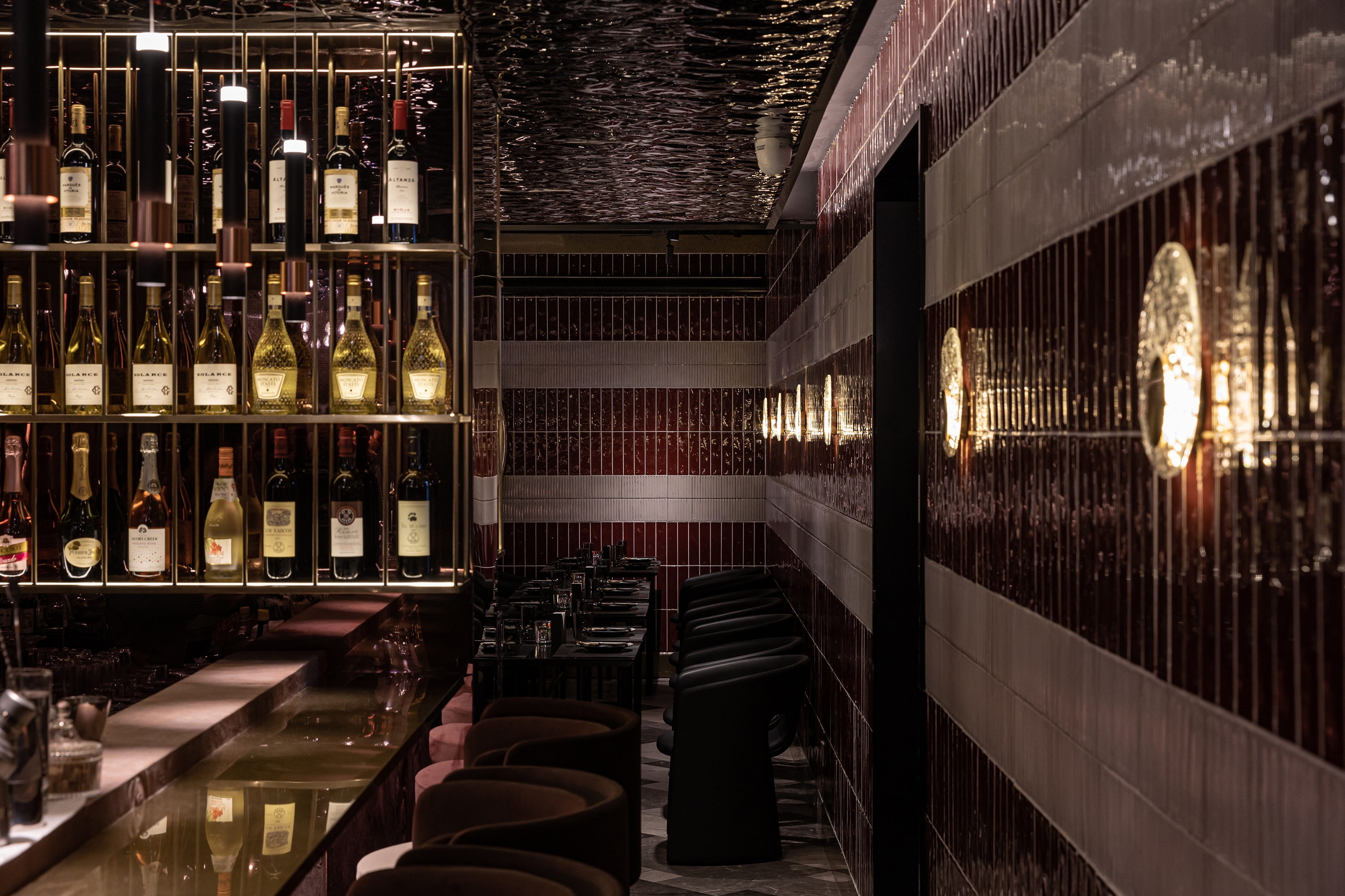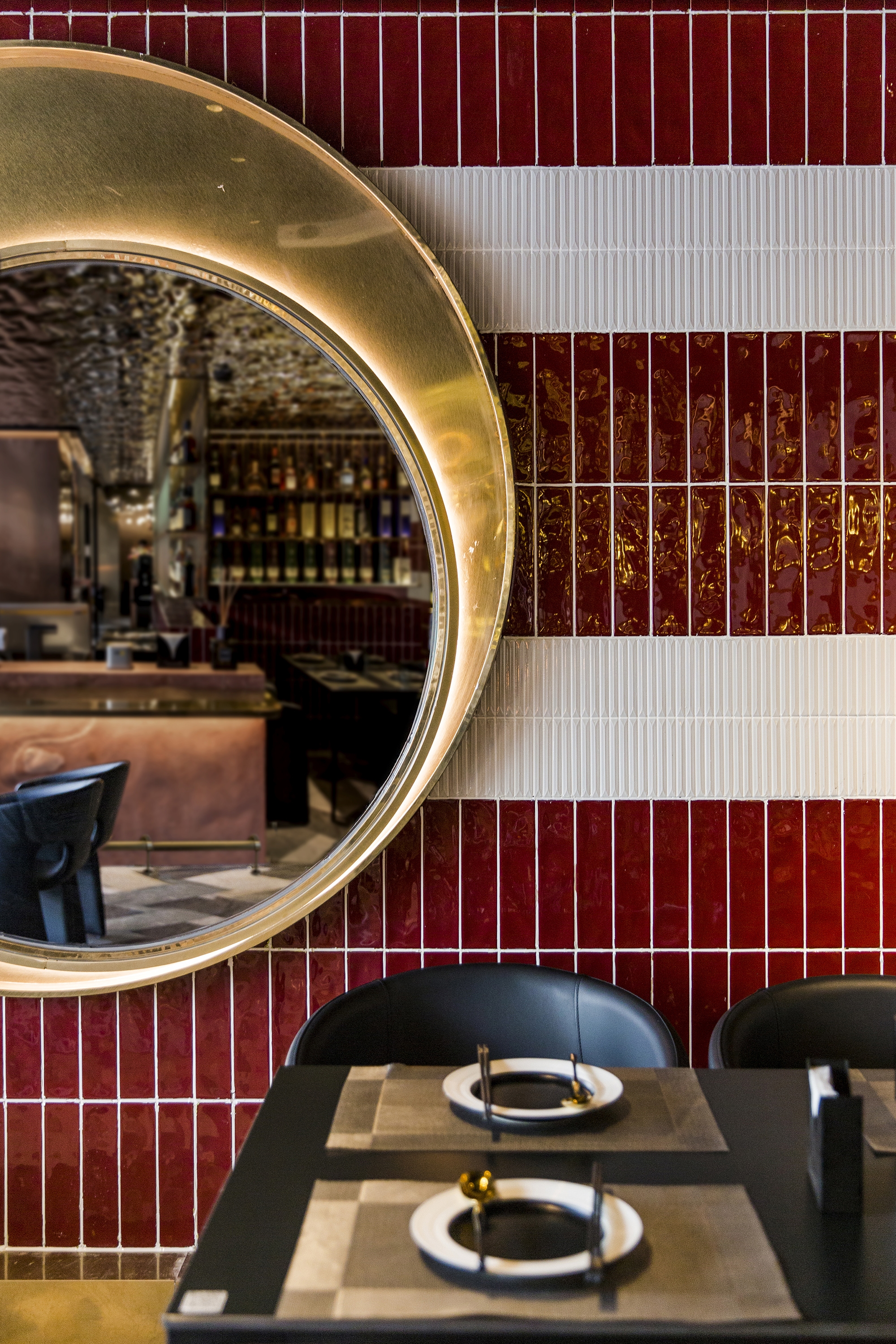 The inverted shimmering cloud above the central bar extends spatially onto both sides, with the burgundy red and beige bands of hand-made tiles that sits on a diagonally placed flanders weave pattern floor tiles, defining the inner rim of the dining and drinking spaces. These spatial orders carried a sense of flow and evolving relationship, while creating a distinctive and, slightly provocative, immersive sensory experience.