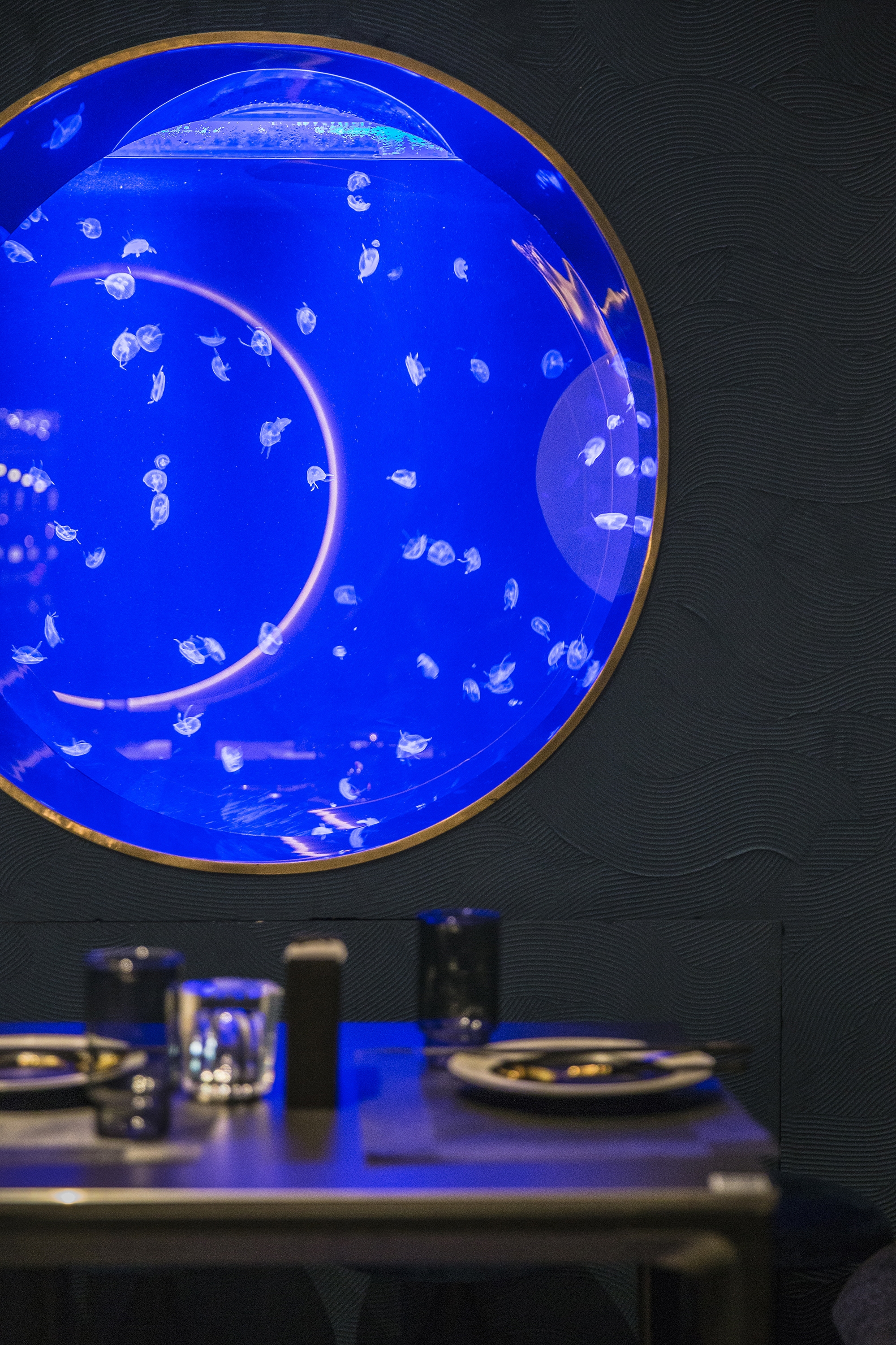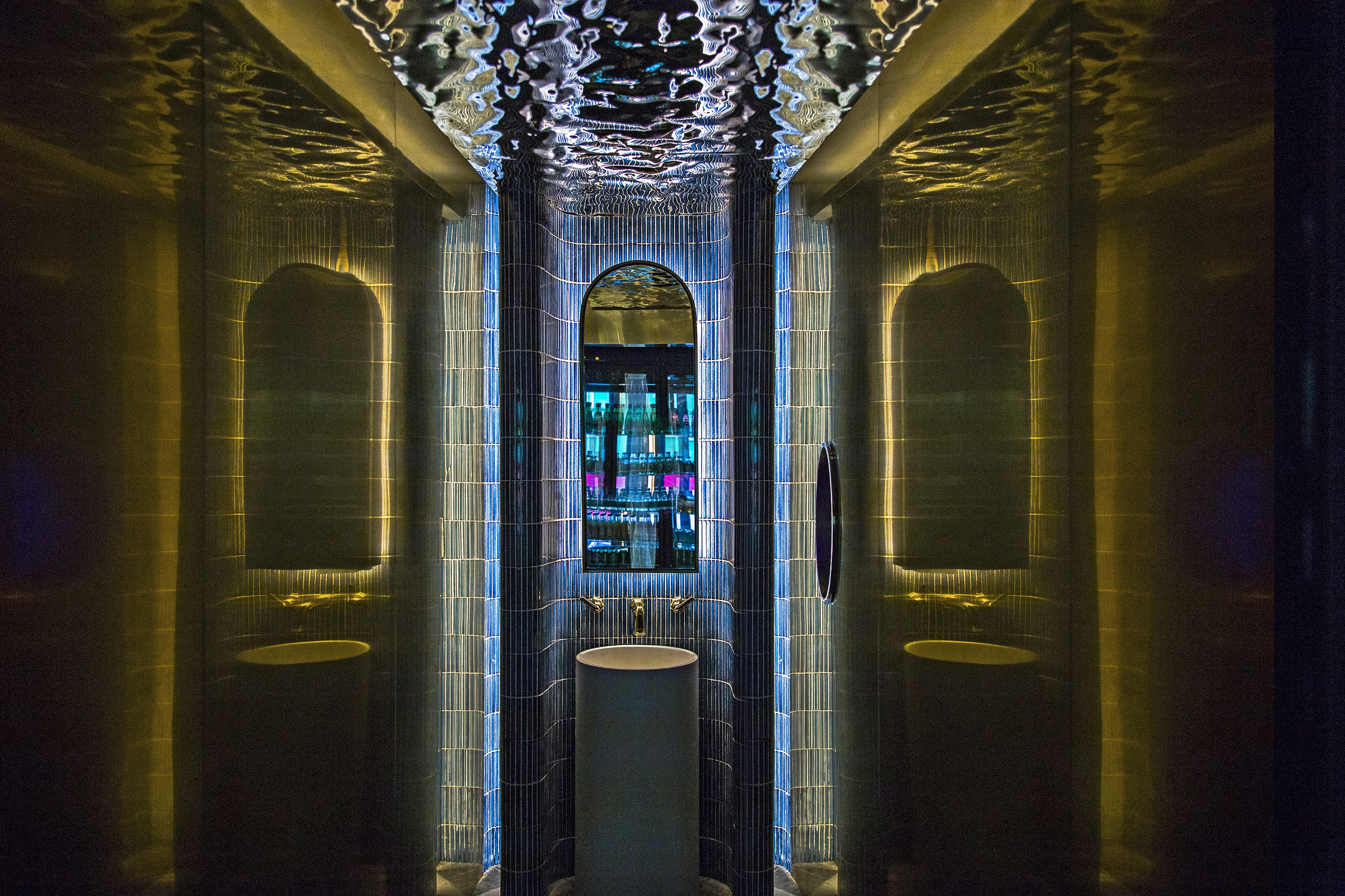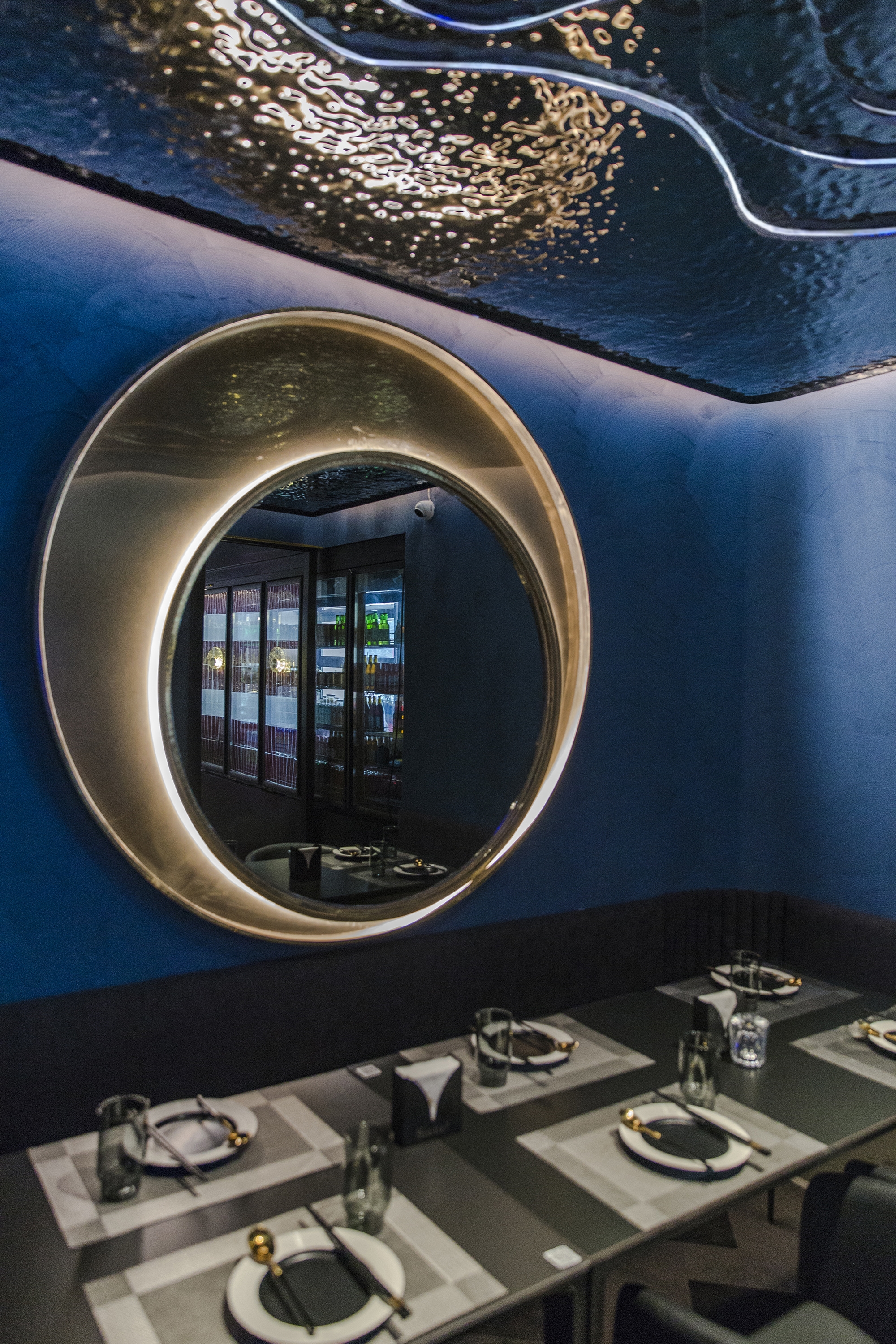 The inverted shimmering cloud above the central bar extends spatially onto both sides, with the burgundy red and beige bands of hand-made tiles that sits on a diagonally placed flanders weave pattern floor tiles, defining the inner rim of the dining and drinking spaces. These spatial orders carried a sense of flow and evolving relationship, while creating a distinctive and, slightly provocative, immersive sensory experience.