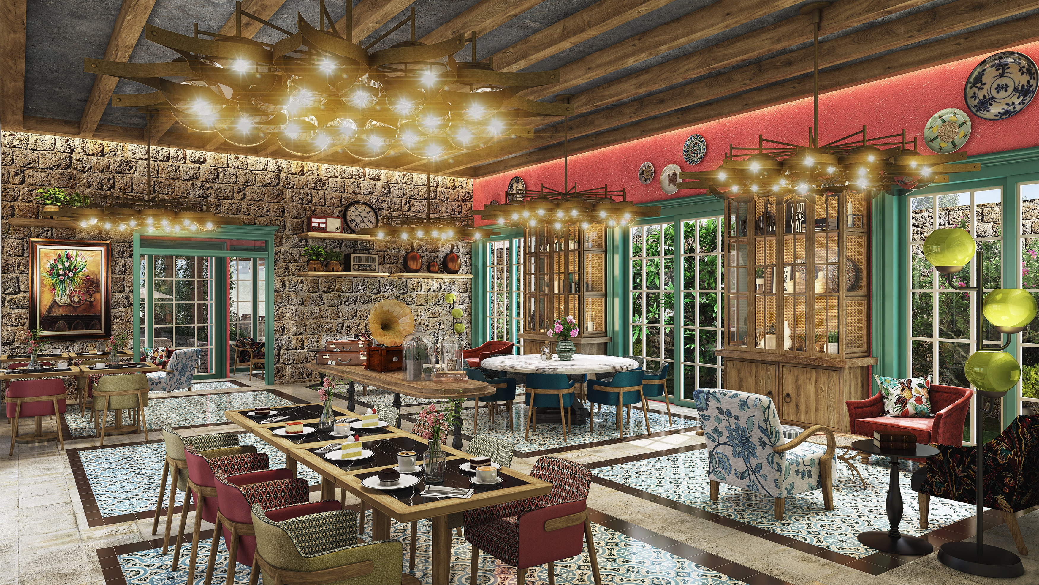 The entire concept is based around the rich culture of Lebanon. We've created separate lounge and dining areas however maintaining a visual connection with architectural apertures following the tradition of Lebanese housing concept.