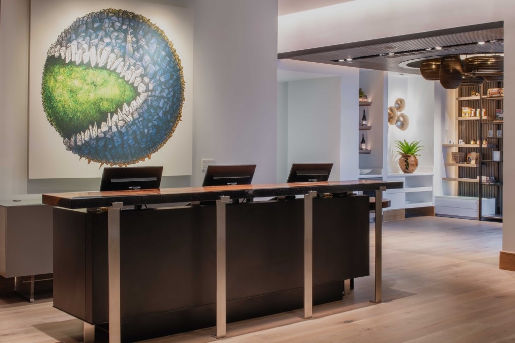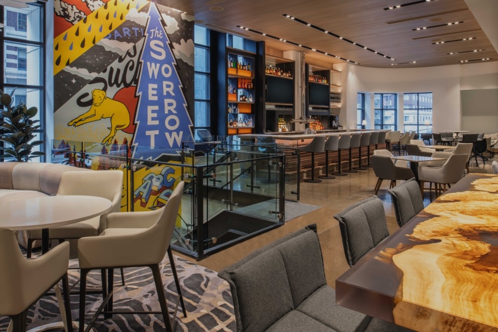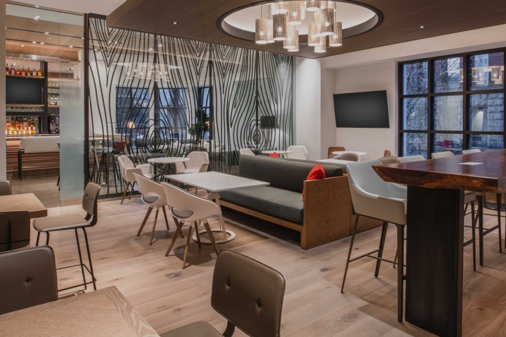 One of the most activist-forward cities in America, Portland Oregon has more venture capitalists per capita making micro-loans to developing countries and sustainability initiatives than anywhere else in the USA. Our vision was to focus on the people of Portland and celebrate a bold progressive city and its global impact on environmental activism. Local artists and their installations explore the struggle for sustainable environmentalism through their art. Vertically sliced slabs of storm-downed Douglas Fir trees line the lobby walls and are lit by artistic alder trees and an overhead sculptural light mobile of thinly sliced veneer. All designed to spread a filtered and organic warm light. An industrial steel staircase leads guests up to the restaurant and bar. All capturing the relaxed attitude of the Pacific Northwest with a fusion of art gallery and a living room.