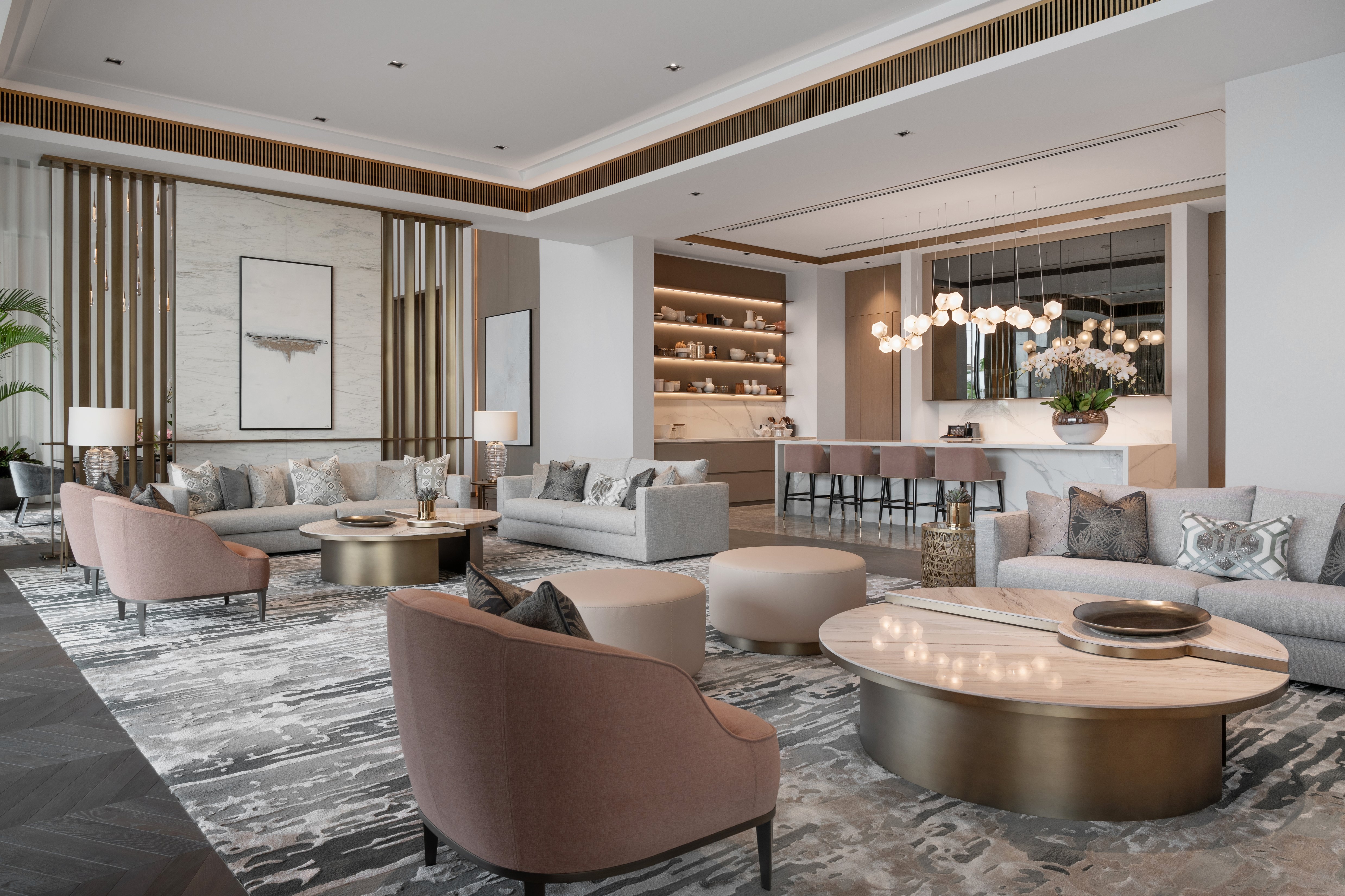 The brief was to transform a vast seven-bedroom villa into a comfortable, sophisticated and feminine home. The client wanted a truly integrated home that was fresh, soft, cosy, and feminine yet kept it quite understated and family orientated. The design team was tasked with ensuring the various rooms had their own identity and flowed seamlessly from space to space. The designers created separation between the main family living areas and the more formal areas such as the majlis, formal dining room, and study; this dictated the overall flow and layout of the villa.