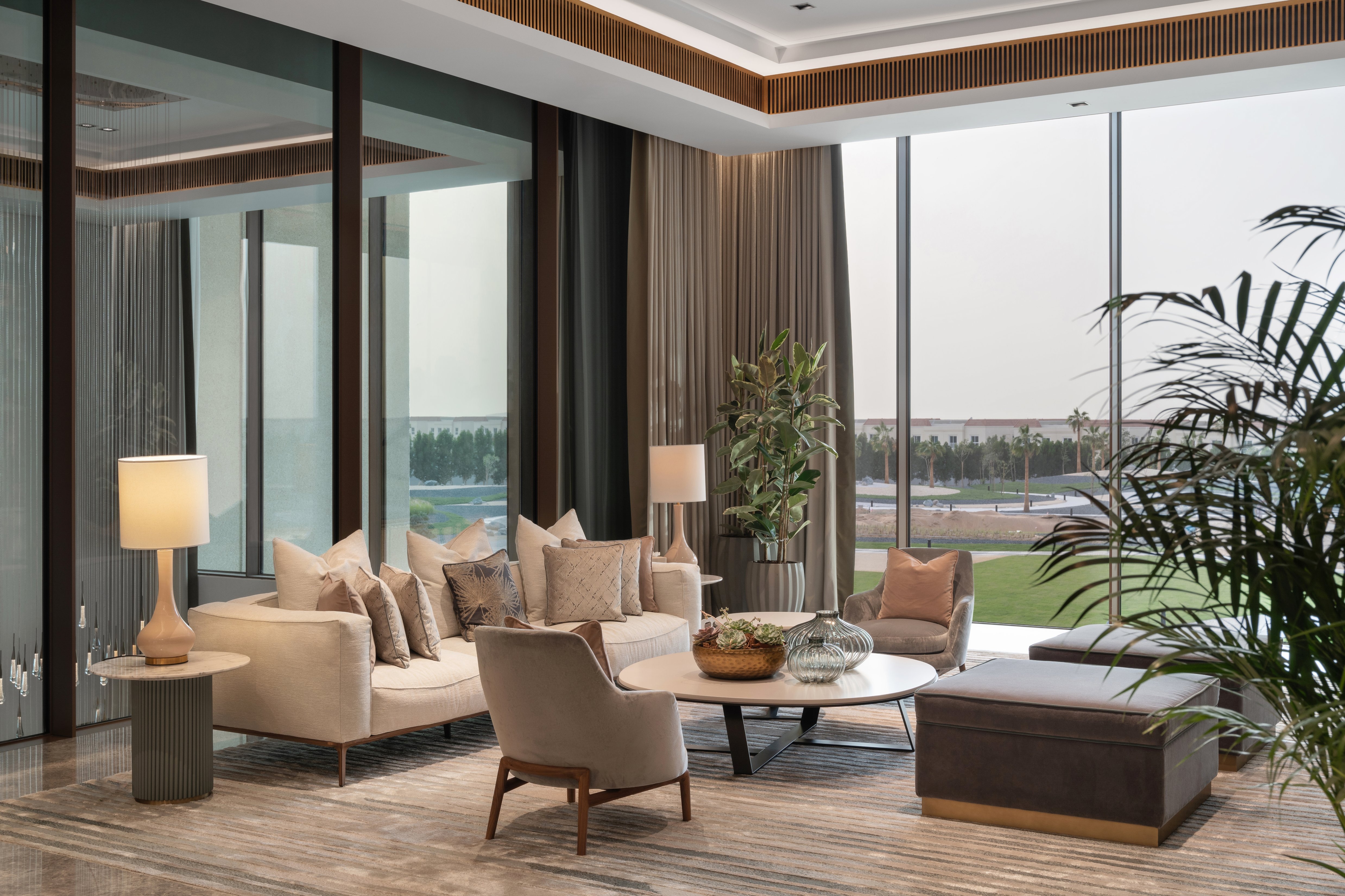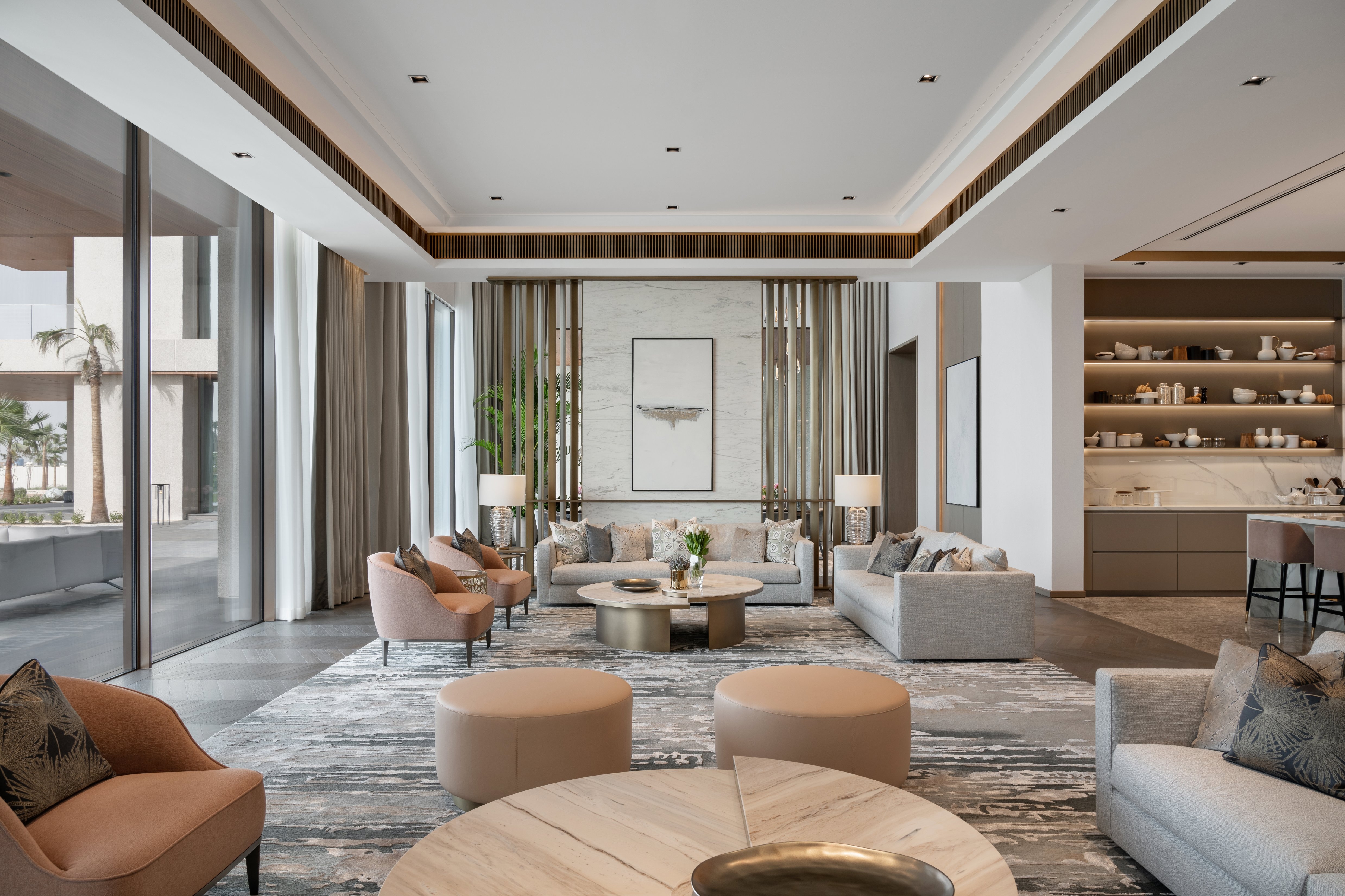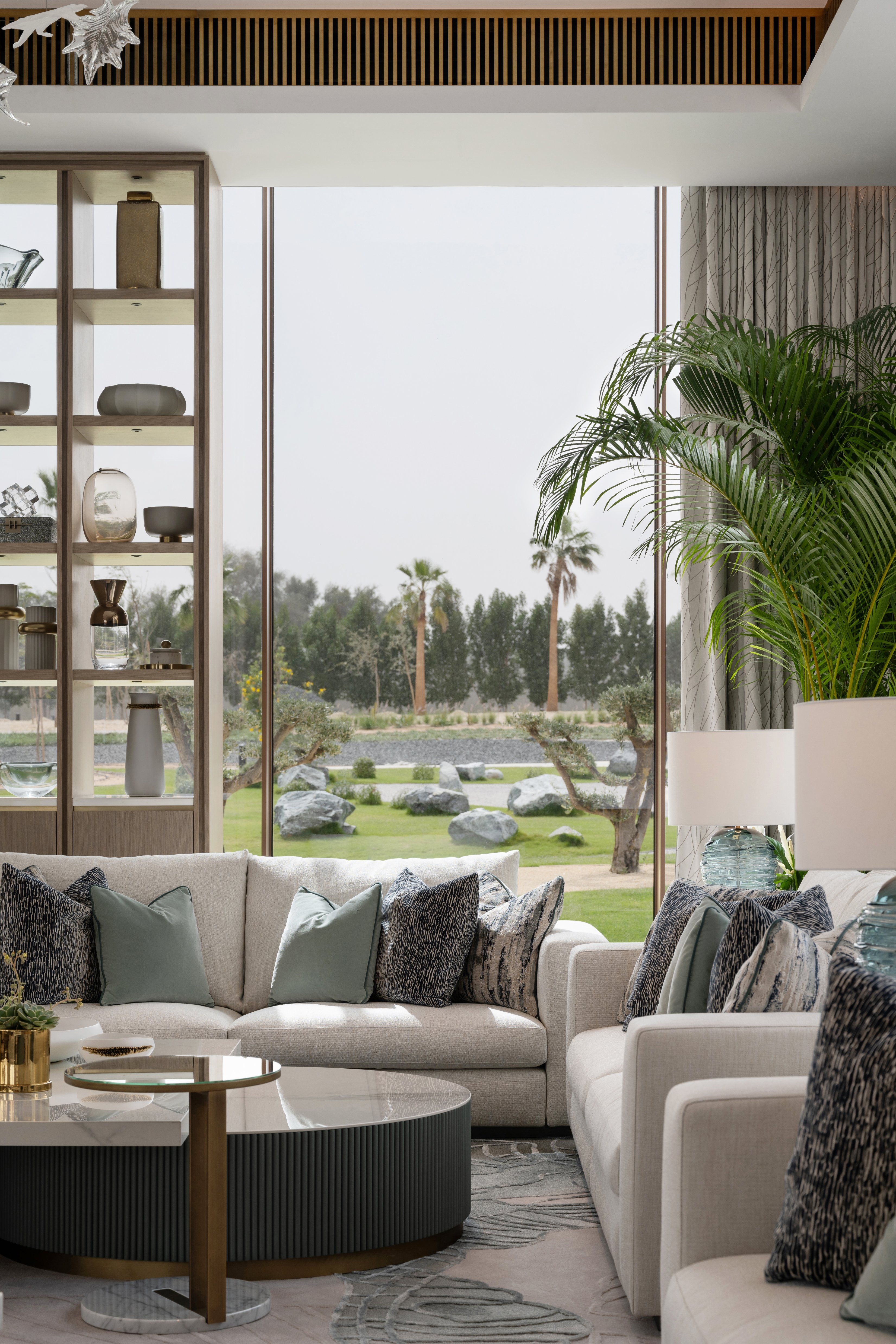 Its soft, light and inviting scheme with neutral colours, warm timbers, and soft grey marble mixed with subtle accent colours contributed to create the ultimate retreat. The spaces were designed to link and connect to the vast landscape. In particular, the majlis and formal dining feel like contemporary garden rooms as you are surrounded by full-height glazing with immaculate landscaping beyond. This connection to the outdoors also continues throughout the inside, with large plants placed in the corners of the rooms and some ground floor areas open onto the terrace giving an indoor-outdoor experience.