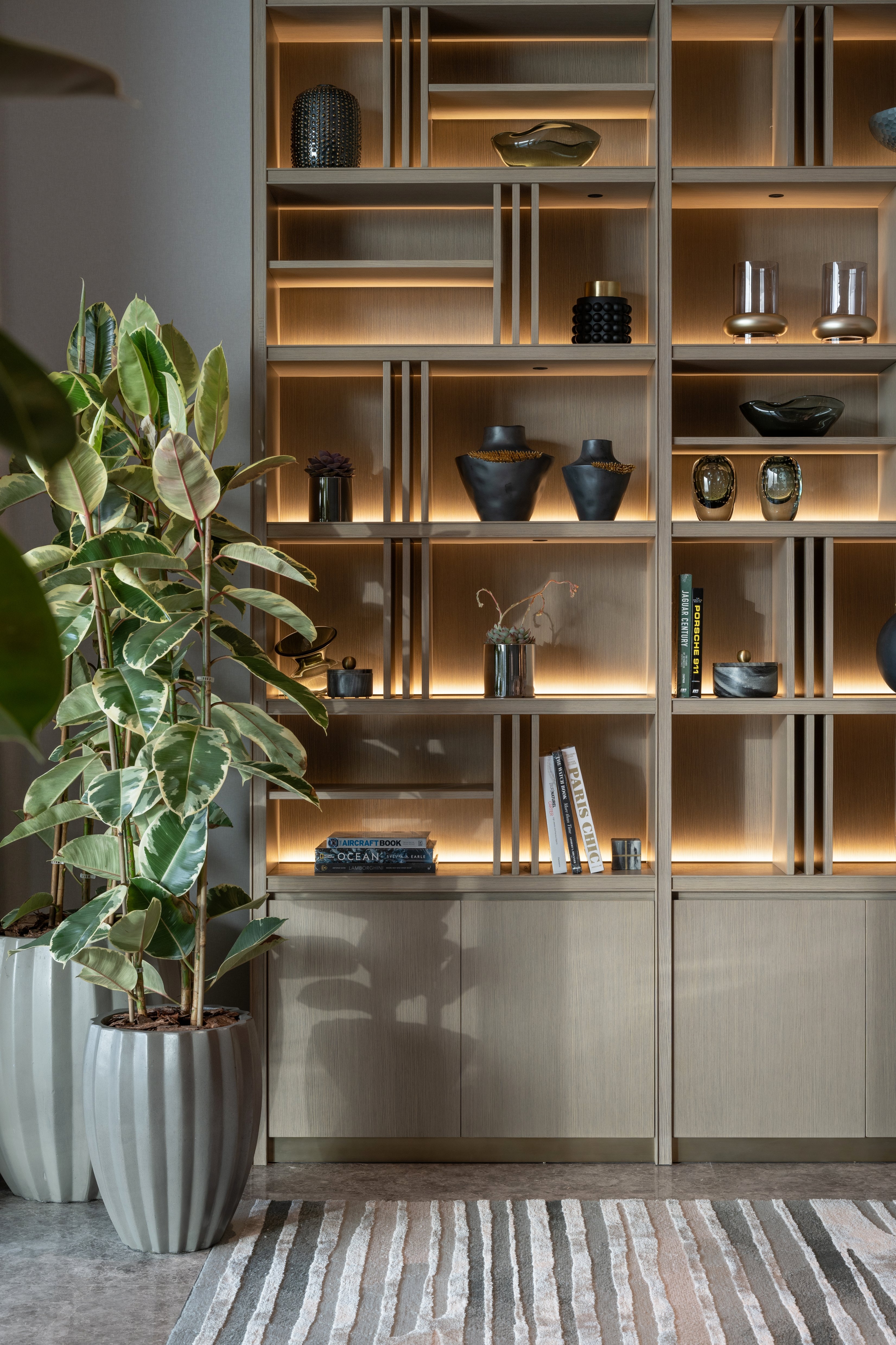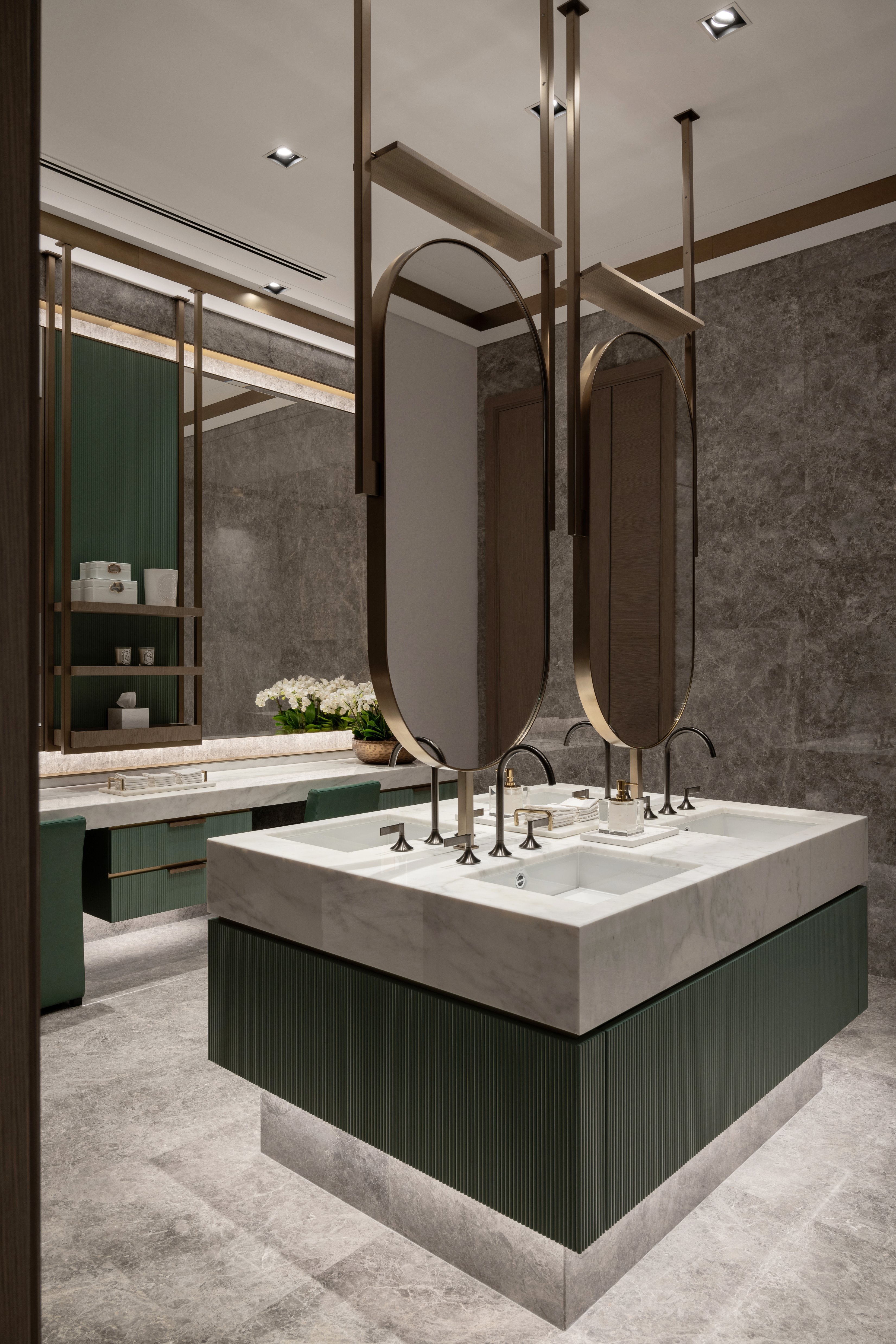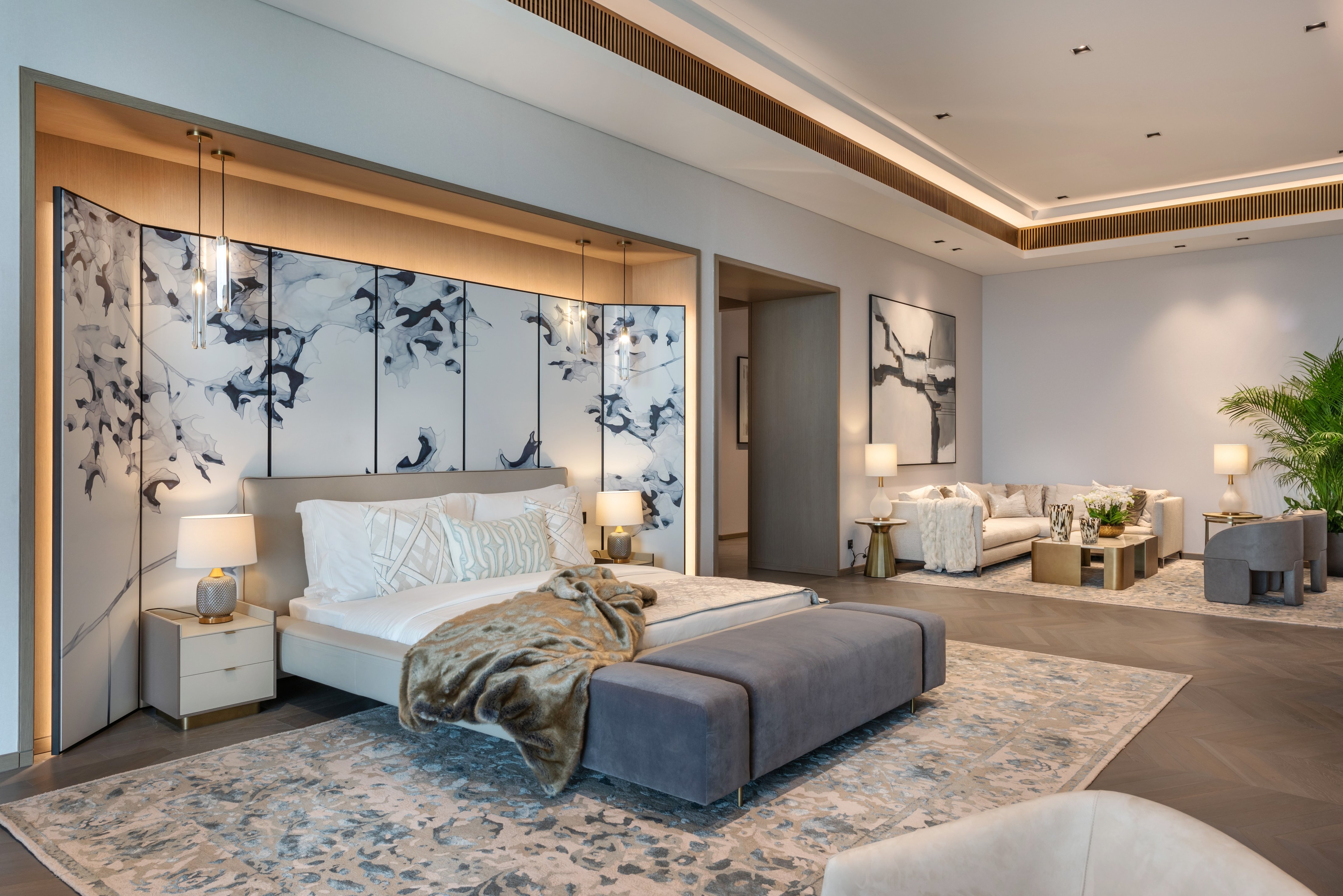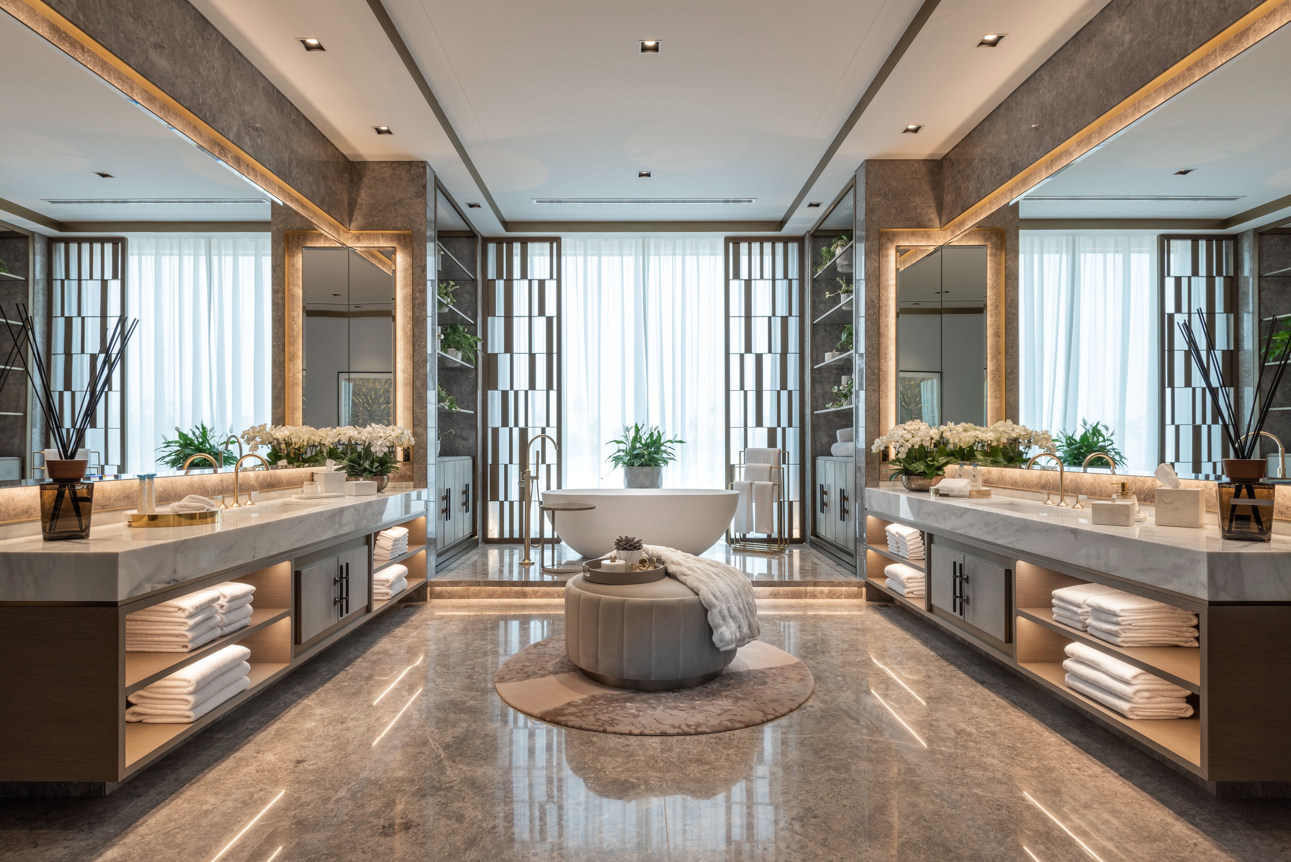 Its soft, light and inviting scheme with neutral colours, warm timbers, and soft grey marble mixed with subtle accent colours contributed to create the ultimate retreat. The spaces were designed to link and connect to the vast landscape. In particular, the majlis and formal dining feel like contemporary garden rooms as you are surrounded by full-height glazing with immaculate landscaping beyond. This connection to the outdoors also continues throughout the inside, with large plants placed in the corners of the rooms and some ground floor areas open onto the terrace giving an indoor-outdoor experience.