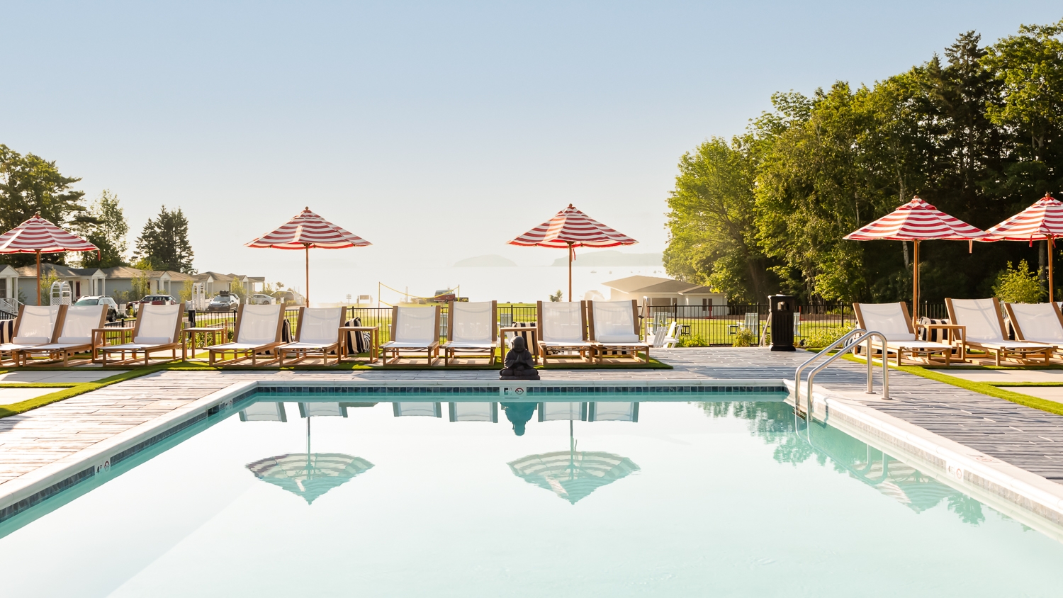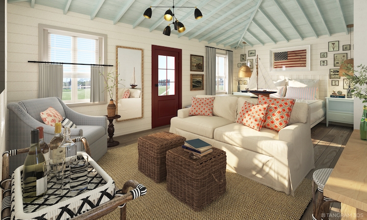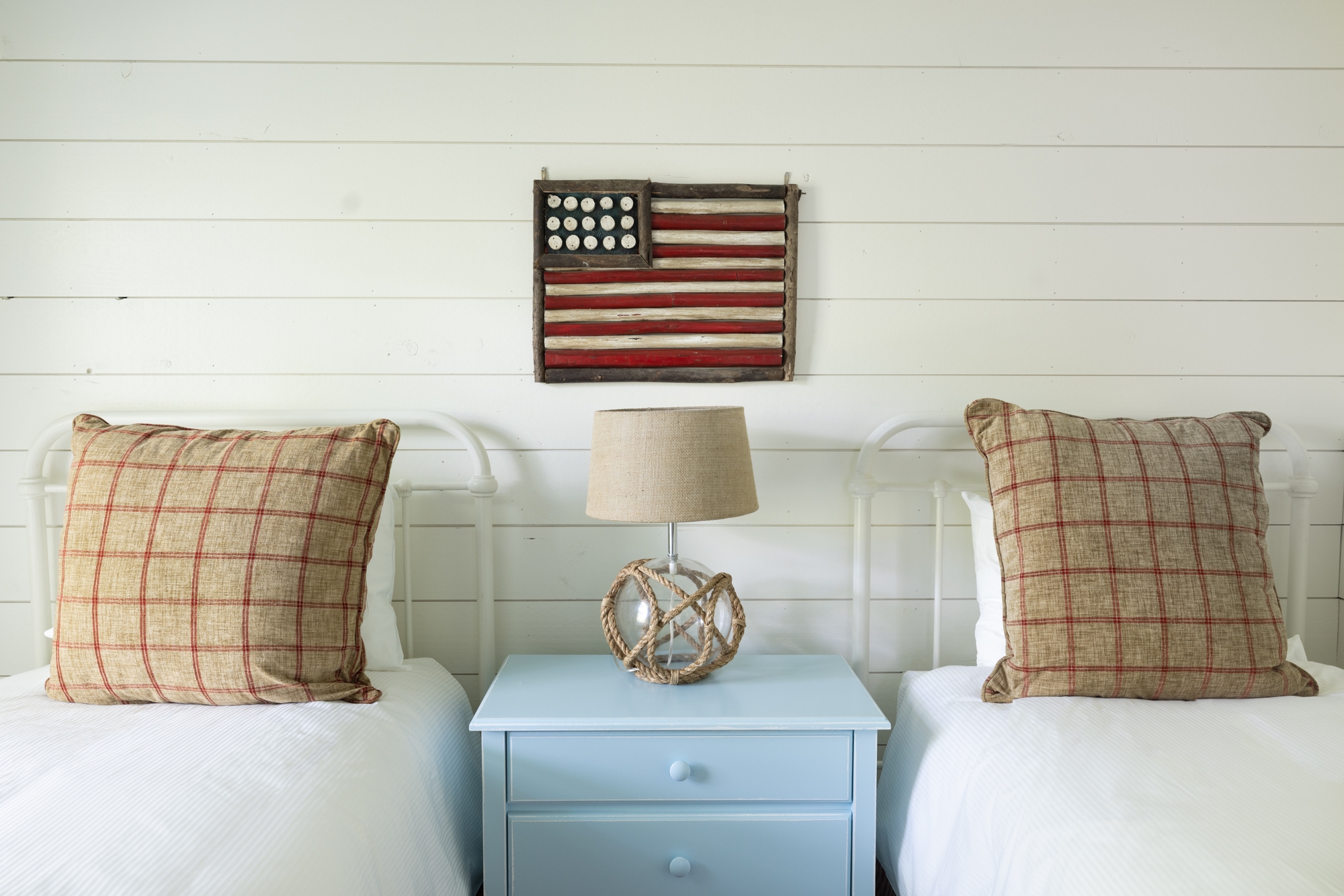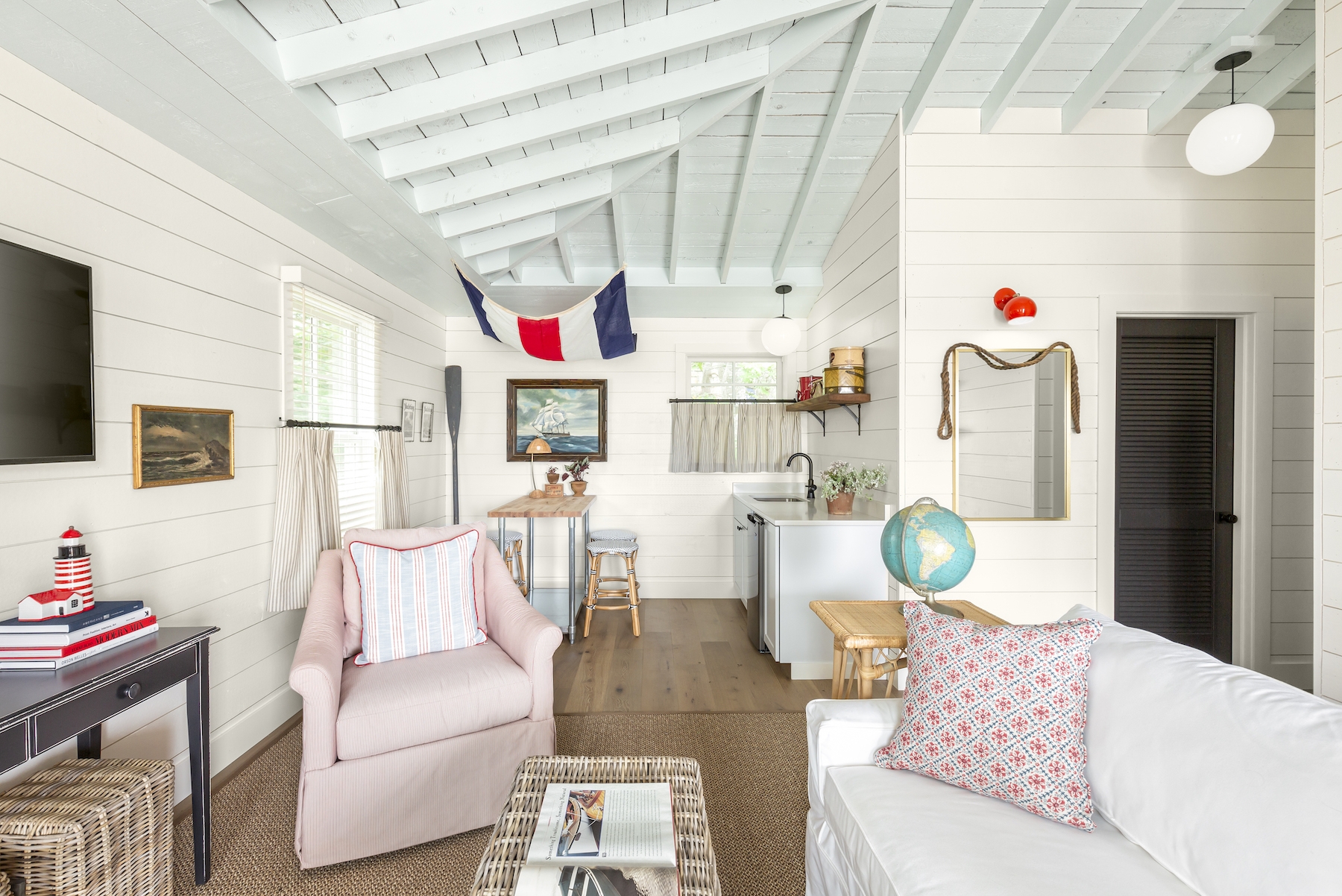 Our design vision for this property overlooking an idyllic bay in Maine was airy, bright, and cheerful retreats that pay tribute to the area’s seafaring history. White Shiplap walls create a clean, inviting space while showcasing the vintage art and nautical accents (including carefully curated ropes, buoys, and boat hardware sourced throughout New England over the past year) adorning them. To contrast the white walls, we added pops of cheery colors throughout, including Benjamin Moore Sky Blue ceilings, and selected sandy-colored Du Chateau flooring with rattan area rugs, bamboo window shades, wicker chairs, and pleated café curtains in classic ticking fabric. Maine Woodworks, a local artisan, created the bedside tables we had painted in lively coastal colors. Additional design elements include neon red doors, black interior hardware, and light fixtures from Sazerac Stitches and Schoolhouse Electric. The result of our efforts is “classic Maine cottage” meets “nostalgic nautical” with plenty of Americana details and coastal style.