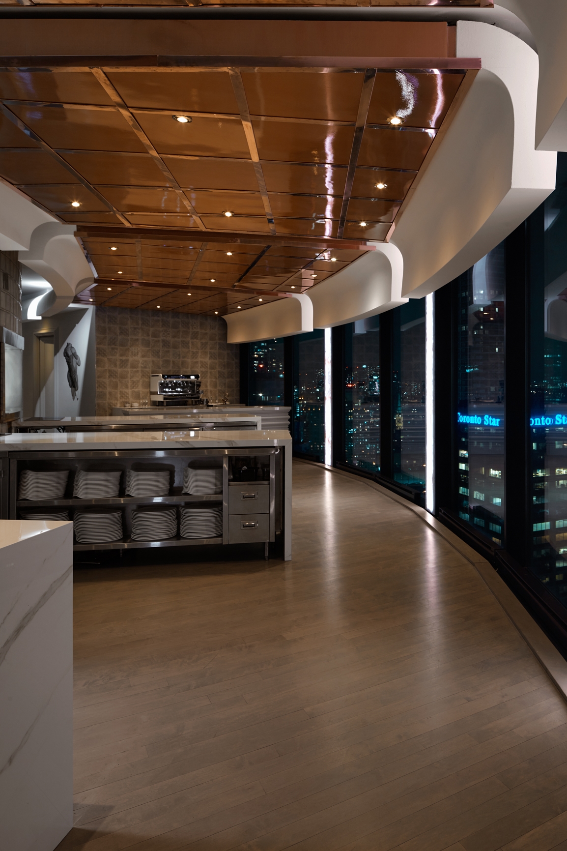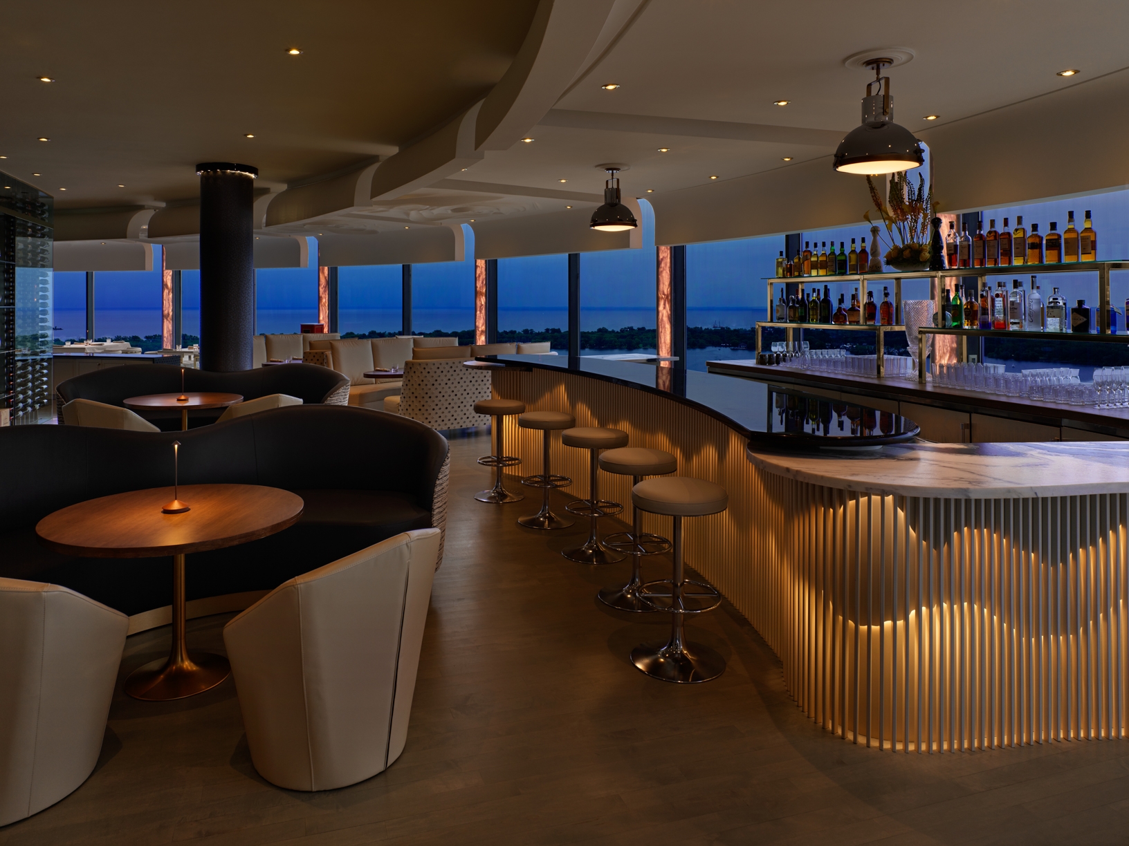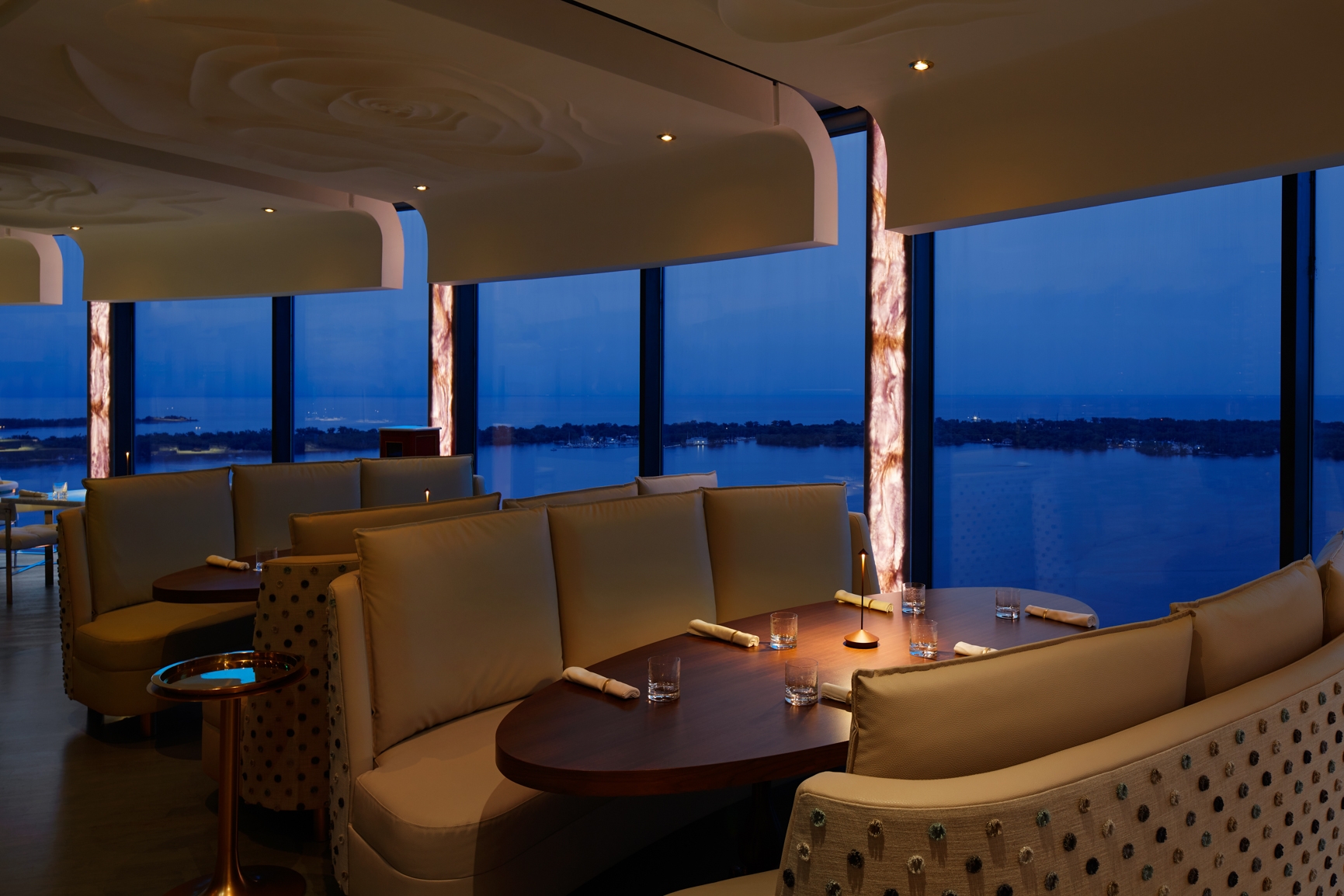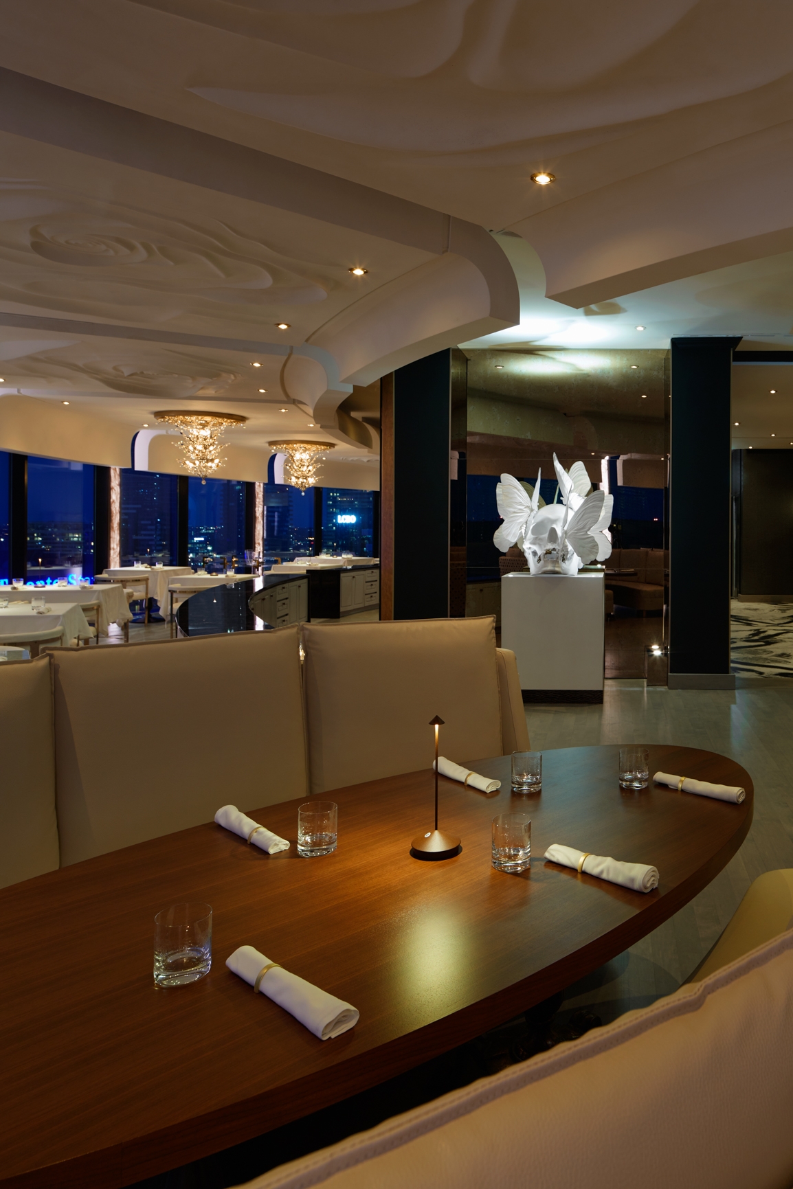 Evoking a sense of high style and chic, the space acts as a canvas for the food it presents; each design detail and piece of furniture has been crafted from the finest materials, many imported directly from Italy. Guests are surrounded by stunning contemporary art and noteworthy pieces including those by Philippe Pasqua, Damien Hirst and Mr. Brainwash, among others; spectacular fresh floral arrangements capture the imagination, while the room’s breathtaking, wrap-around floor to ceiling views are some of the most spectacular in the country.