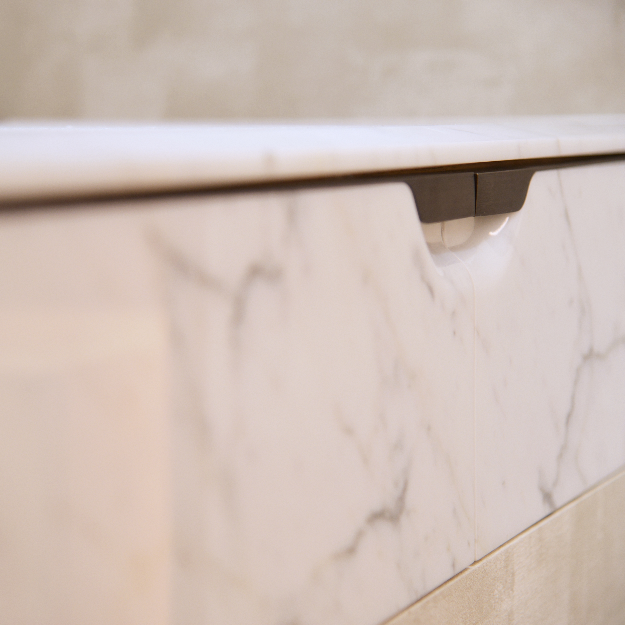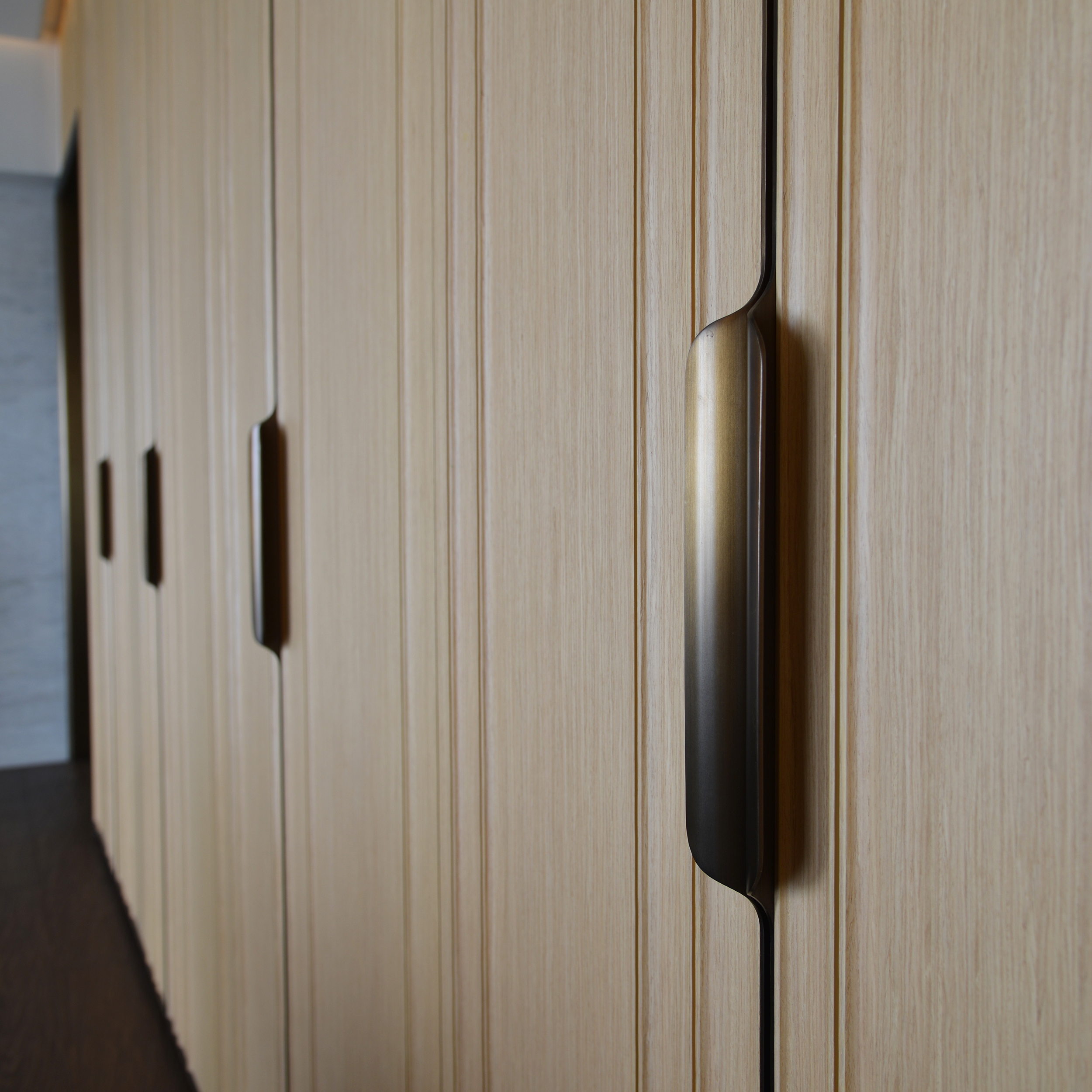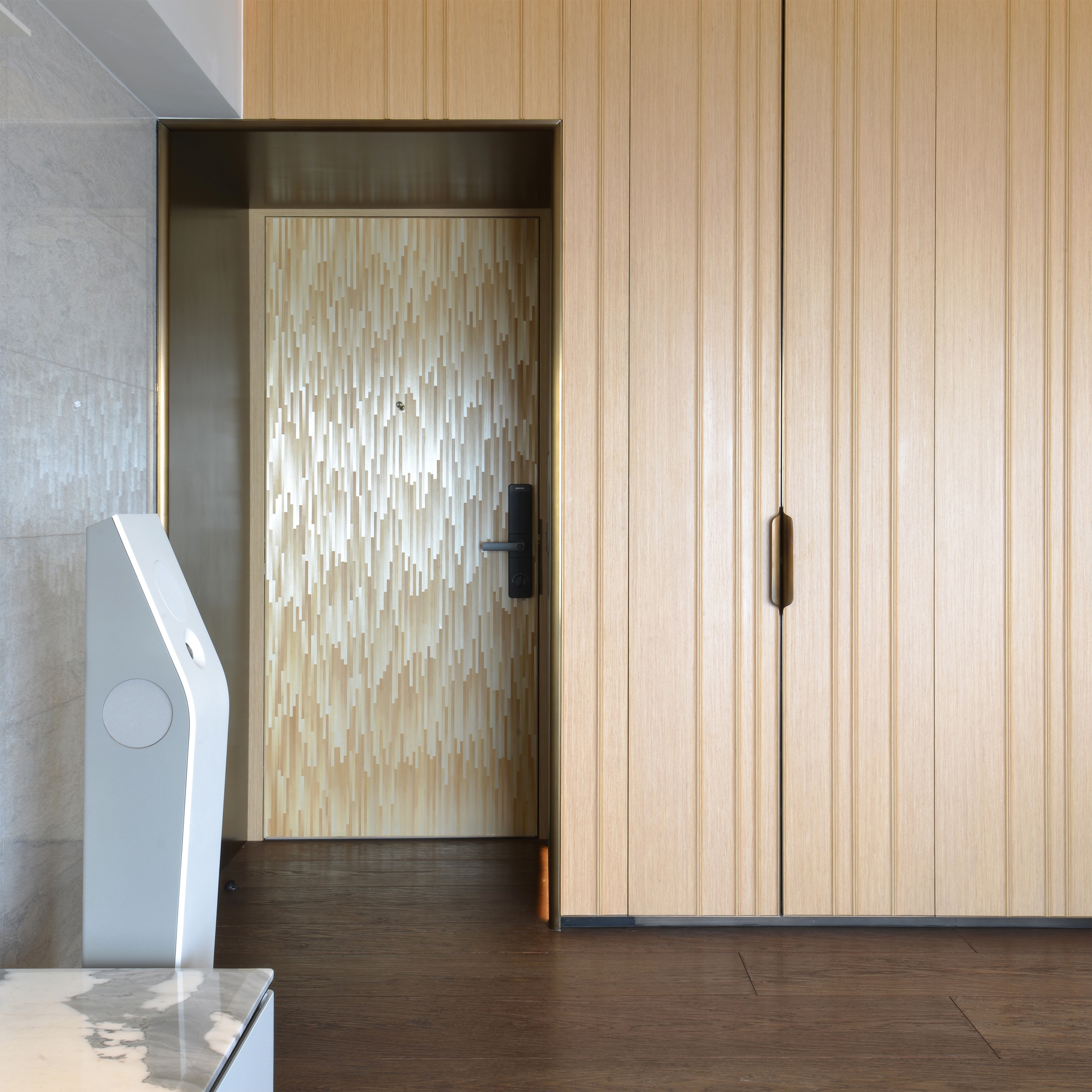 Upon arrival, natural pattern & lively shininess of the straw marquetry door give a gentle greeting with artistic accent. After, Living & Dining are connected by a 3D-crafted timber cabinet wall. The extruded vertical reveals on the doors imitate leather edge craftsmanship. Raw timber planks floor’s natural textures run through the major living space. The grain pattern of the white marbles like abstract paintings which frame the areas from both ends subtly.