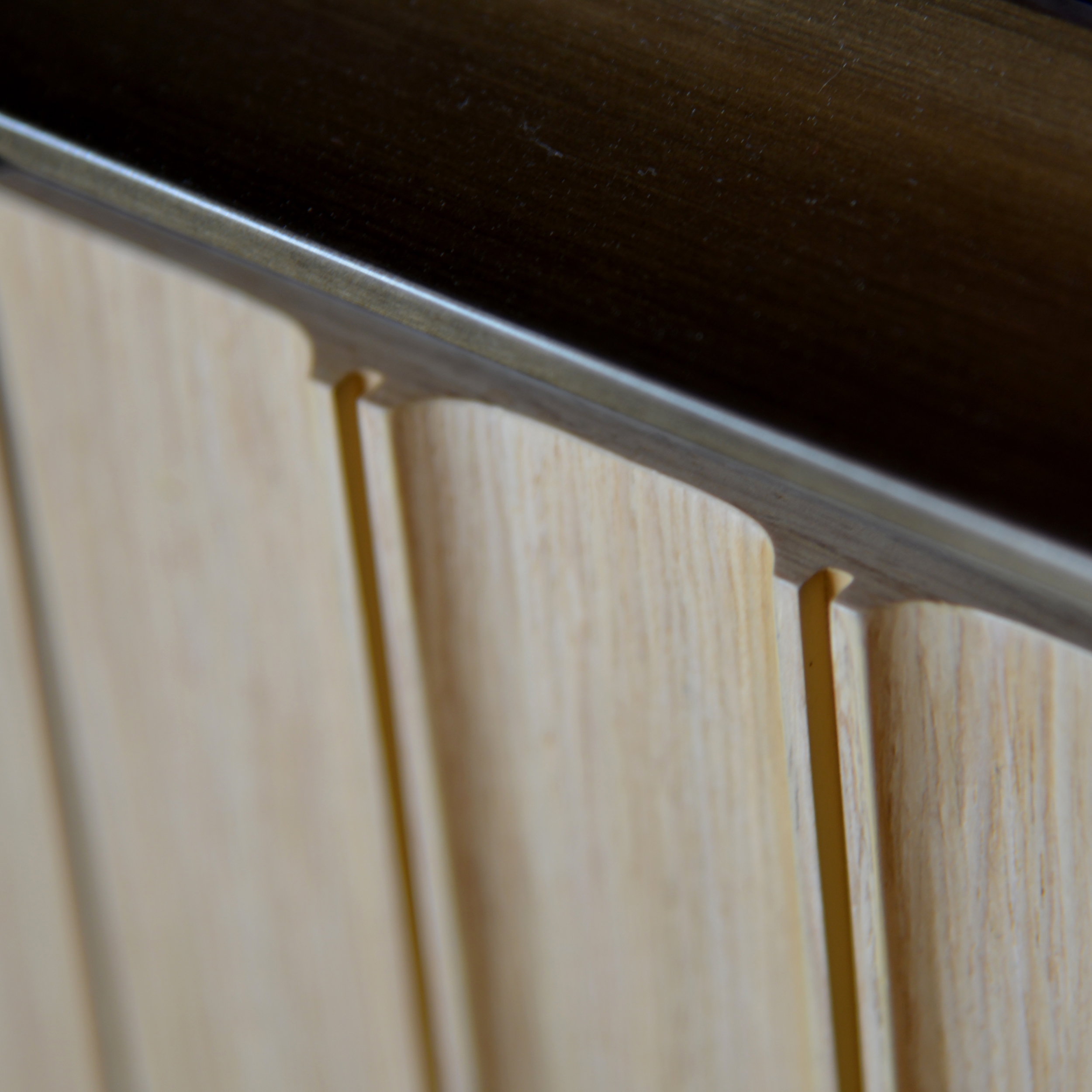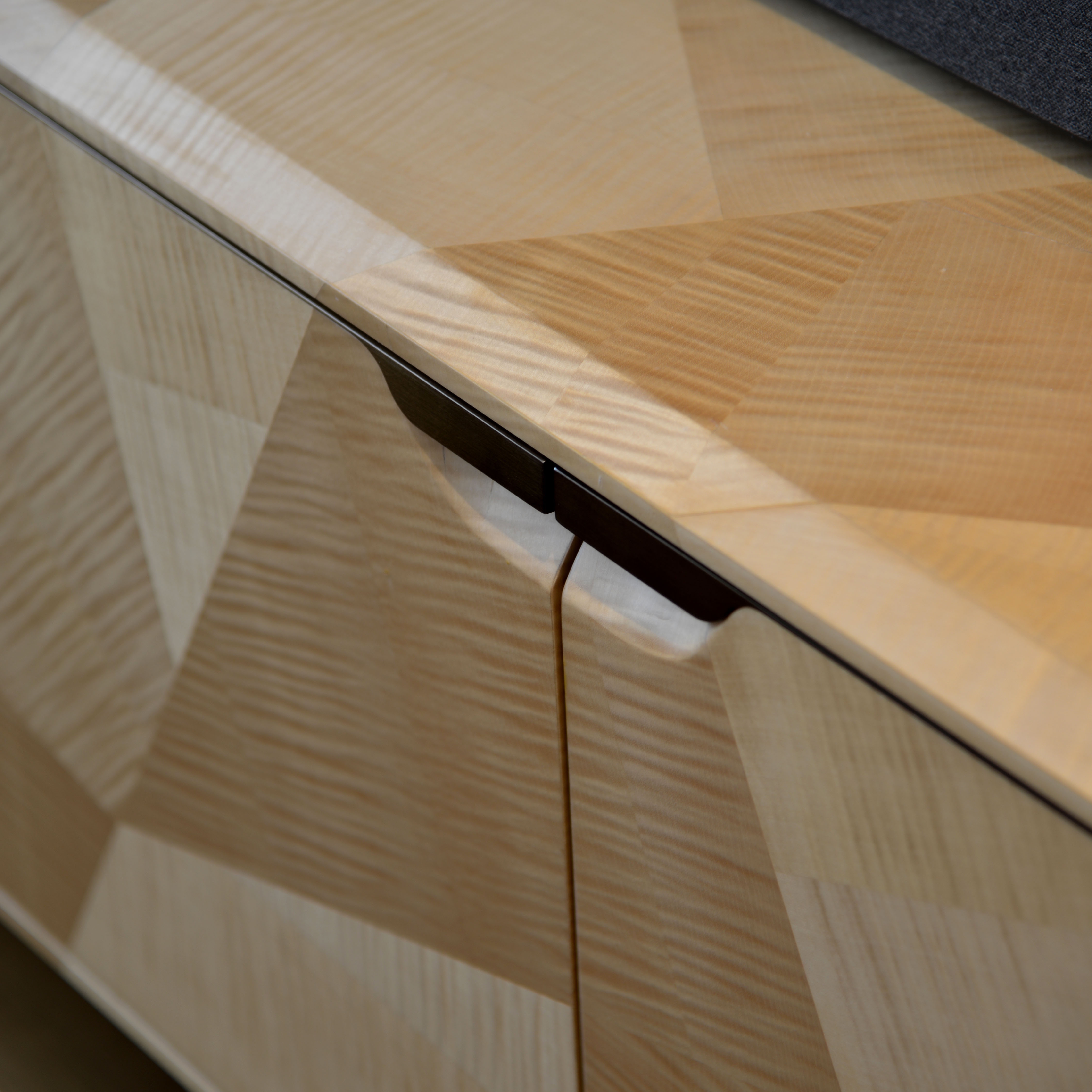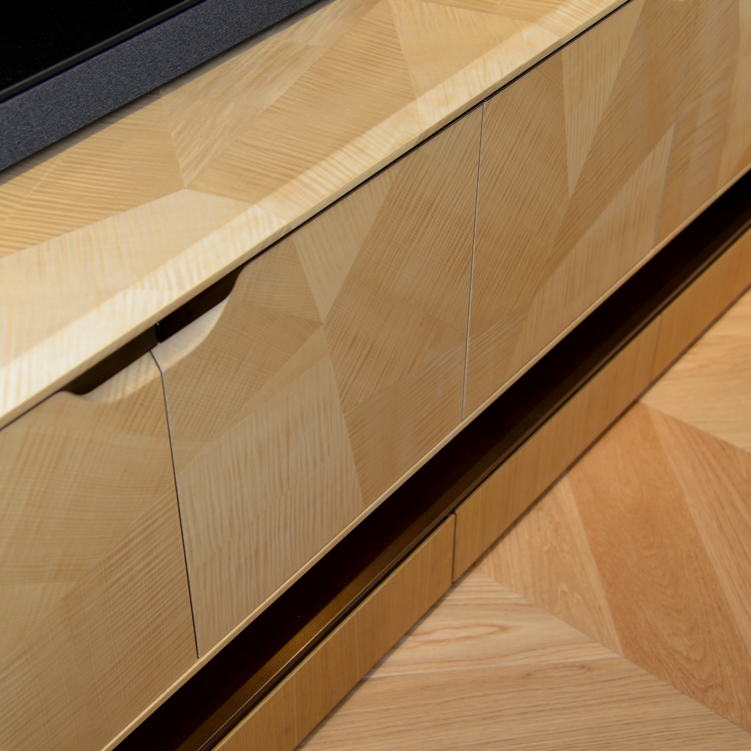 Upon arrival, natural pattern & lively shininess of the straw marquetry door give a gentle greeting with artistic accent. After, Living & Dining are connected by a 3D-crafted timber cabinet wall. The extruded vertical reveals on the doors imitate leather edge craftsmanship. Raw timber planks floor’s natural textures run through the major living space. The grain pattern of the white marbles like abstract paintings which frame the areas from both ends subtly.