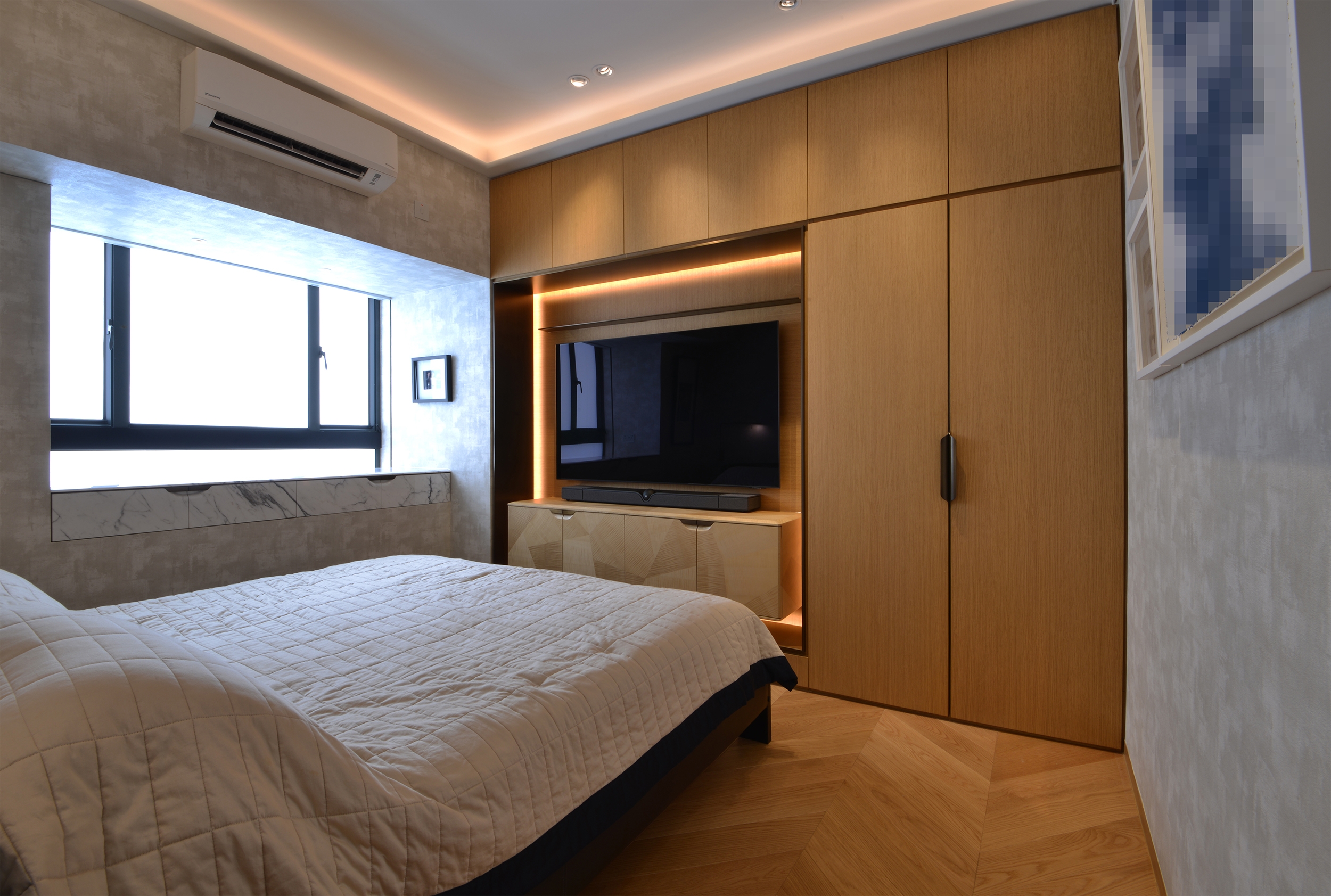 Bedroom area is enhanced to more sophisticated level. Stucco wallpaper sets the gentle brightness. Floating cabinet in tiger maple shines with unique stripes character. Its polygon shape veneers are arranged randomly like an art jewelry box. The white marble drawer works together with its natural grains, which abstract strokes is like a painting. Extending this artistic accent to bathroom, the marble walls, double round mirrors, sculptural form basin, waterfall taps, & open style layout elevate the experience to spa of indulgence & tranquility.