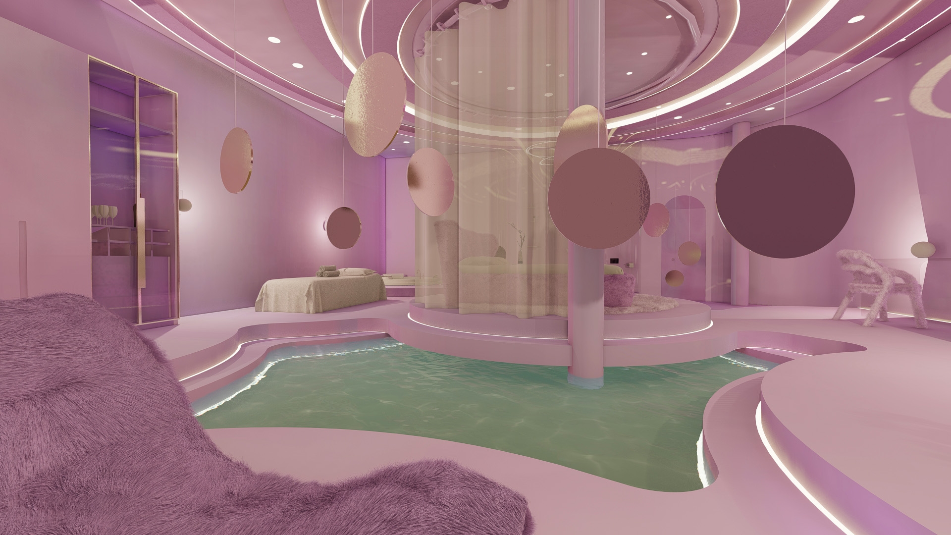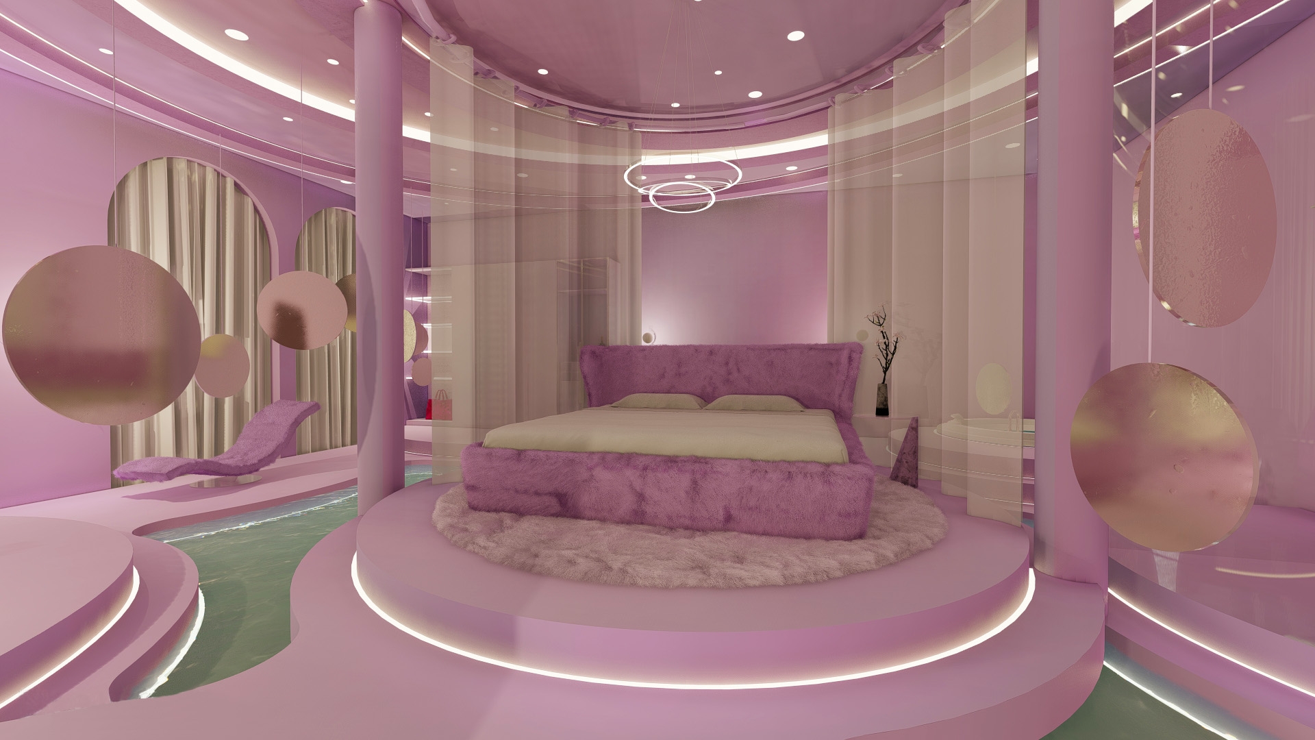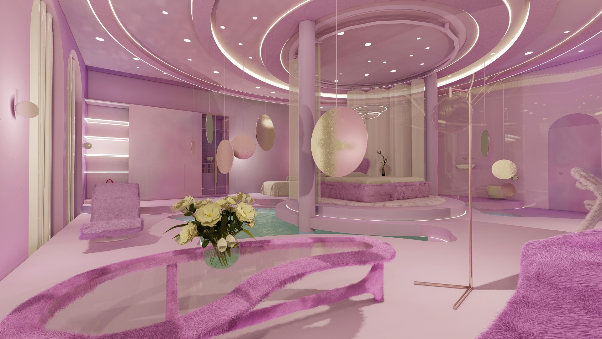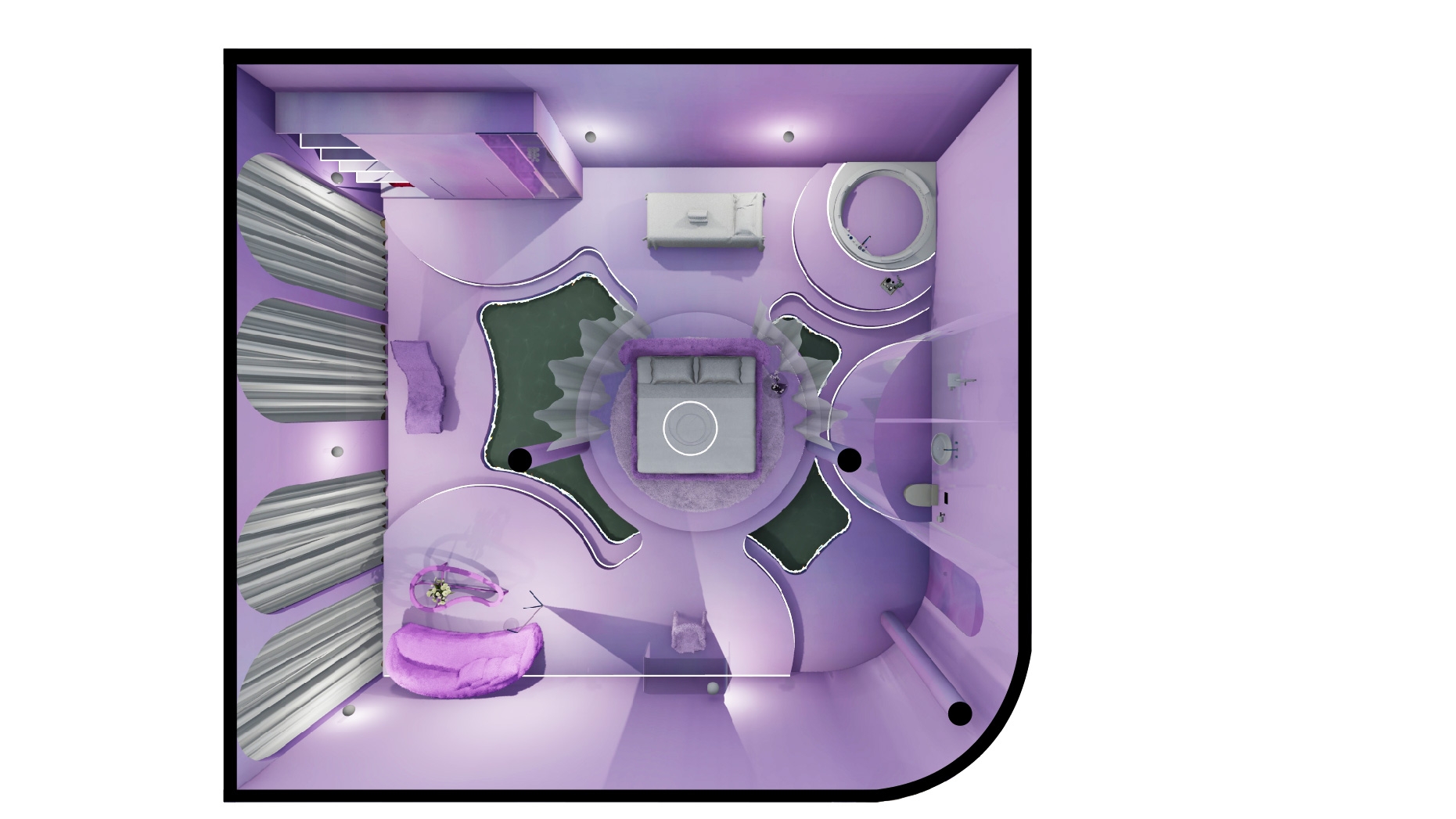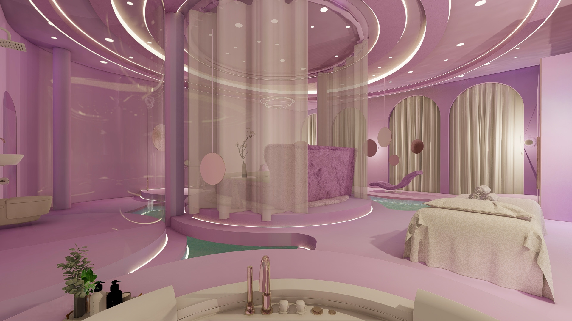 My design concept is to create a monochromatic dreamy space where couples can reconnect and learn more about each other. Light purples are associated with light-hearted and romantic energies. The circular shapes in the room were intentionally designed as a subtle nod to their unity as a couple- as circles symbolize eternity. Water in the room is an element of relaxation and rebirth- the sight and sound of water naturally increase feelings of well-being and decreases depression.