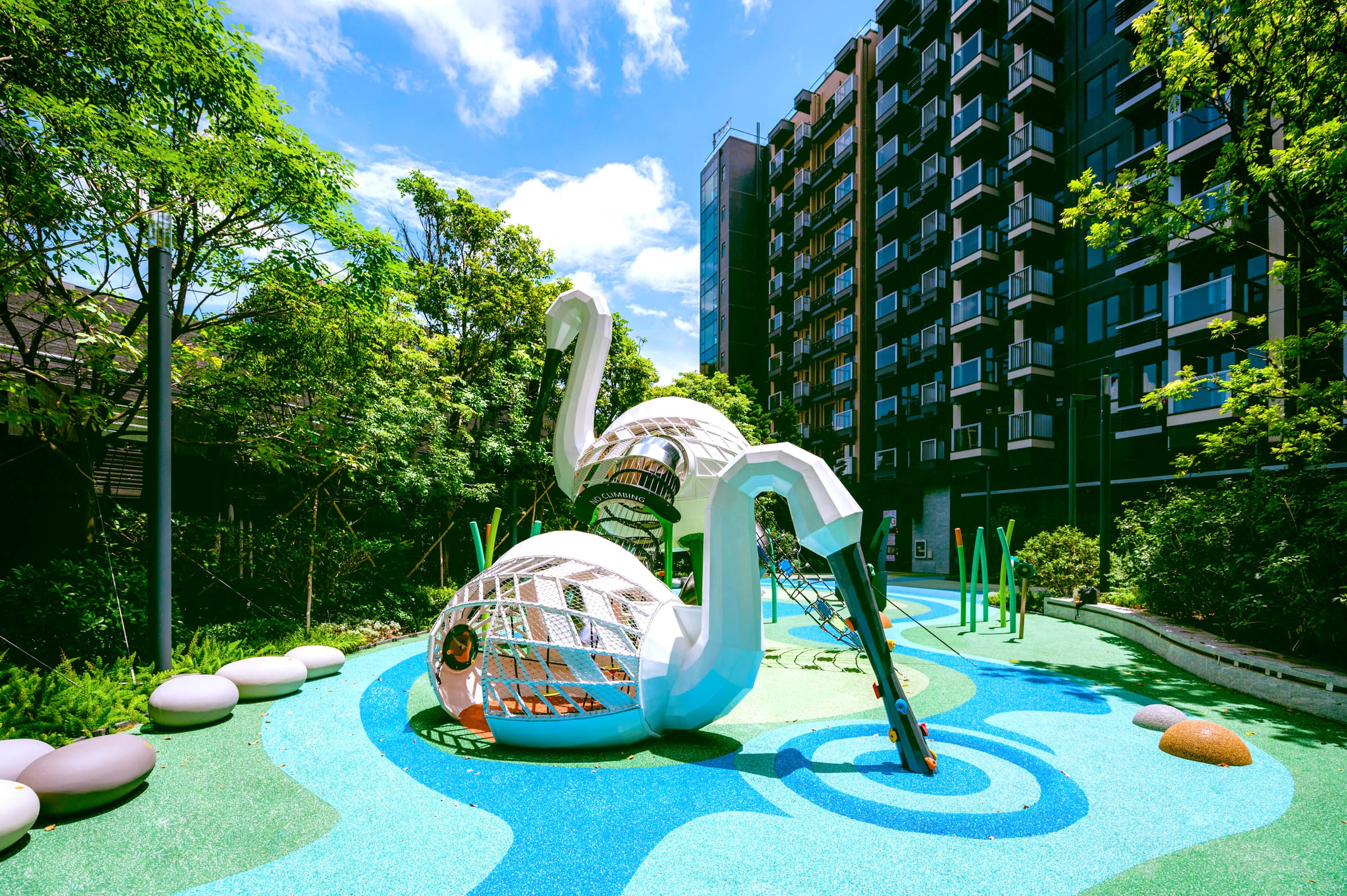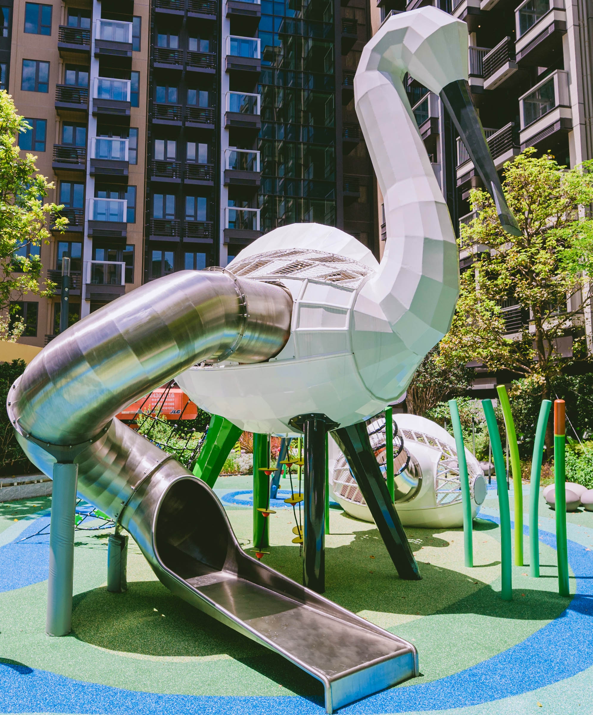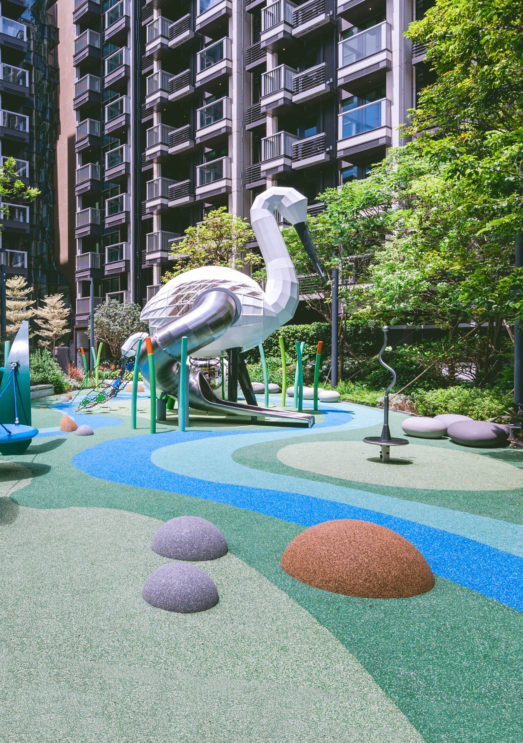 Architectures are the art of expressing human ingenuity through space. Taking Wetland Seasons Park as an example, its entire architectural design is characterized by Black-faced Spoonbill and Wetland, representing its core idea of harmony between people and nature. Perched at the center of this nature-themed playground is a superlative craftsmanship Black-faced Spoonbill-themed play tower. The grasses and trees, bricks and stones, children are no strangers to these familiar scenes and simulate playing in the playground. Within the structure itself, the little rods allow children to lounge and spin. There is also a tube slide and climbing ridges that provide a variety of play options. The unique attraction of this playground is the connecting tunnel between the two Black-faced Spoonbill towers. Its peculiar shape requires children to navigate strategically and bravely, hence developing both their physical and cognitive strengths. Nearby there is a swing for those who truly want to soar higher. The wavy contours and blue color mat of this playground also enable it to blend in beautifully with its surroundings, merging both the residential blocks and the nature nearby.