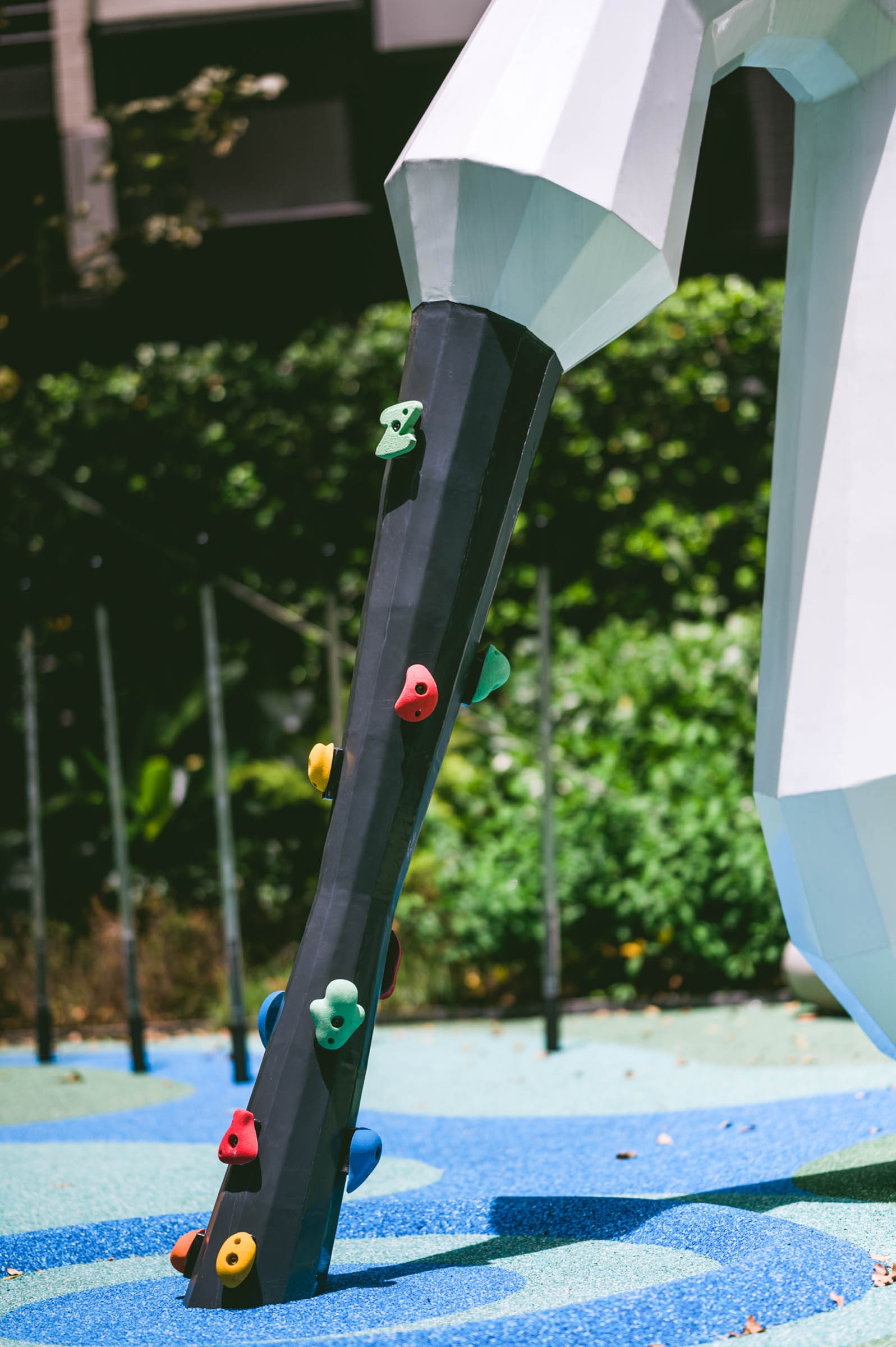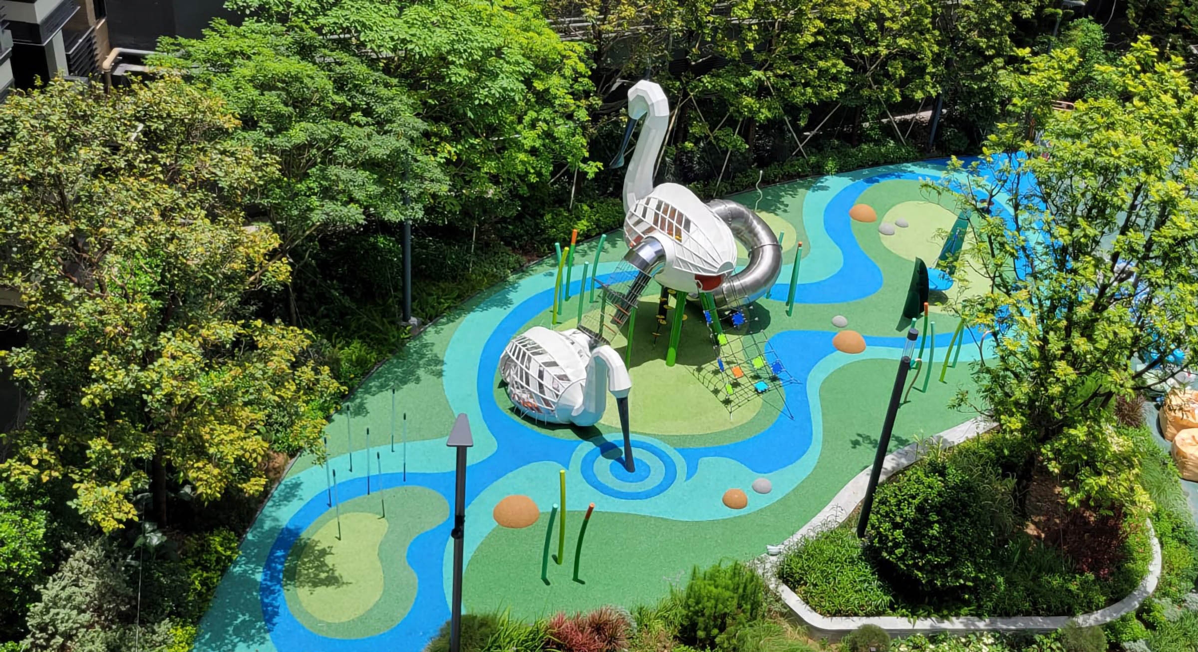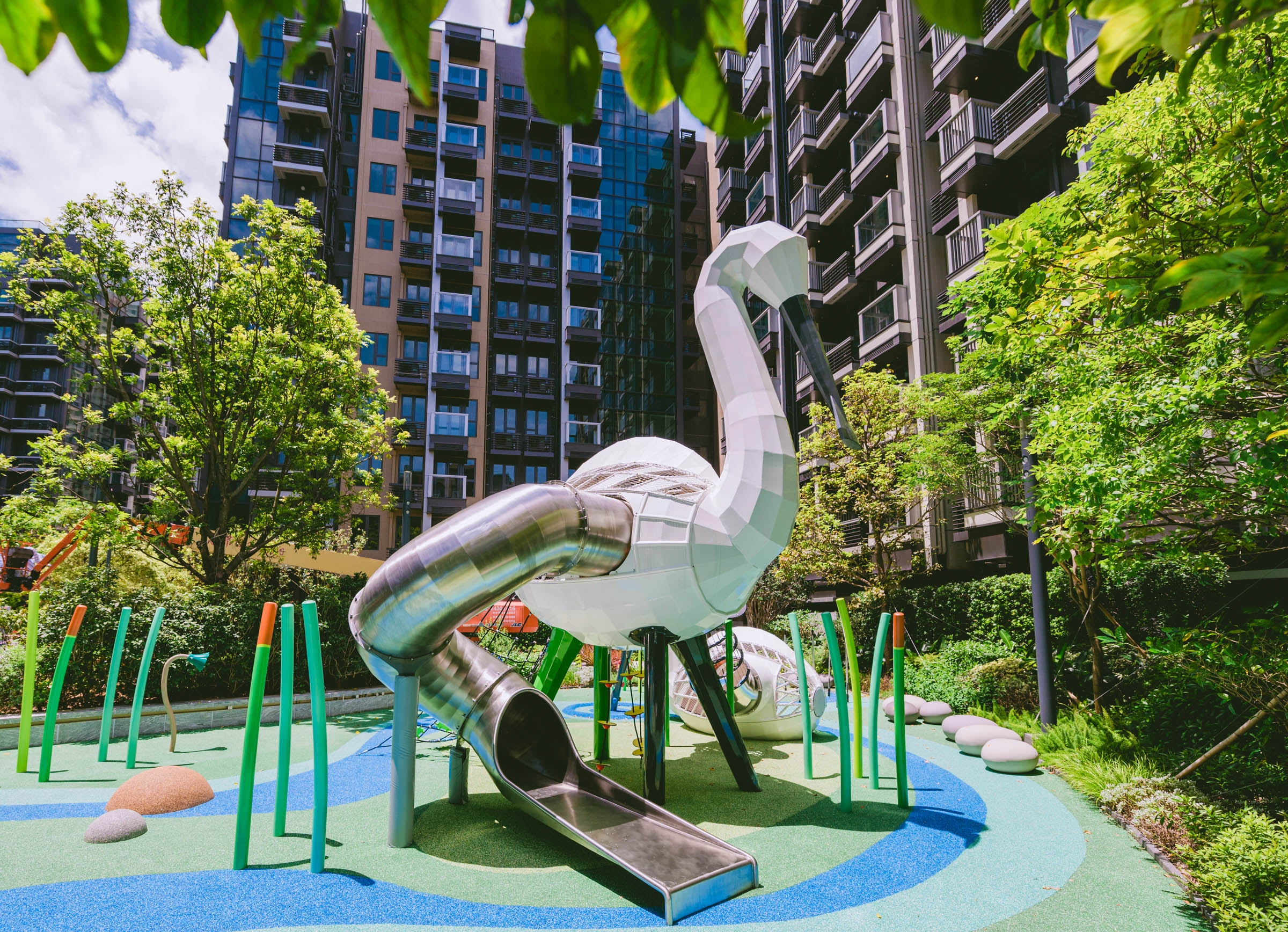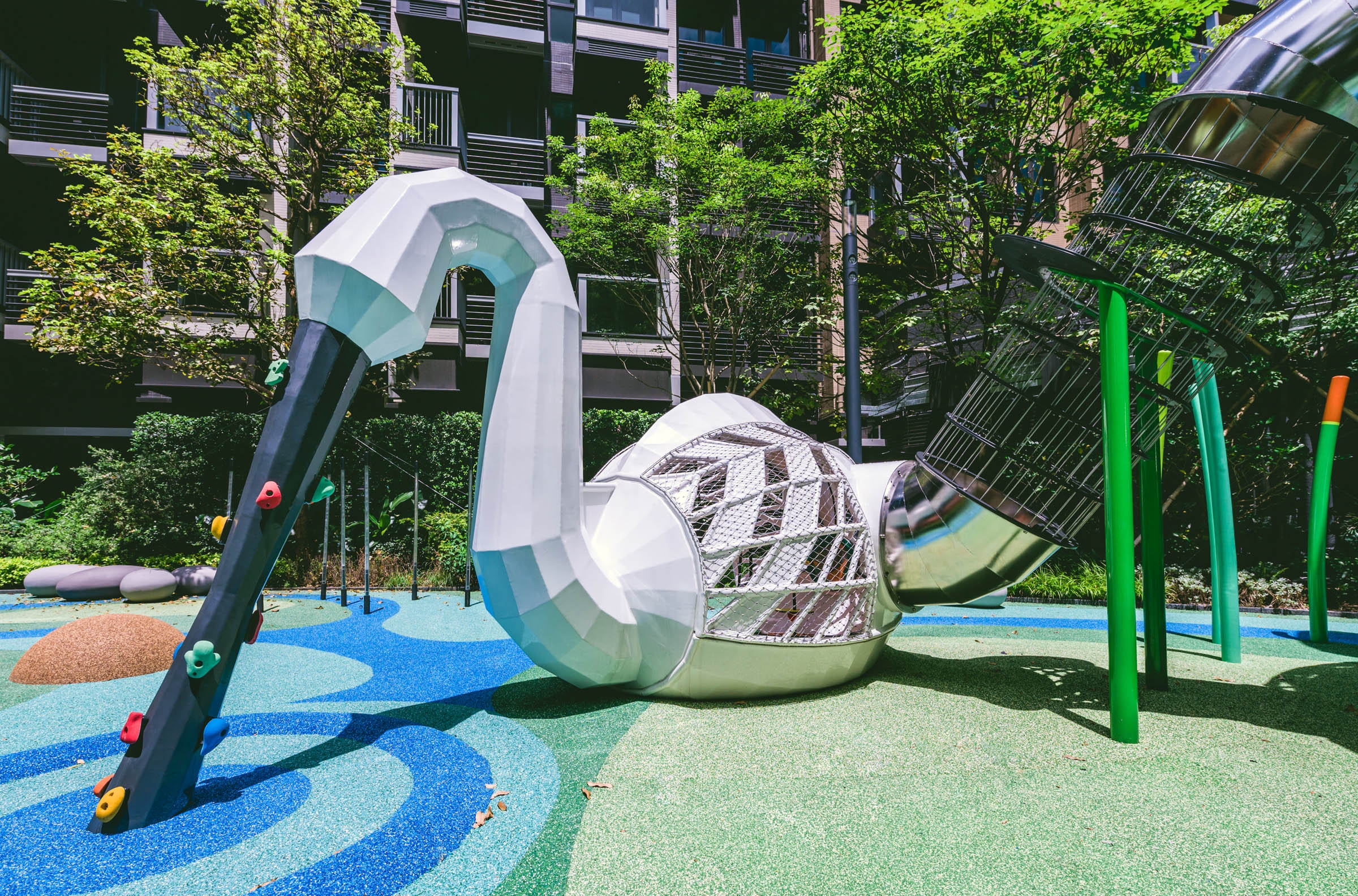 Architectures are the art of expressing human ingenuity through space. Taking Wetland Seasons Park as an example, its entire architectural design is characterized by Black-faced Spoonbill and Wetland, representing its core idea of harmony between people and nature. Perched at the center of this nature-themed playground is a superlative craftsmanship Black-faced Spoonbill-themed play tower. The grasses and trees, bricks and stones, children are no strangers to these familiar scenes and simulate playing in the playground. Within the structure itself, the little rods allow children to lounge and spin. There is also a tube slide and climbing ridges that provide a variety of play options. The unique attraction of this playground is the connecting tunnel between the two Black-faced Spoonbill towers. Its peculiar shape requires children to navigate strategically and bravely, hence developing both their physical and cognitive strengths. Nearby there is a swing for those who truly want to soar higher. The wavy contours and blue color mat of this playground also enable it to blend in beautifully with its surroundings, merging both the residential blocks and the nature nearby.