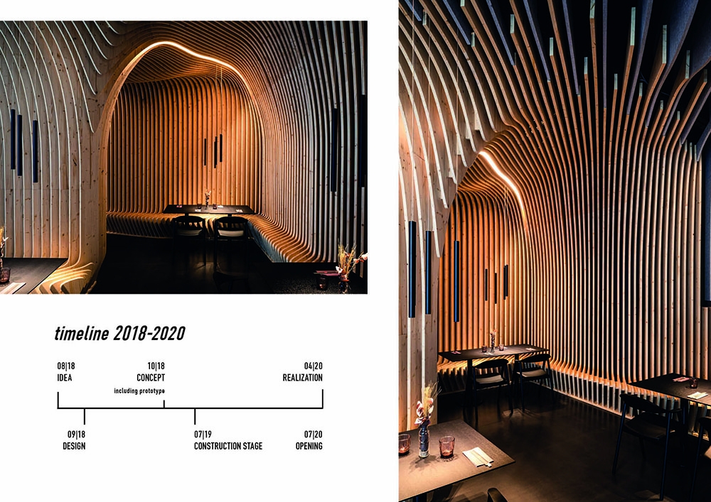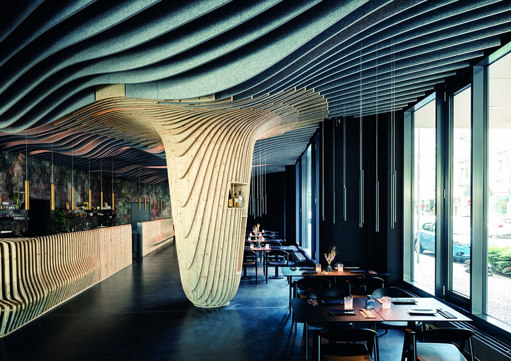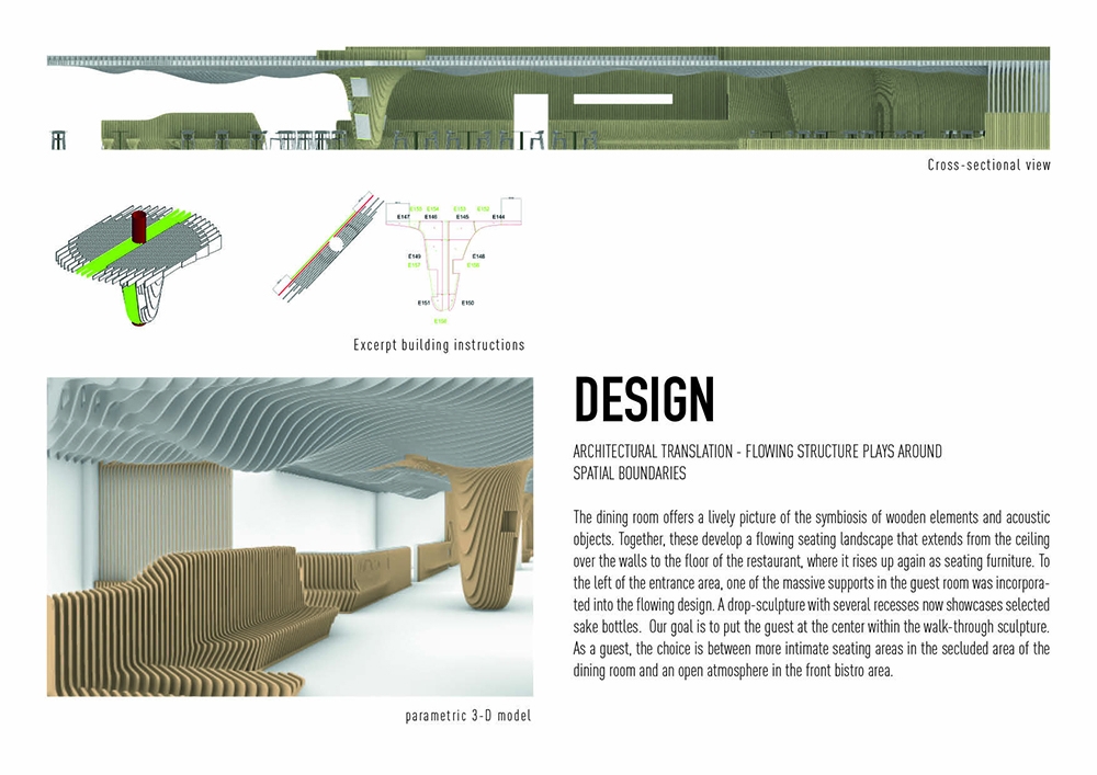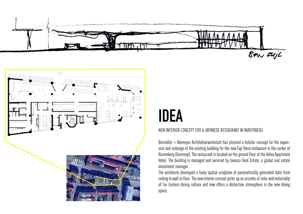 For the new sushi restaurant in the center of Nuremberg, Bermüller + Niemeyer developed a holistic concept for the conversion and redesign of the existing building. This provides a modern interpretation of Far Eastern dining culture of color and materiality. With this in mind, the high-quality hospitality area on the ground floor of the Adina Hotel Nuremberg was completely expanded during ongoing operations. In the guest room, a lively image is created from a symbiosis of wooden elements and acoustic objects. These develop a flowing wave structure that extends from the ceiling over the walls to the floor of the restaurant, where it rises again as seating furniture. The guest is offered the choice between more intimate seating areas in the secluded area of the dining room and an open atmosphere in the front bistro area. In the center point of the room the Sushi master is preparing the food. The acoustic baffles running parallel to the wooden slats not only contribute to the room acoustics but also the eco-friendly aspect by upcycling PET-bottles.