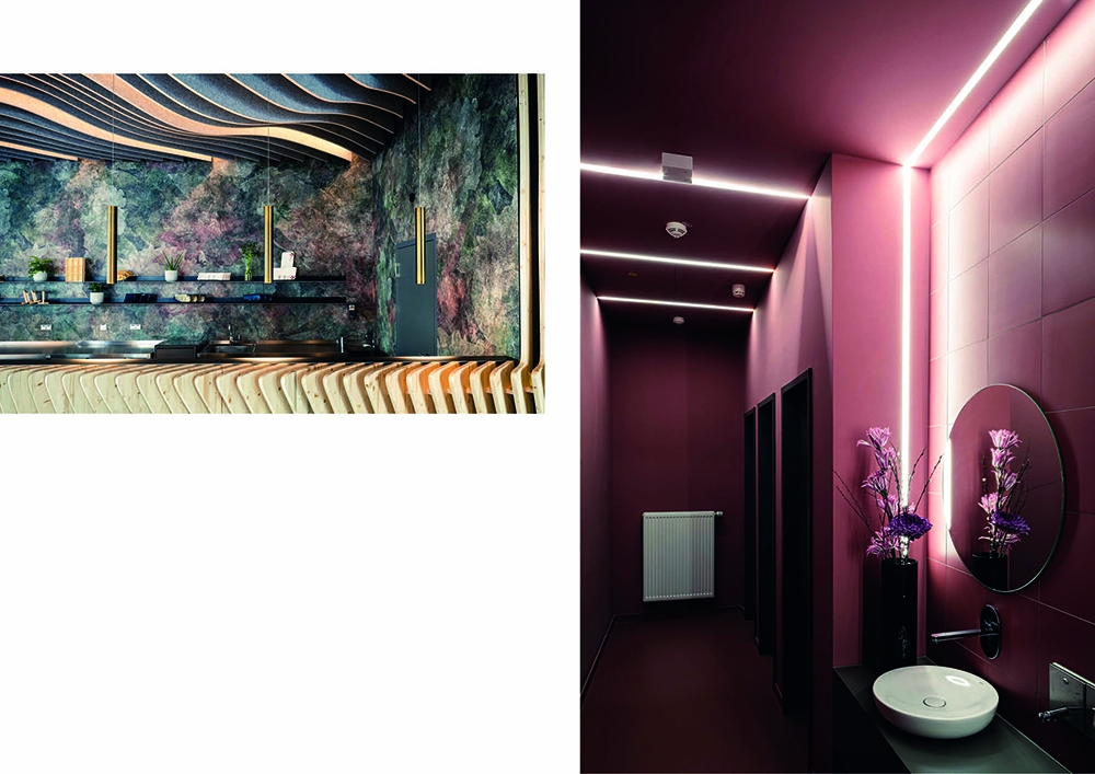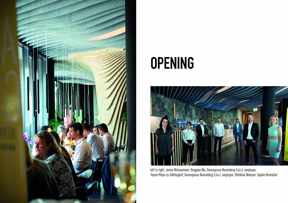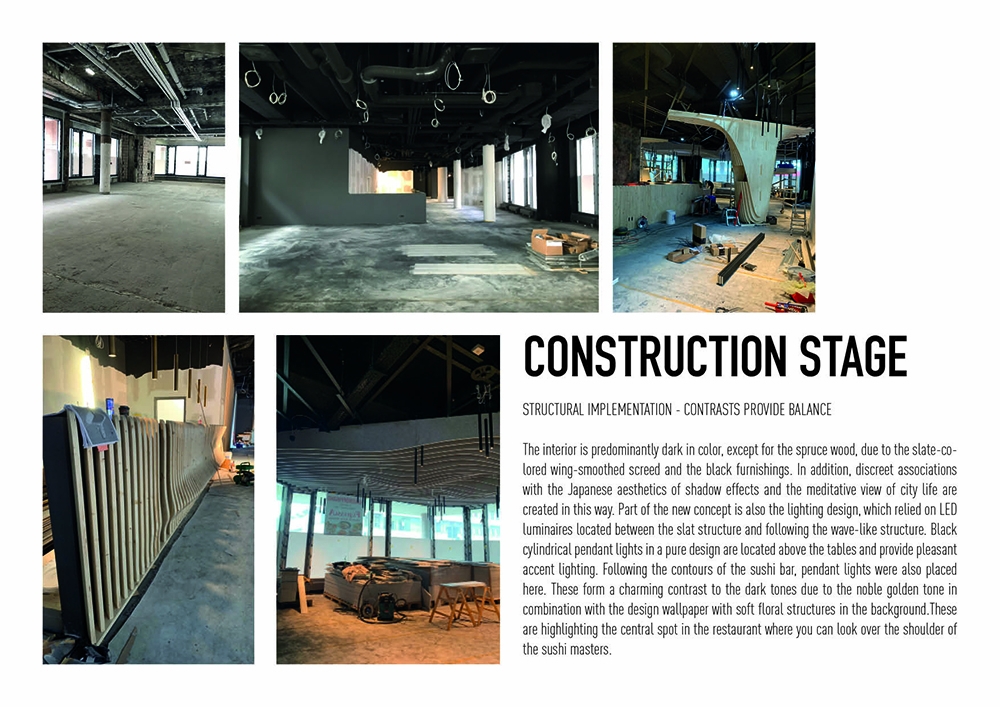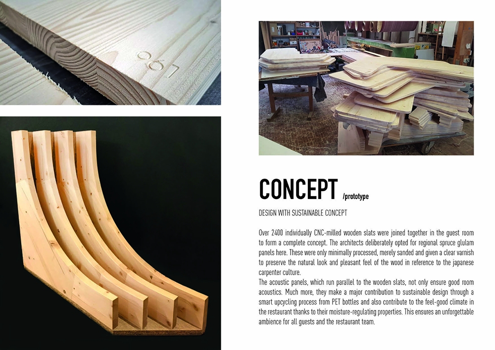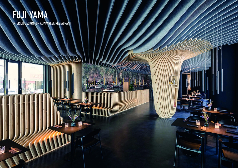 For the new sushi restaurant in the center of Nuremberg, Bermüller + Niemeyer developed a holistic concept for the conversion and redesign of the existing building. This provides a modern interpretation of Far Eastern dining culture of color and materiality. With this in mind, the high-quality hospitality area on the ground floor of the Adina Hotel Nuremberg was completely expanded during ongoing operations. In the guest room, a lively image is created from a symbiosis of wooden elements and acoustic objects. These develop a flowing wave structure that extends from the ceiling over the walls to the floor of the restaurant, where it rises again as seating furniture. The guest is offered the choice between more intimate seating areas in the secluded area of the dining room and an open atmosphere in the front bistro area. In the center point of the room the Sushi master is preparing the food. The acoustic baffles running parallel to the wooden slats not only contribute to the room acoustics but also the eco-friendly aspect by upcycling PET-bottles.