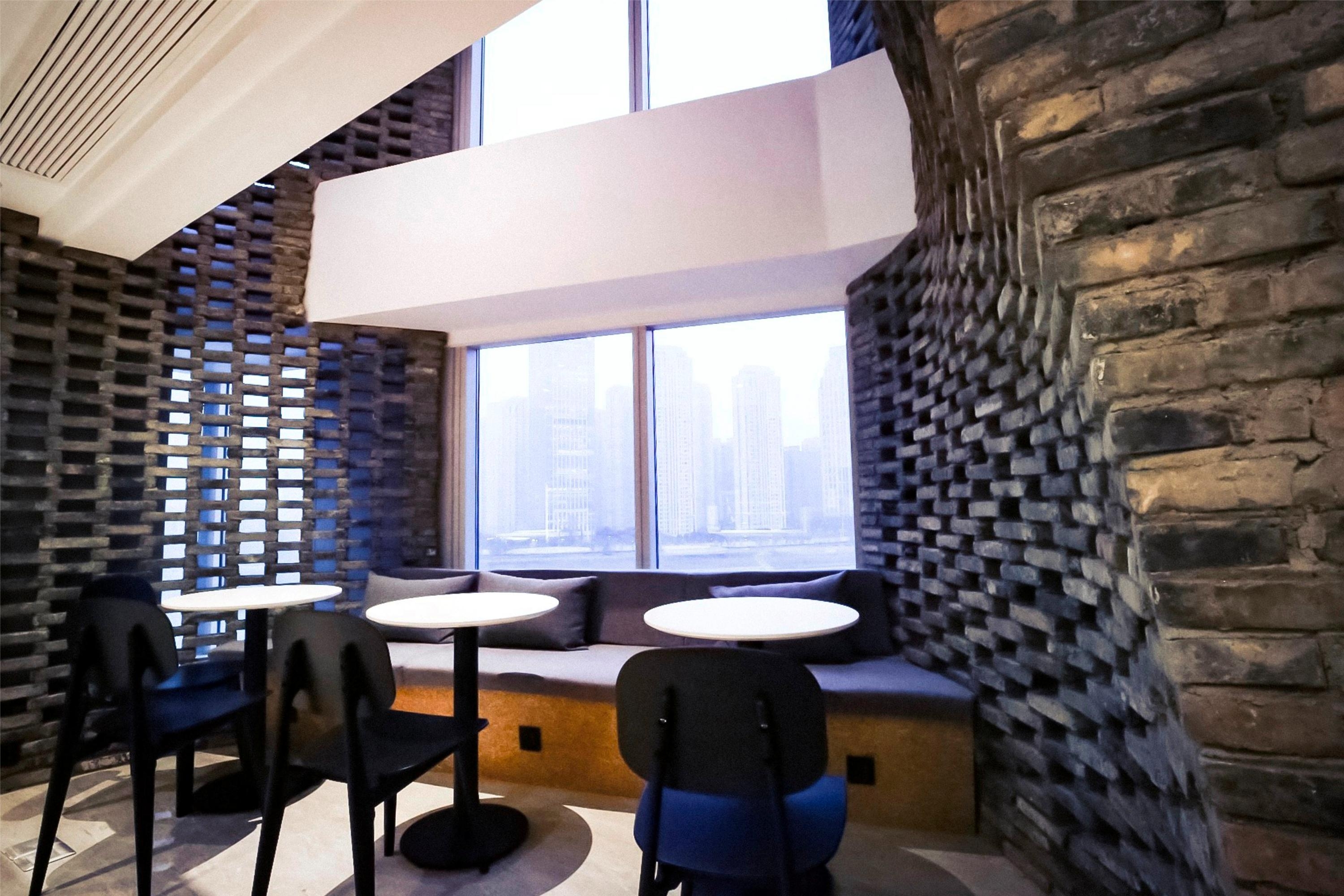 Old bricks were collected from the demolition sites in nearby villages around Wuhan. After cleaning, the old bricks were used as a feature wall in the cafe at the front desk of the hotel. Local memories preserved and historical culture inherited.