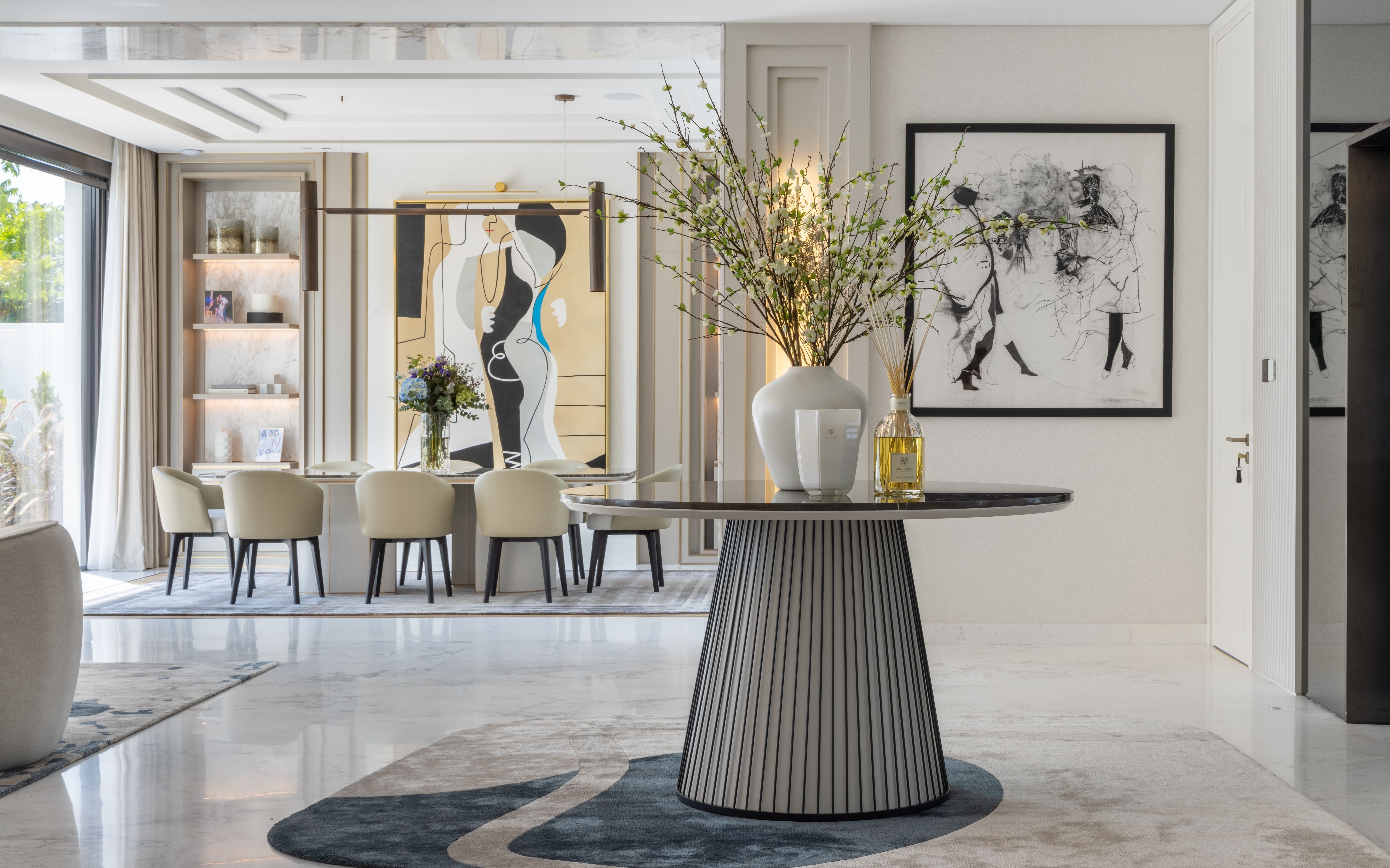 Situated in a poised community, the villa's allure is amplified by breathtaking views of exquisitely landscaped gardens and tranquil lagoons. The client's vision was to create a modern home that exudes elegance and luxury while honouring its neoclassical roots.