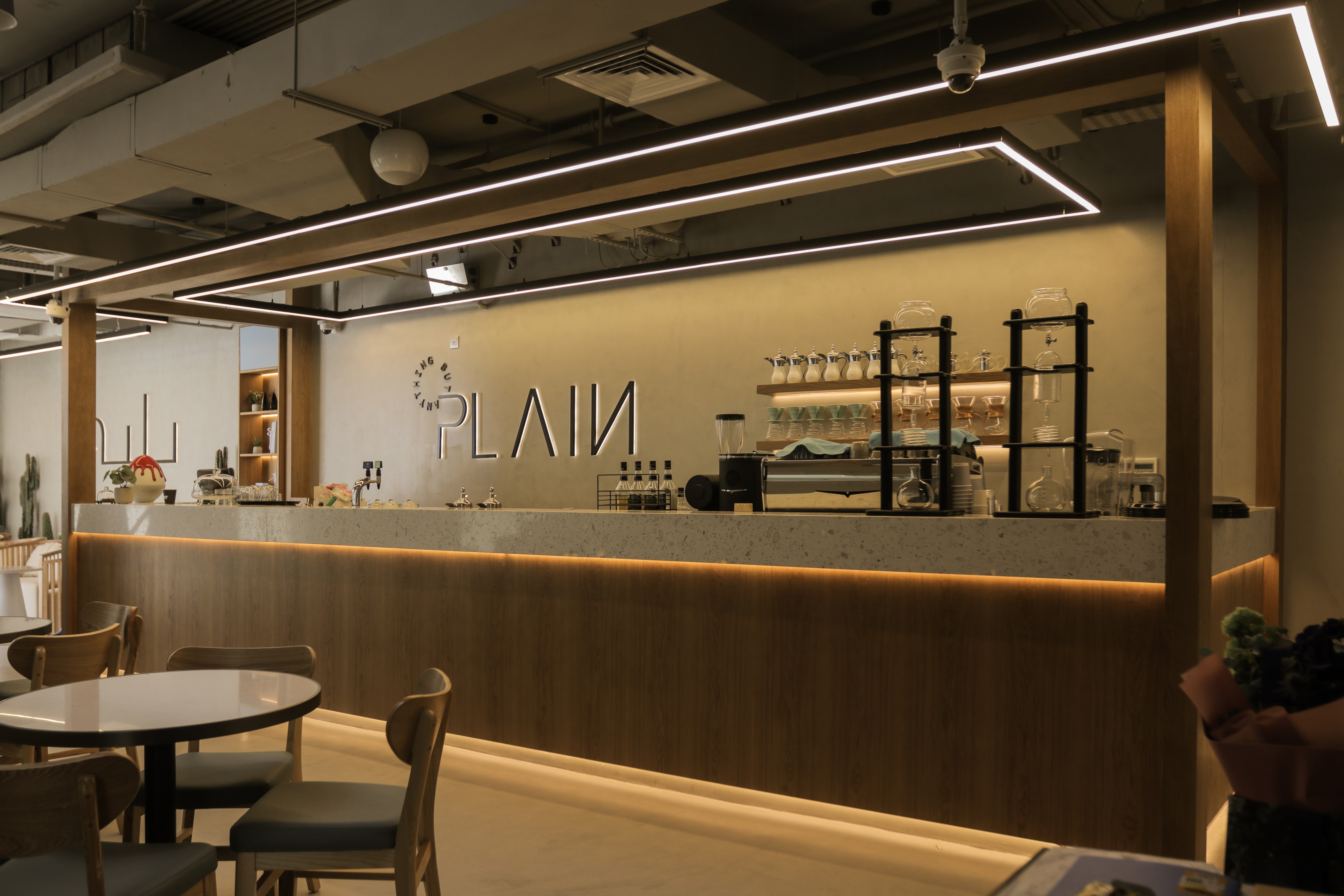 Plain Dessert is a captivating haven where minimalism meets elegance, inviting guests to unwind and savour delightful culinary creations in a serene ambience. With its pale colour palette, skylight, water feature and signature metal mesh, the café sets a new standard for understated luxury.
