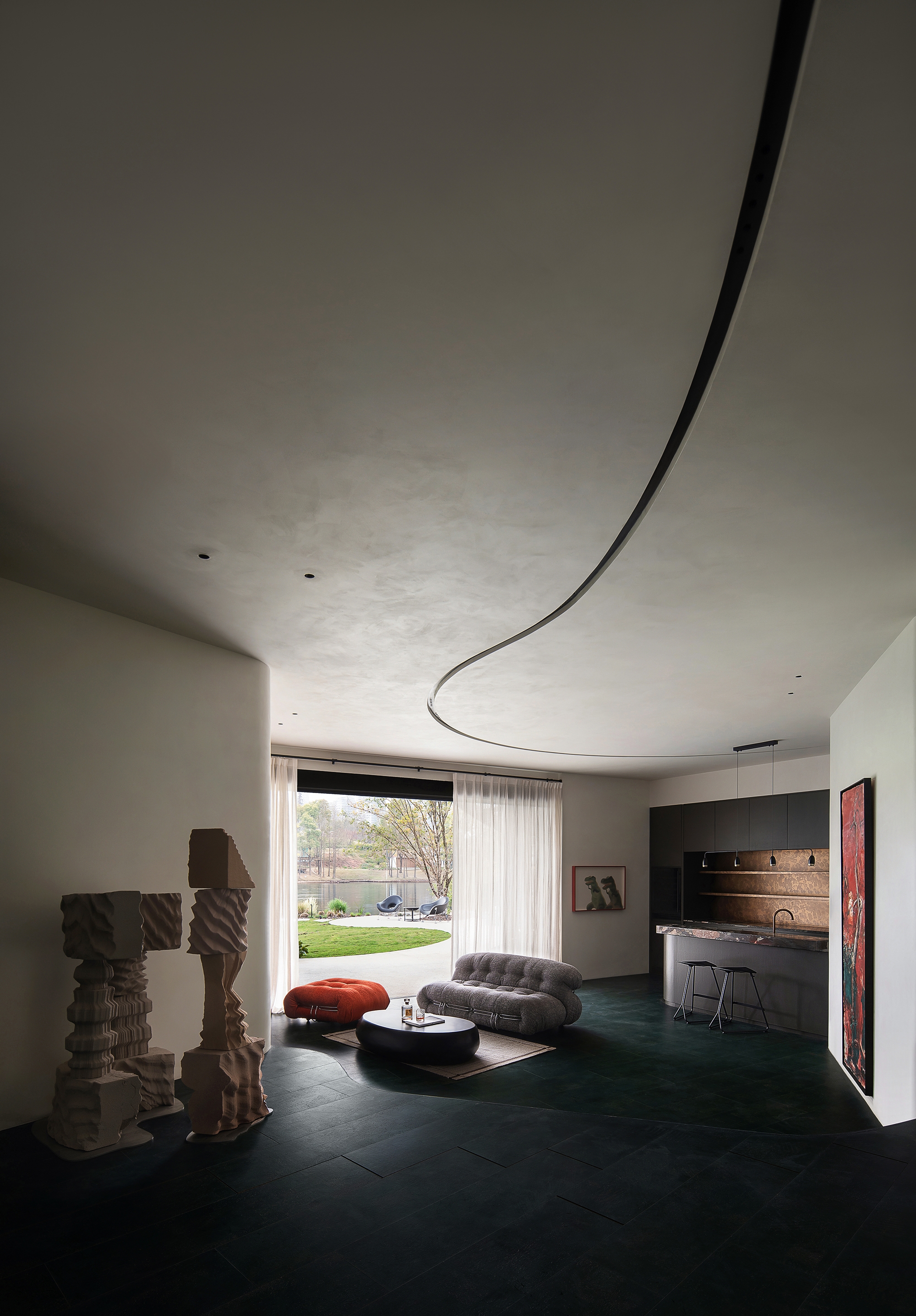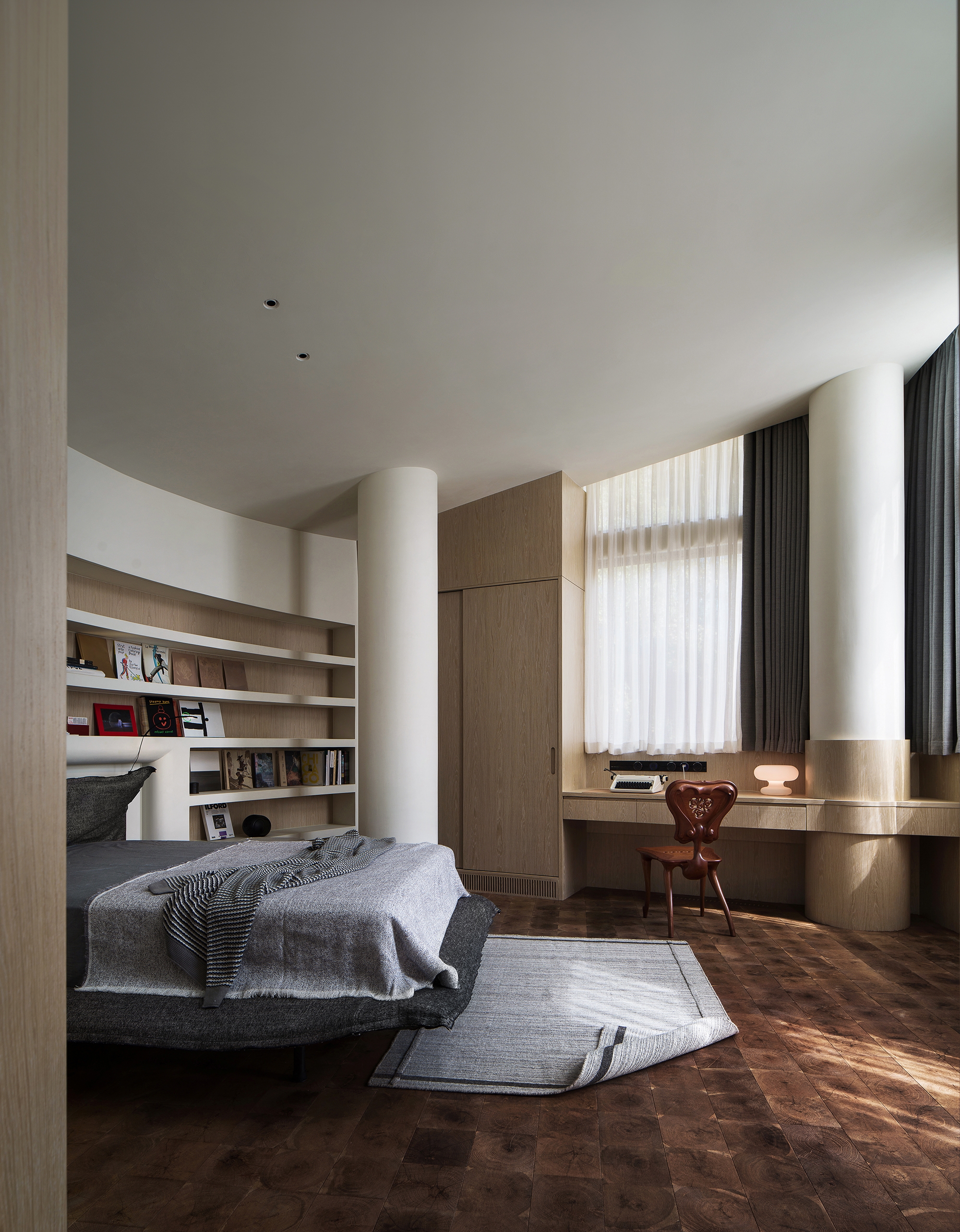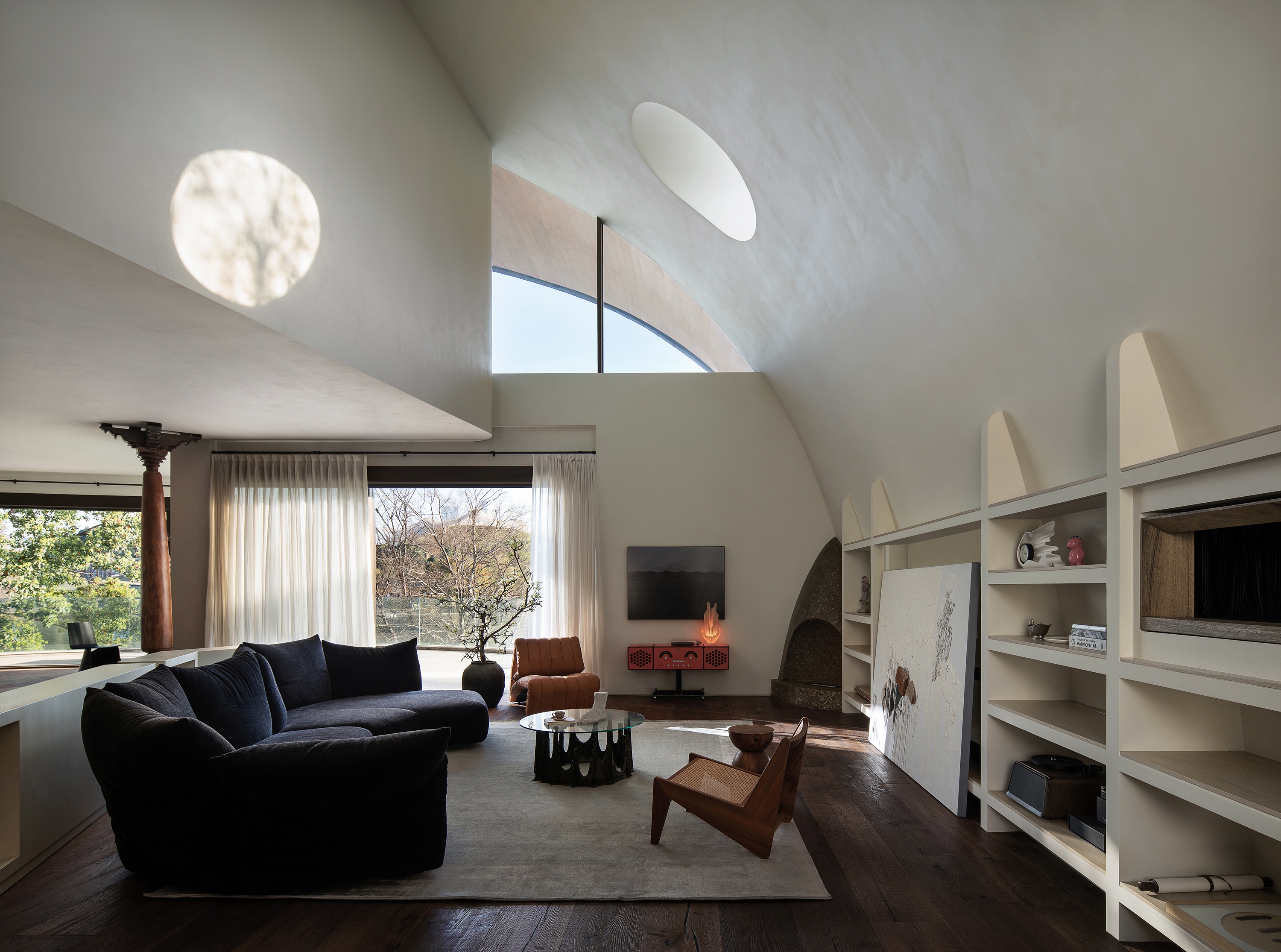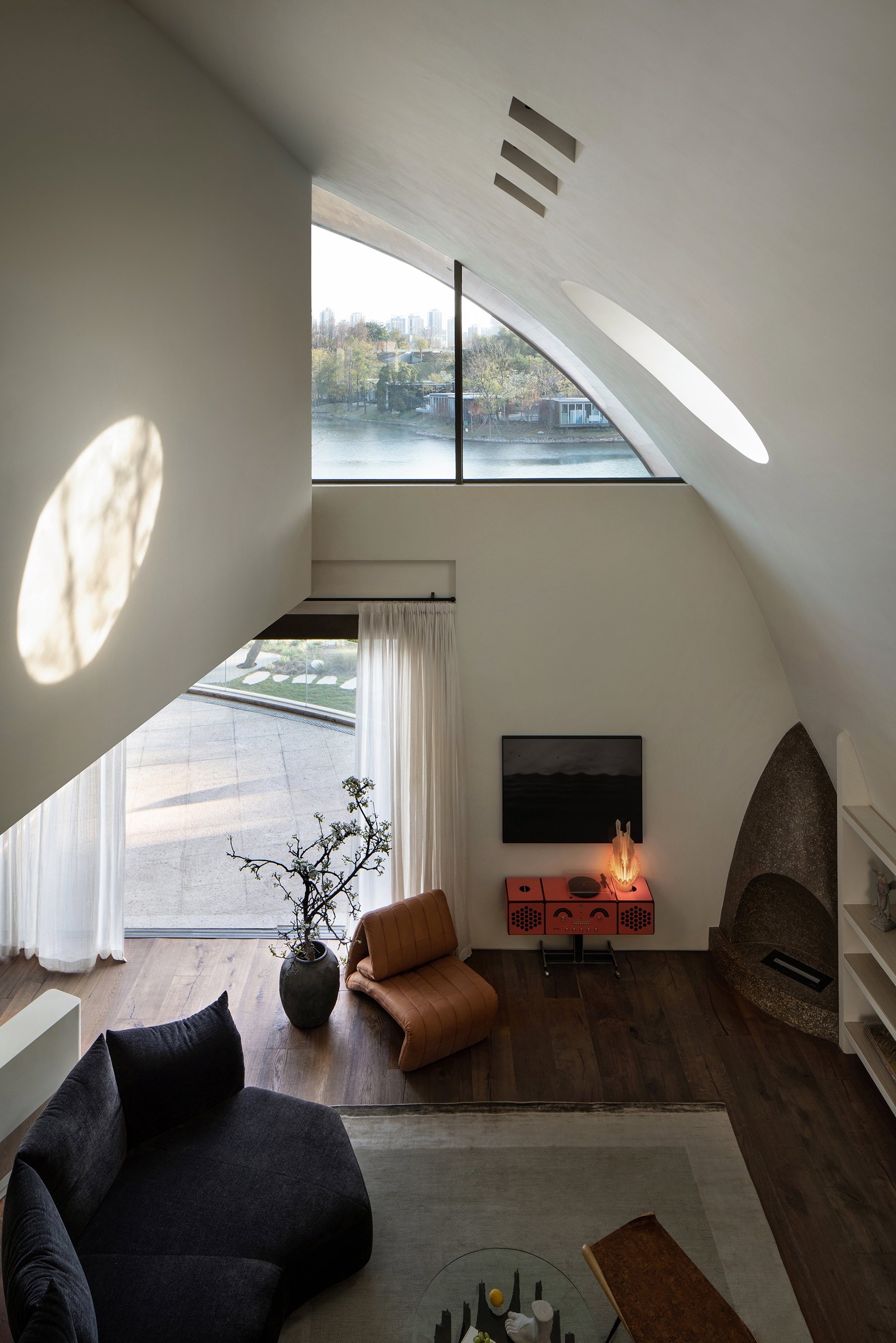 The living room is reshaped using shell-like curves inspired by building facade. The high hollow, with an entire white wall, resembles a blank canvas. As the sun rises and the moon sets, light and shadow from the hole are mirrored on the wall, like a full moon signifying a reunion. This makes room hazy and dynamic.
