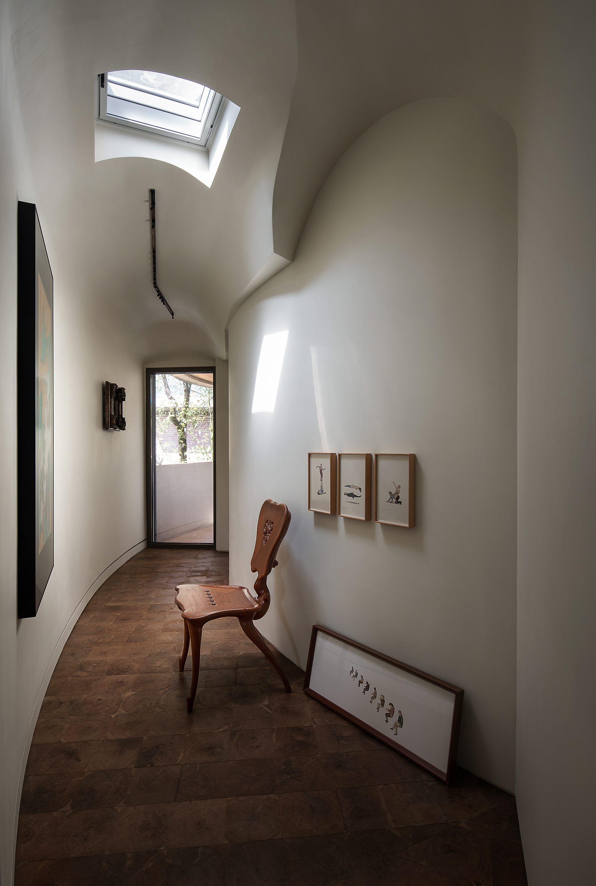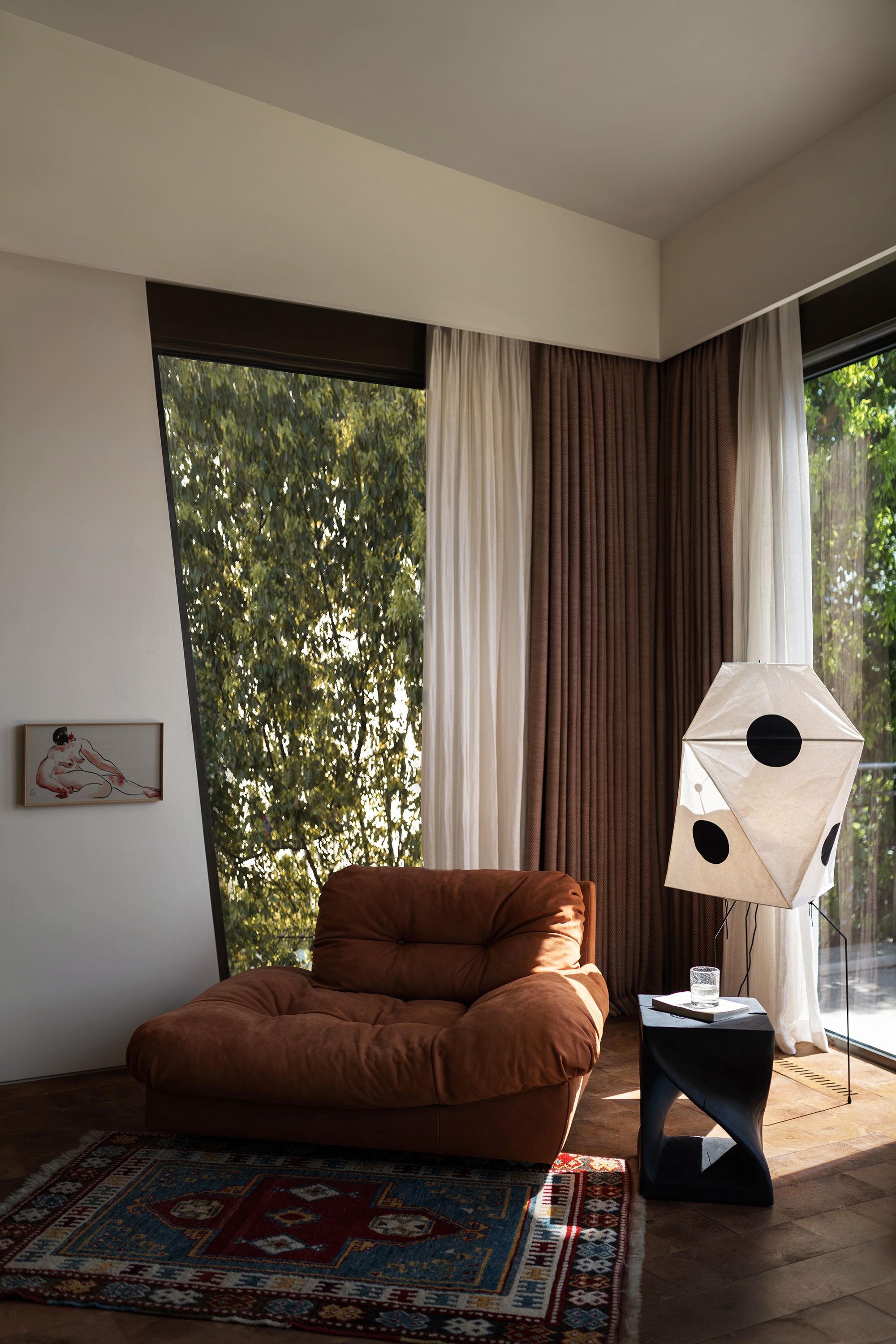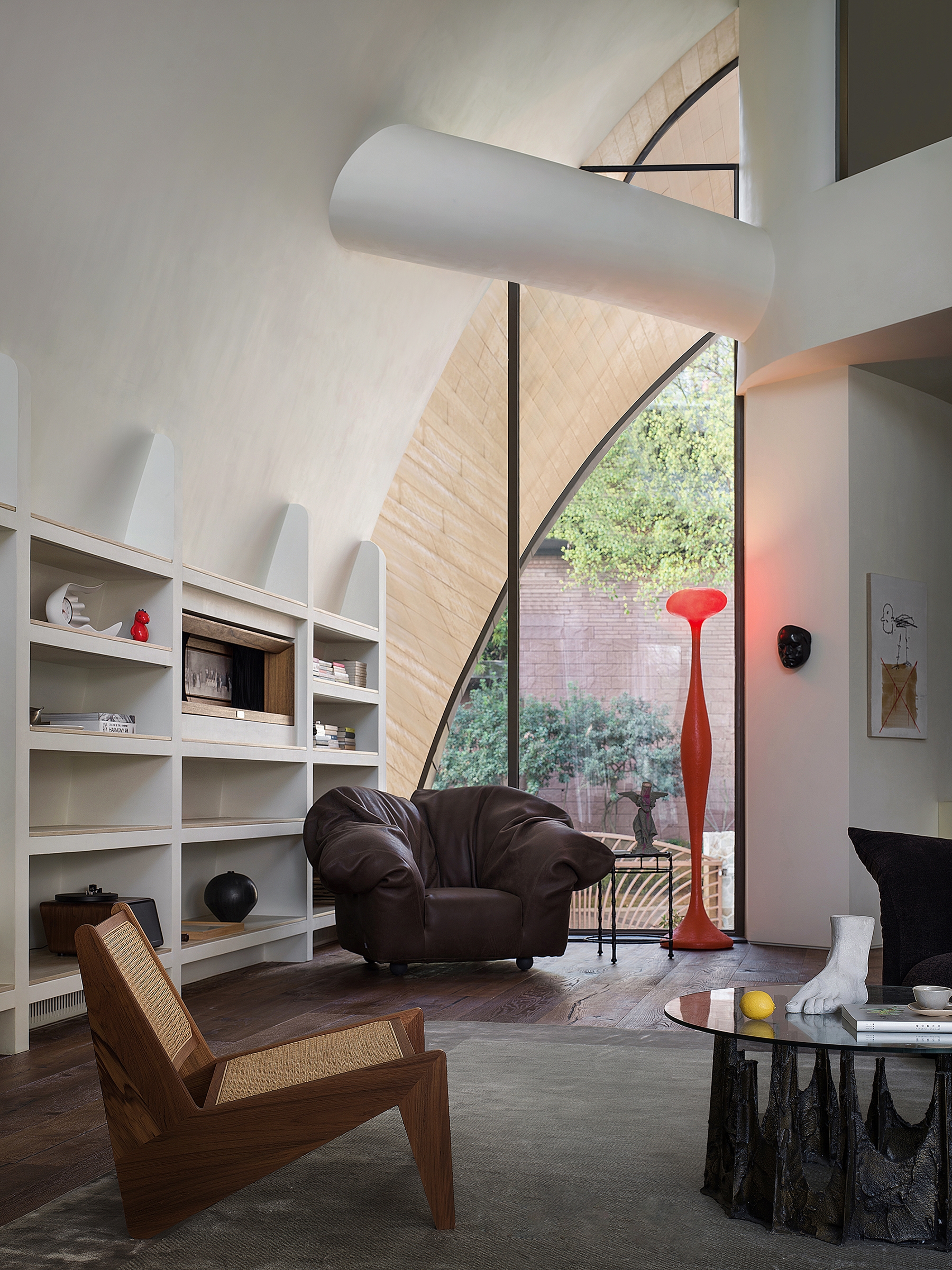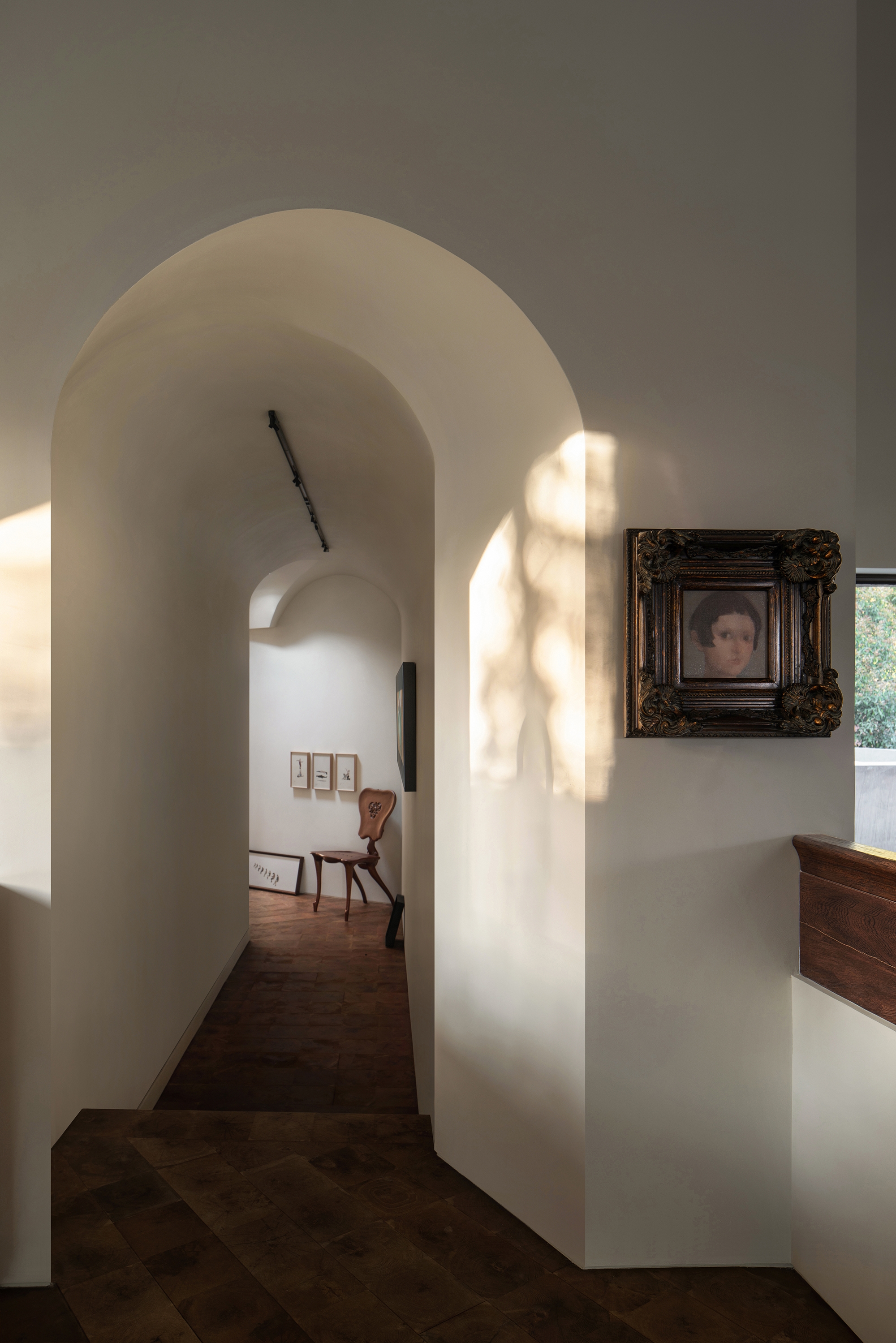 The living room is reshaped using shell-like curves inspired by building facade. The high hollow, with an entire white wall, resembles a blank canvas. As the sun rises and the moon sets, light and shadow from the hole are mirrored on the wall, like a full moon signifying a reunion. This makes room hazy and dynamic.