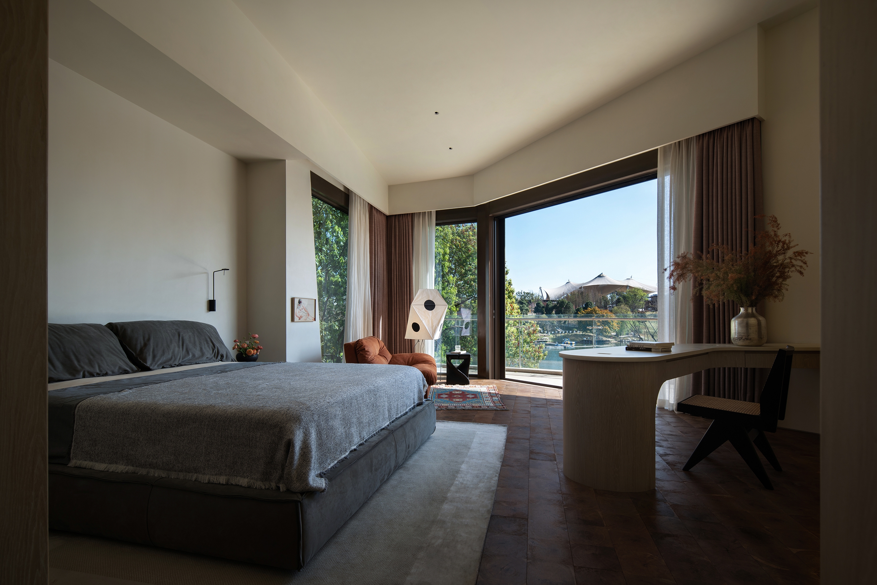The dining echoes the art picture "Eat", adding a bit of fun. Offering a lakeside vista, each bedroom has an en-suite bathroom. The newly built linking "bridge" alters the previously redundant pattern, as an art gallery to exhibit the owners' beloved artworks and collections. The lounge and the fitness feature a flowing pattern of highs and lows, with the partition wall opened up to bring best fresh air and sunlight. By doing so, residents' life habits, aesthetics and spiritual needs are fully met, truly enhancing their quality of life.
