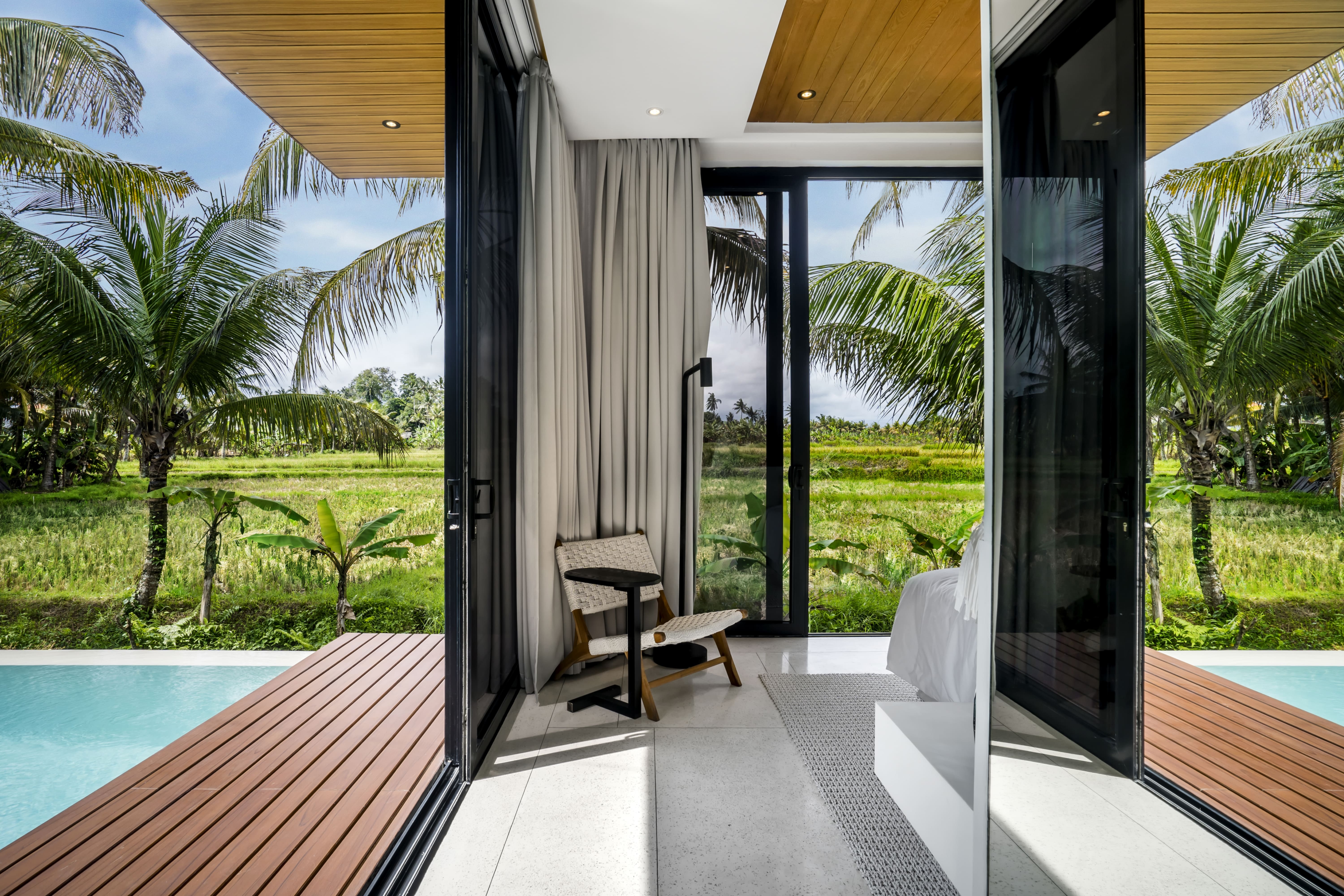 We offer a unique solution, ideal for relaxation and recreation. Villas are based on the concept of harmony with nature. There are all extra features that help visitors feel satisfied during their stay. An amazing effect of peace and silence is achieved thanks to a really good location. Beautiful rice fields surround the villas and create stunning views. The idea that also makes the objects so interesting is the integration of green areas and absence of transitions between territory inside and outside. A lot of plants and open space fill visitors with a sense of freedom and natural lightness.