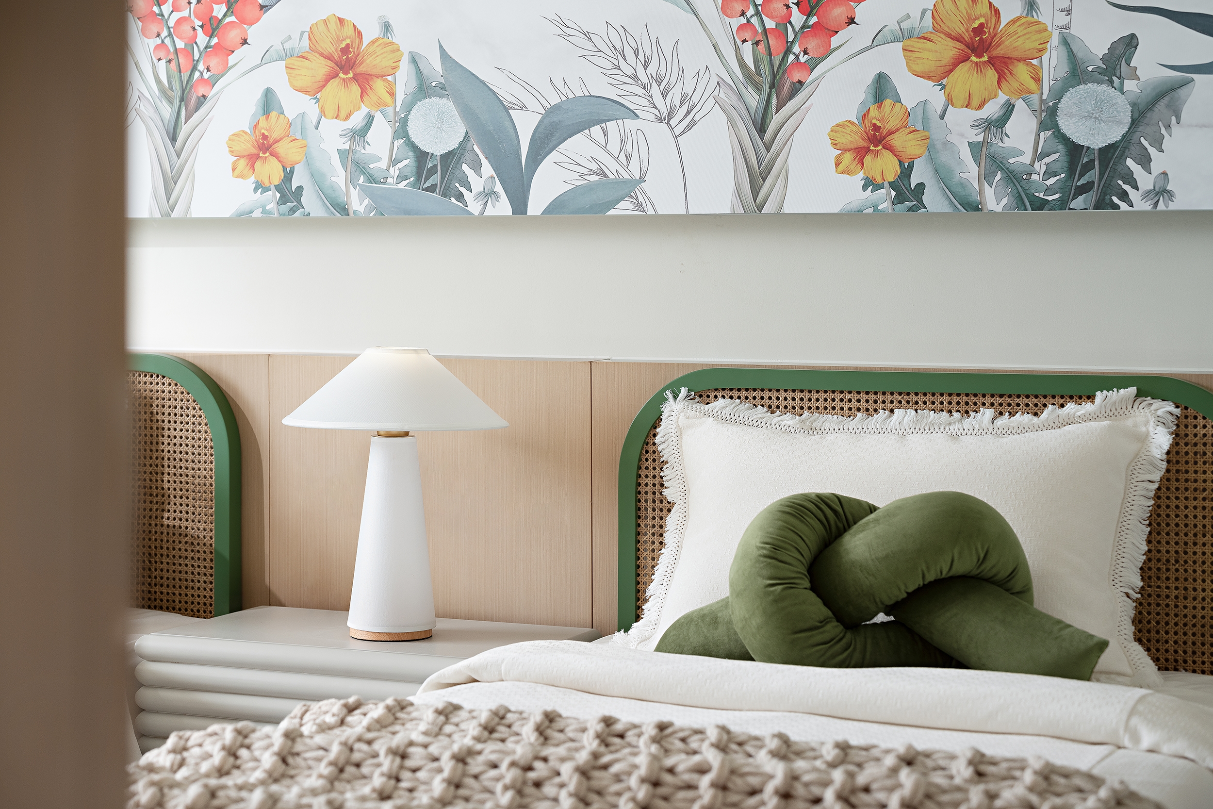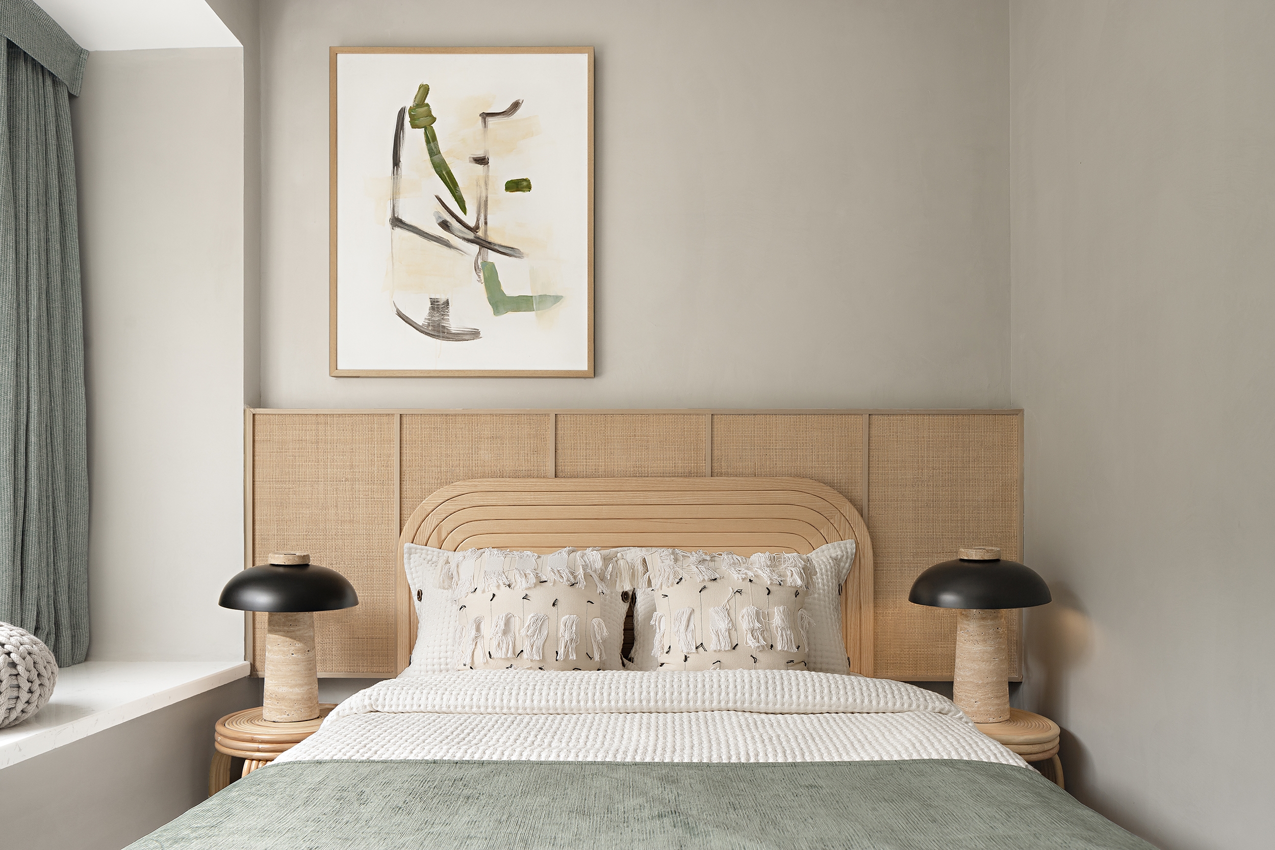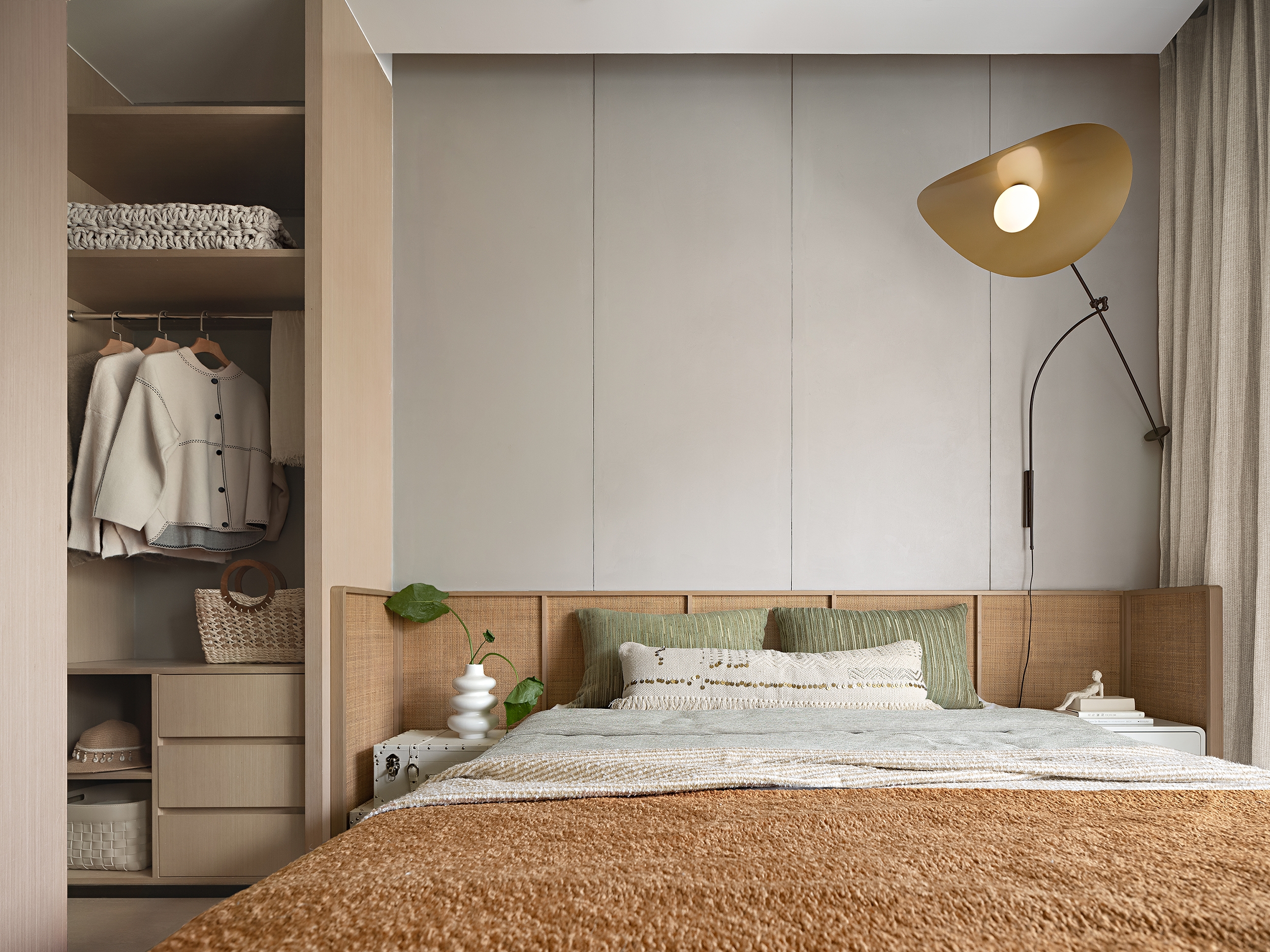 The bedroom exudes an impression of purity and elegance with wood, gold, and green meld together. The mix of rattan furniture with wood veneer, in the hollow-out shape, adds tension to the living.