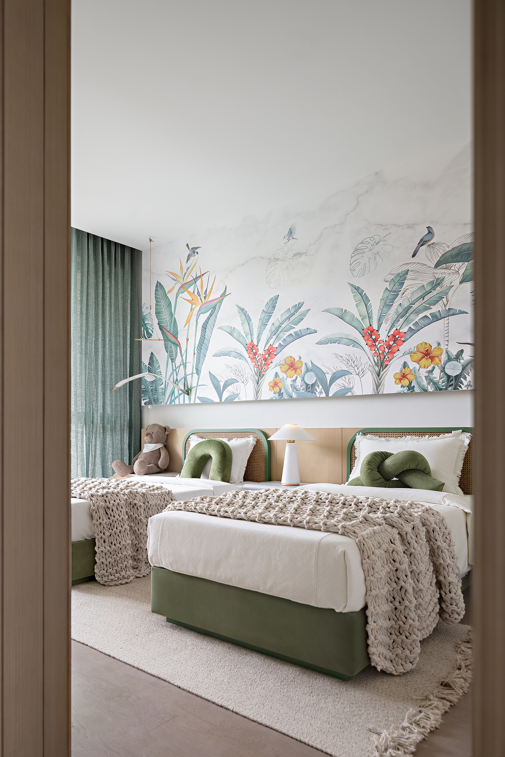 In addition, children can discover the mysteries of nature thanks to simple textures and subtle background paintings in the kid’s room. By doing so, residents can enjoy a great mountain lifestyle.