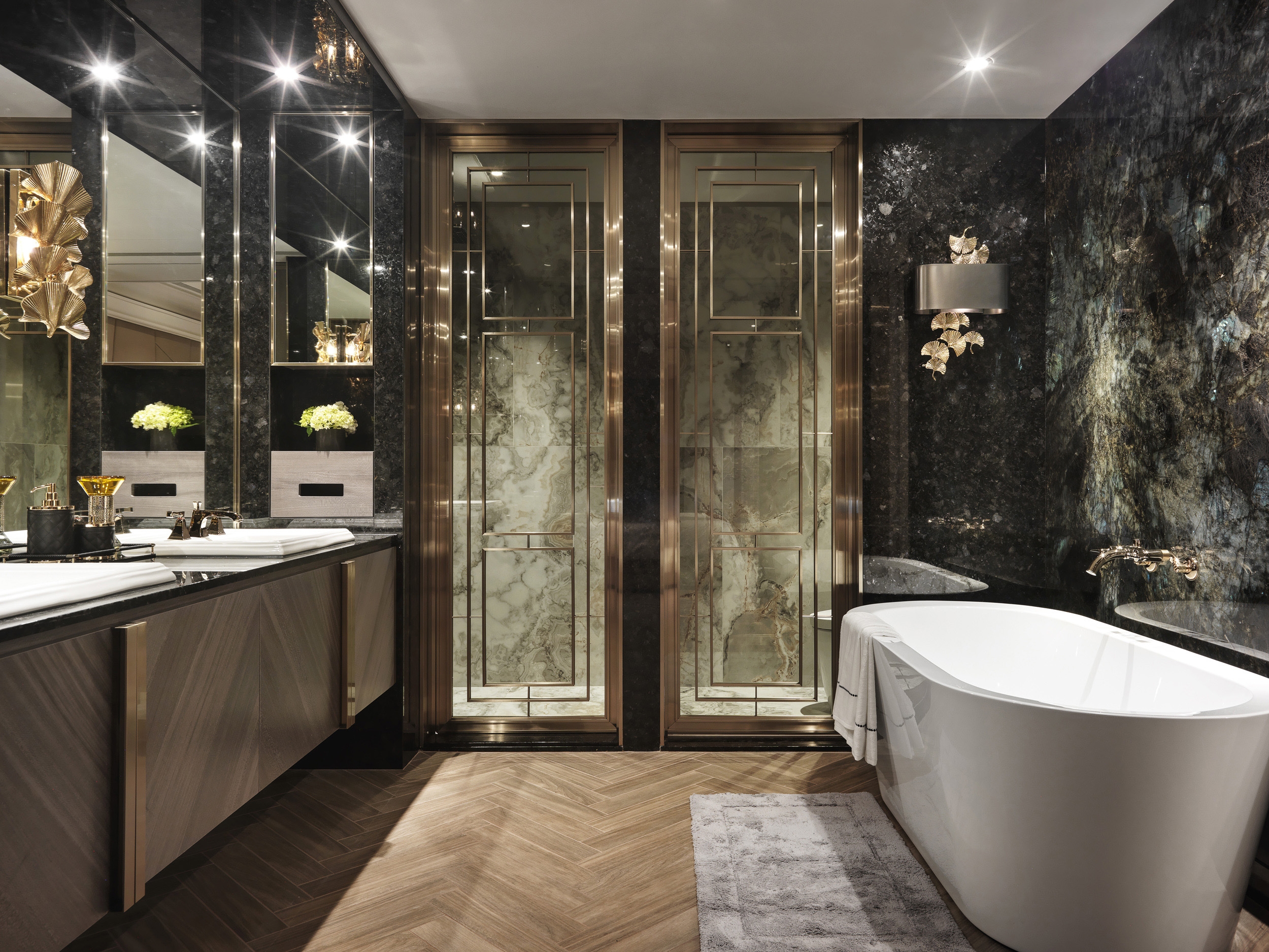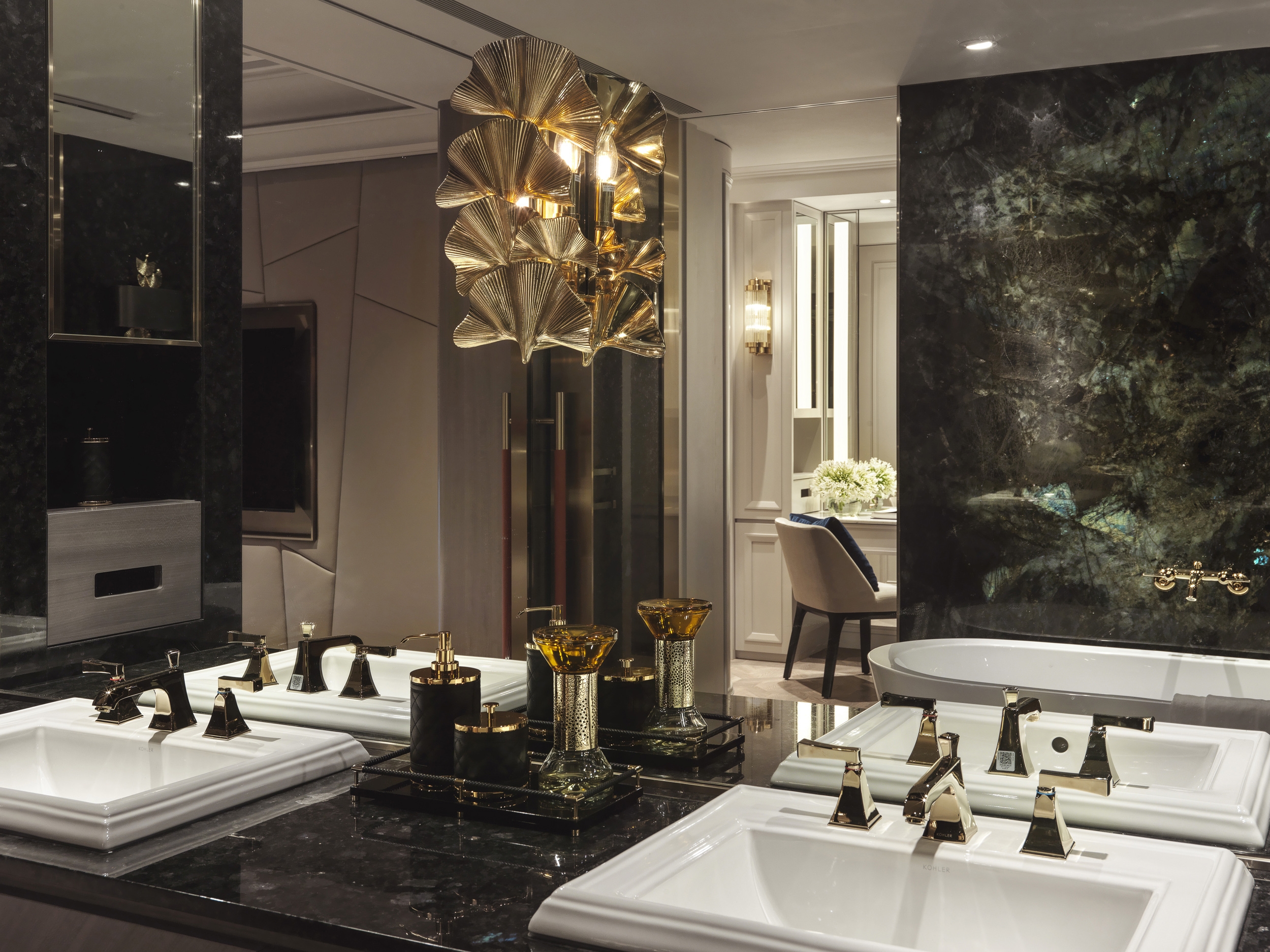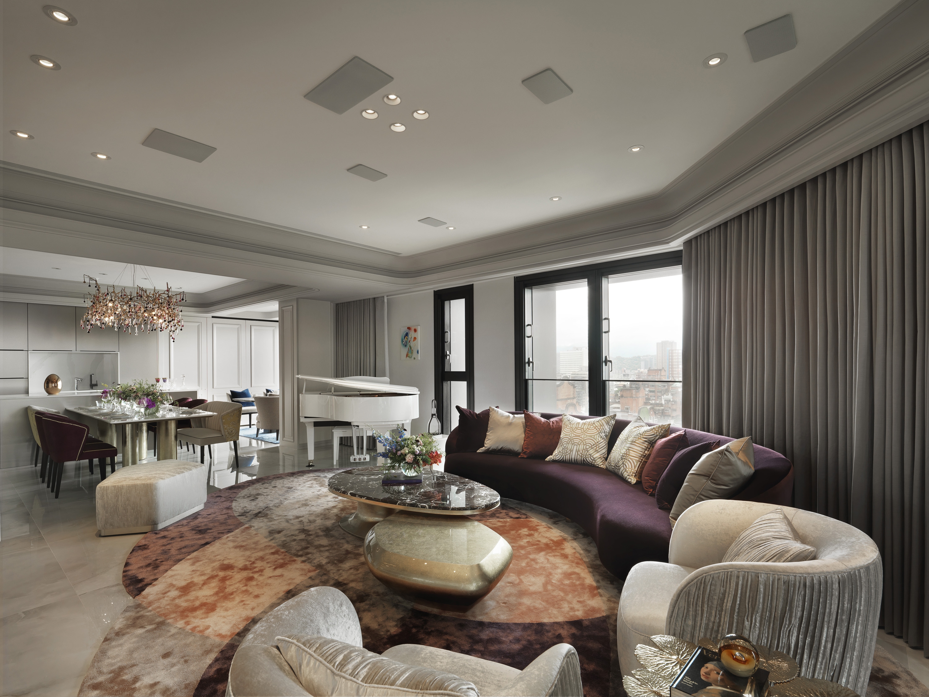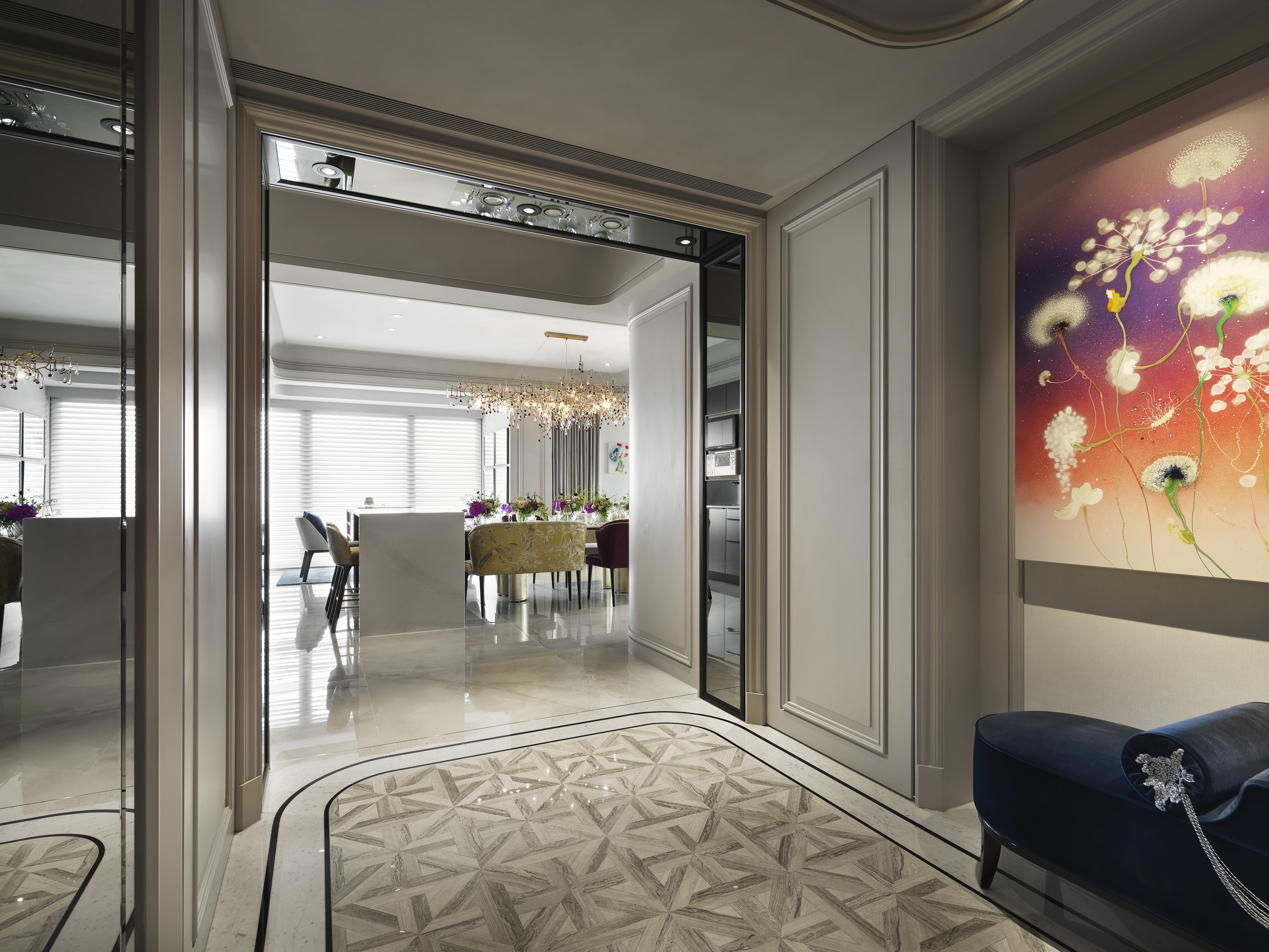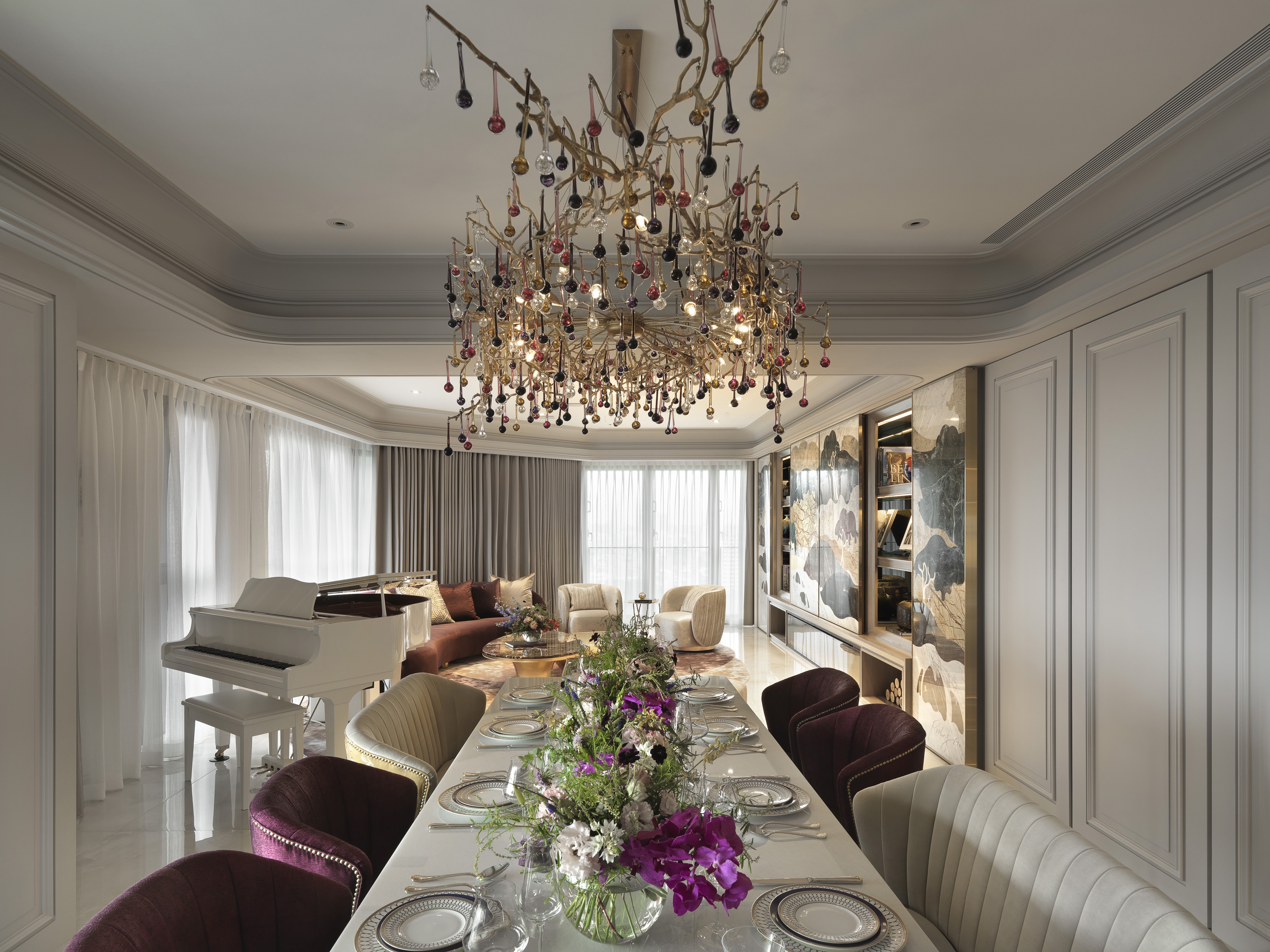 Elegant classical lines meet meticulous modern design, emphasizing detail and proportion. The incorporation of biomimetic elements and chic home decor creates a visually captivating narrative, seamlessly merging natural art pieces and light fixtures with a diverse range of materials.