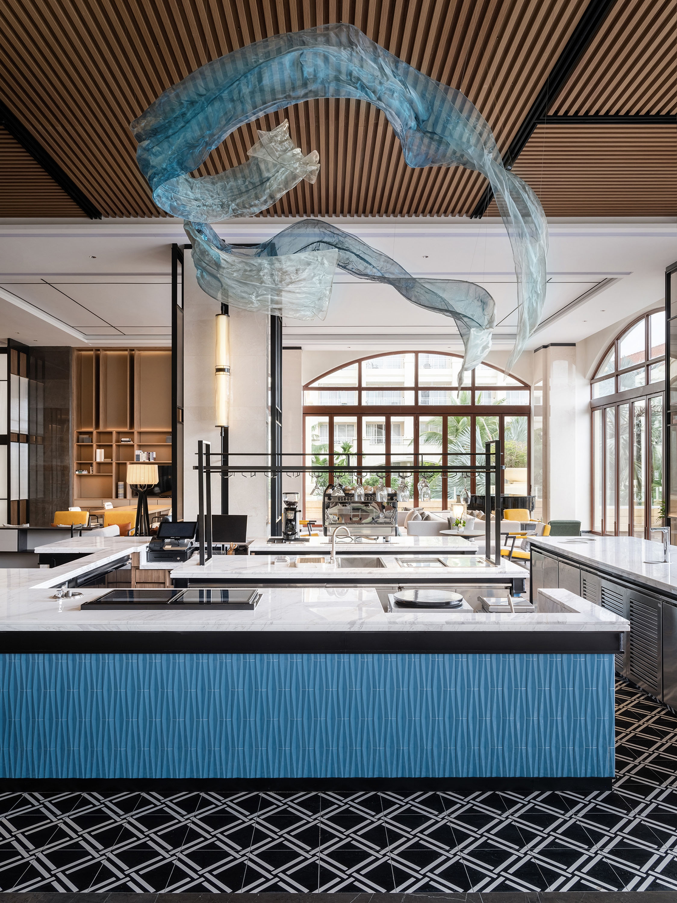 The Sheraton Hotel Haikou is located on the coconut tree-lined west coast of Haikou City. The interior design starting from the local architectural structure of the building overhang-style buildings, the hotel incorporates charming elements of the local Li brocade craftsmanship, organically integrating unique details, local culture, and the art of everyday life, creating a dual experience of memories and senses. Although it is a renovation project, the hotel lobby fully considers the sensory experience. While retaining the original pillars, it creates a spacious open layout, providing a continuous source of vitality and a sense of belonging. The lobby bar & More by Sheraton space is more refined and caters to the needs of users, with a flexible and diverse layout, integrating various functions, and a sense of freedom and transparency. The intertwined spatial layout can be flexibly transformed according to different time periods, with open boundaries and careful consideration of people flow, instantly transitioning into a diverse environment. Starting from nature and conveying warmth and familiarity, the Sheraton Hotel Haikou awakens every moment of a happy vacation experience!