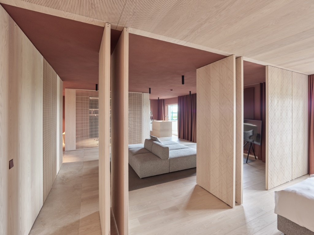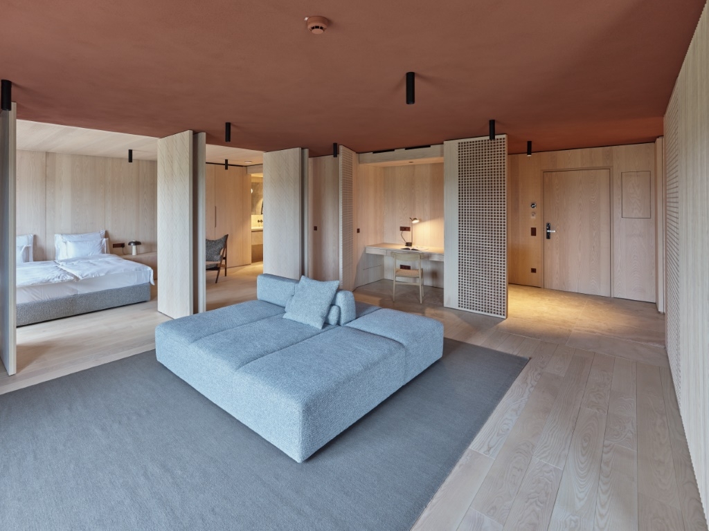 The new suites are made from sustainably harvested solid wood from nearby regions, clay plaster and natural stone. They emerged by joining smaller rooms together to create functional and spacy suites for a flexible use. Various movable partitions and variable elements enable to fit the room to guests´ actual needs such as a tub in the living room, a retractable workspace, a sofa to fall asleep on (by BEHF and Wittmann) or a hidden kitchenette.