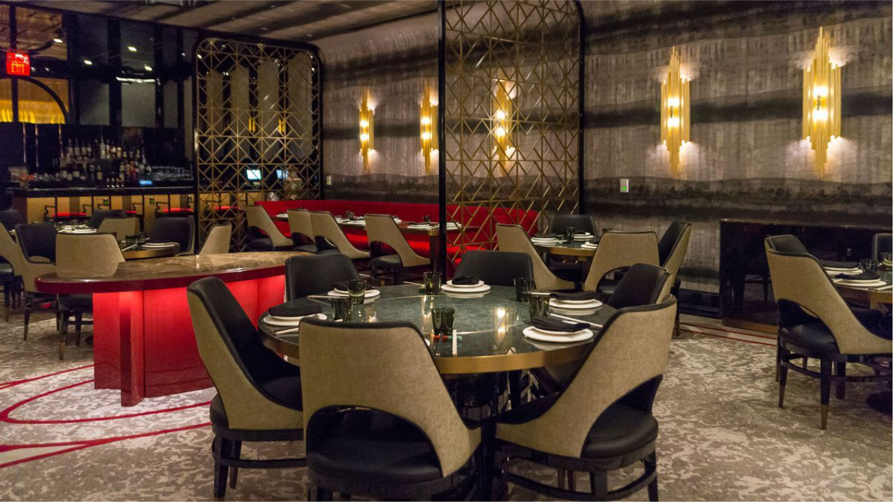 Located on the third floor of The Cosmopolitan Las Vegas, Red Plate's exterior was designed to be striking, sculptural and detailed, drawing guests in without giving too much away at first glance. Curved walls with textured champagne-colored plaster contrast with the black metal and brass detailing drawing guests toward the large glass and metal doors. Just beyond these doors is an intricately carved and lacquered cabinet with traditional Chinese landscape painting and inlay. The cabinet provides privacy to the main interior of the restaurant and also serves as the back bar liquor and tea cabinet.