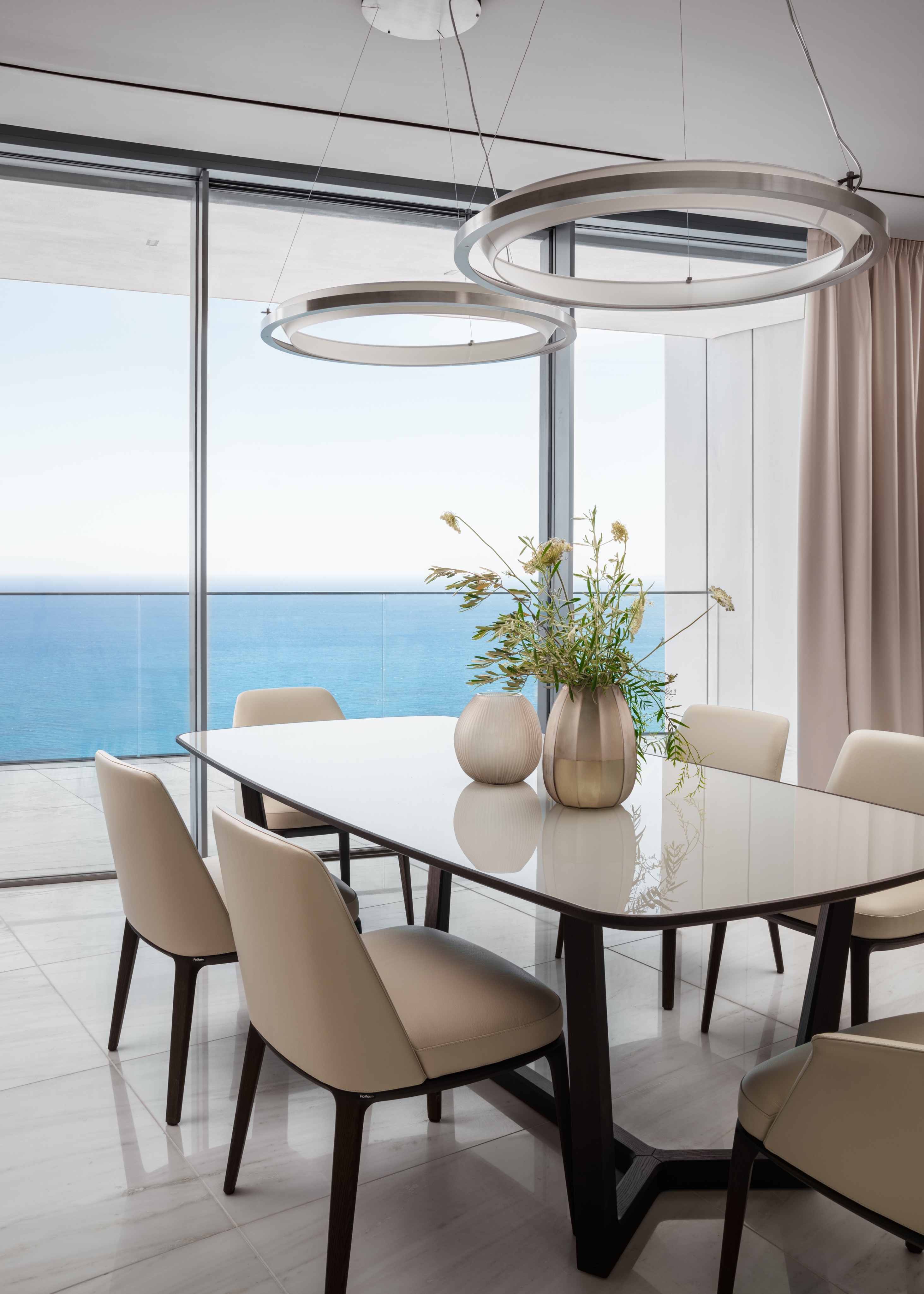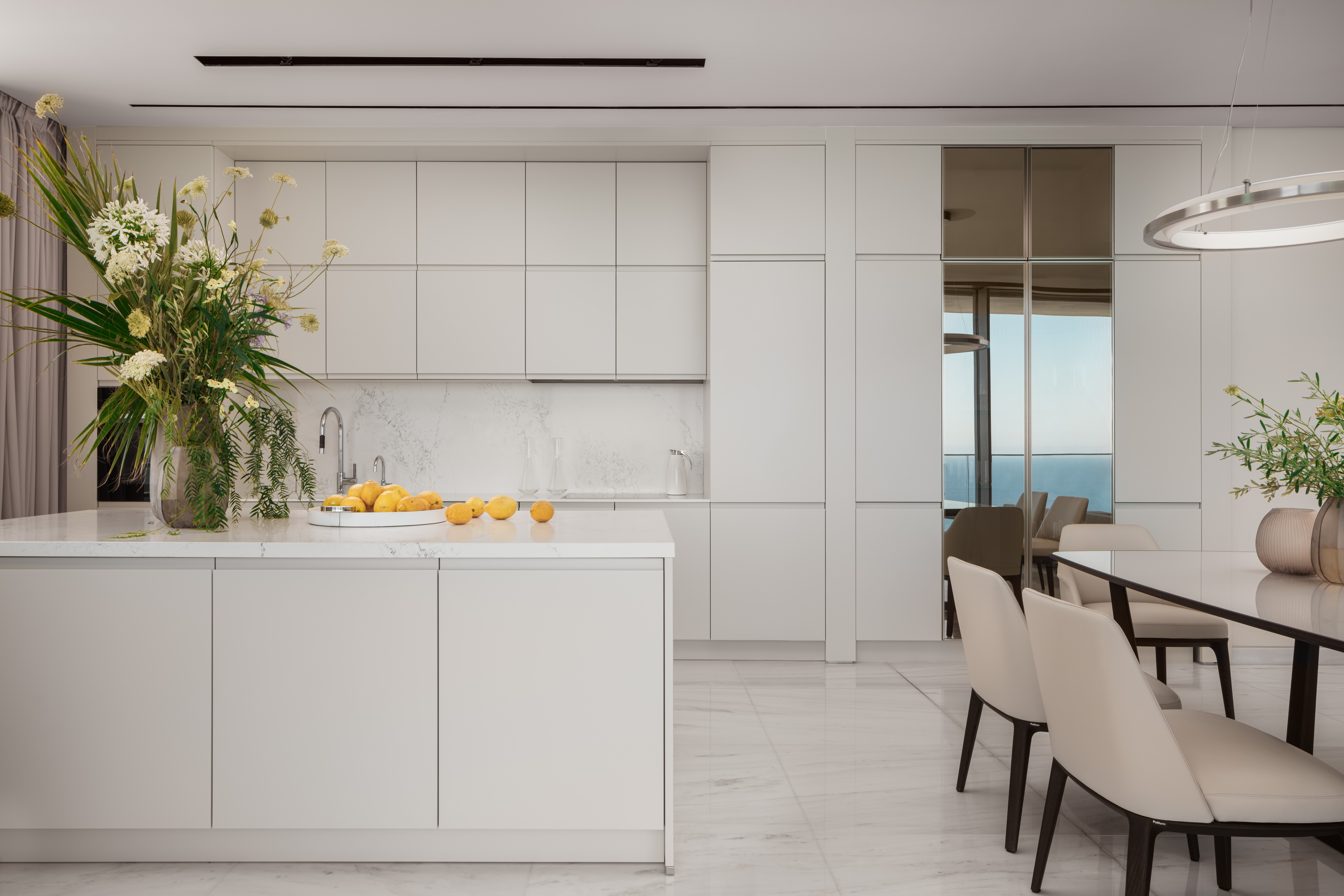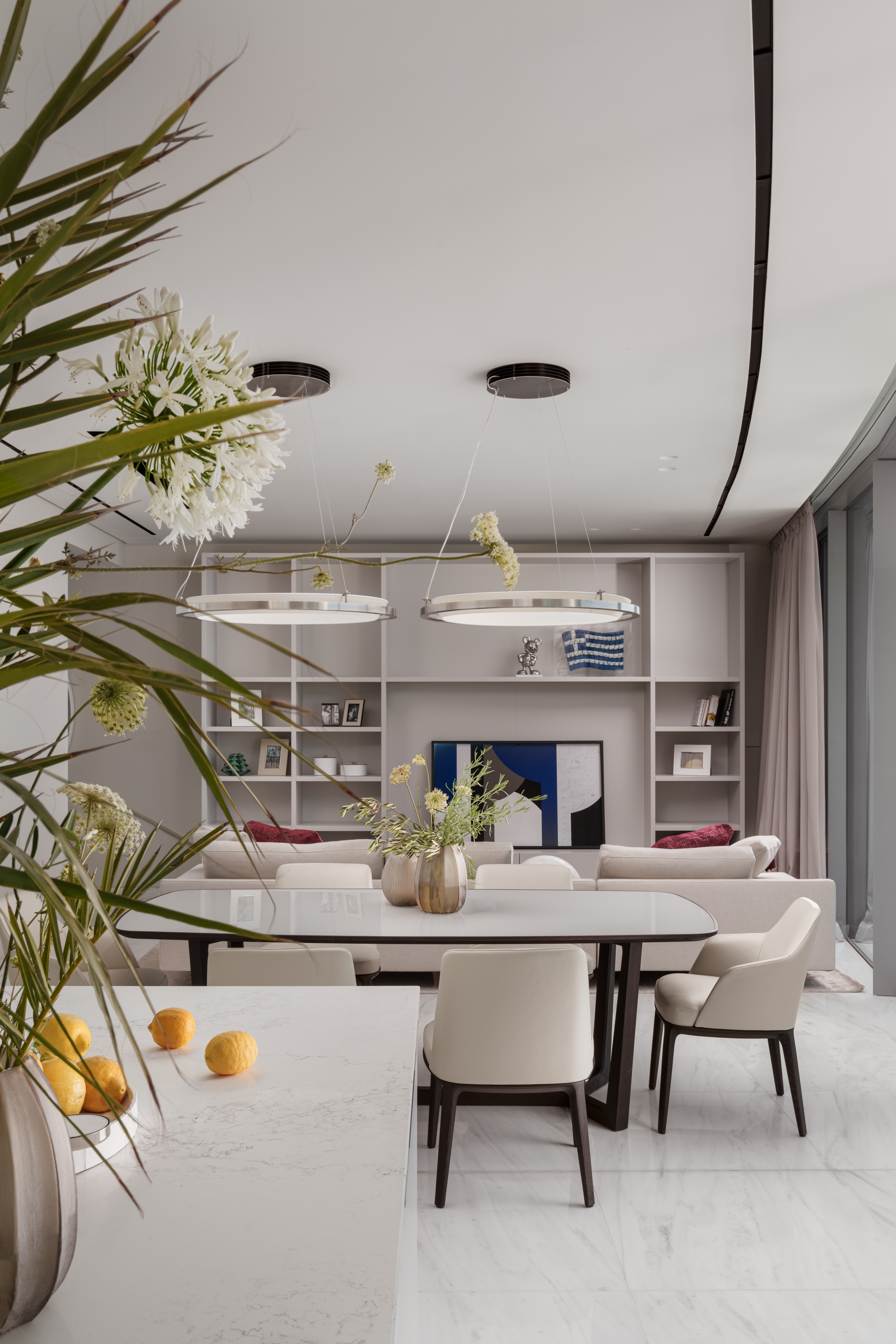 With an underlying effortless, minimalist-chic approach, the apartment's design style can be described as modern Mediterranean, characterized by the dominance of beige shades such as pearl, creamy, cotton, and seashell.