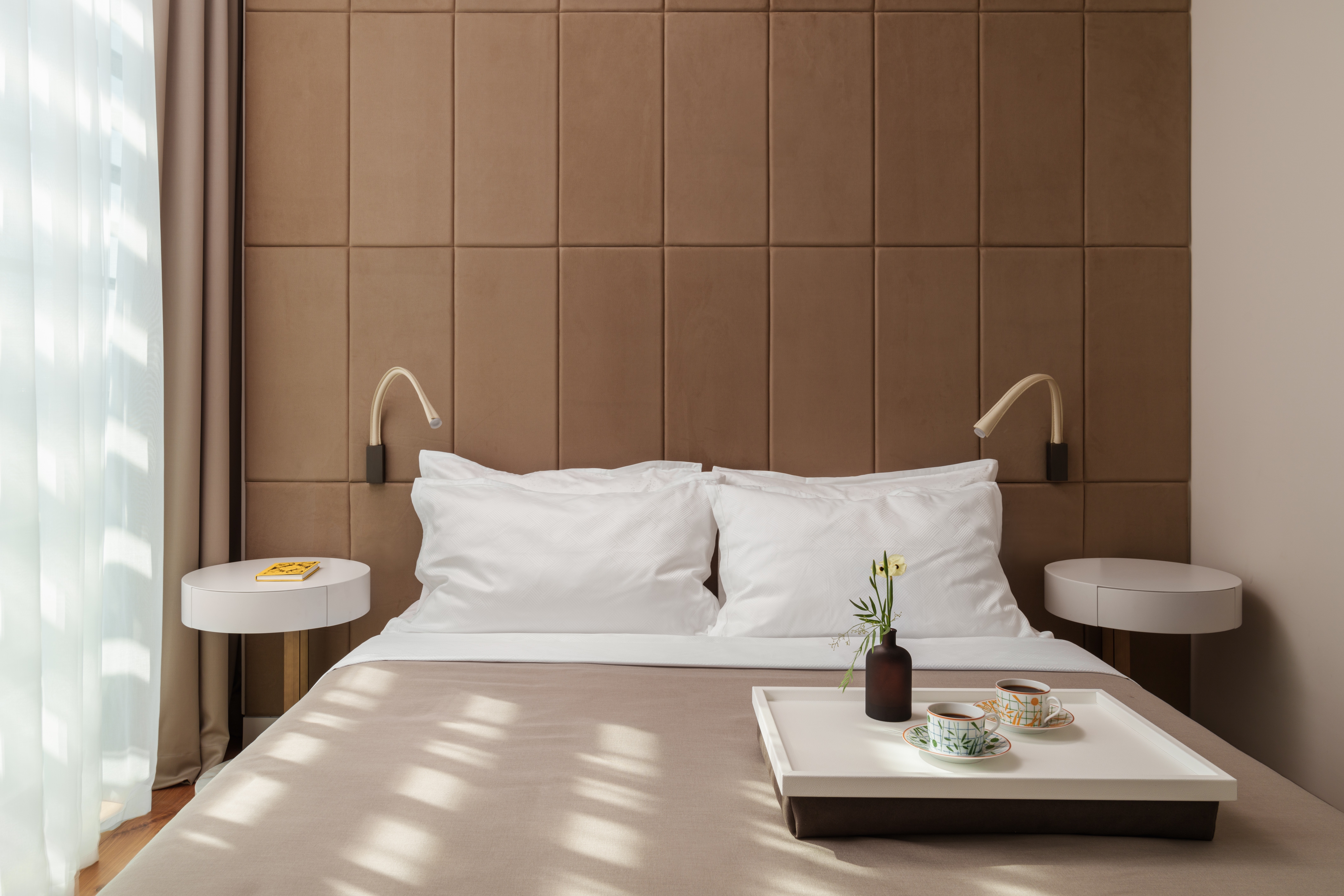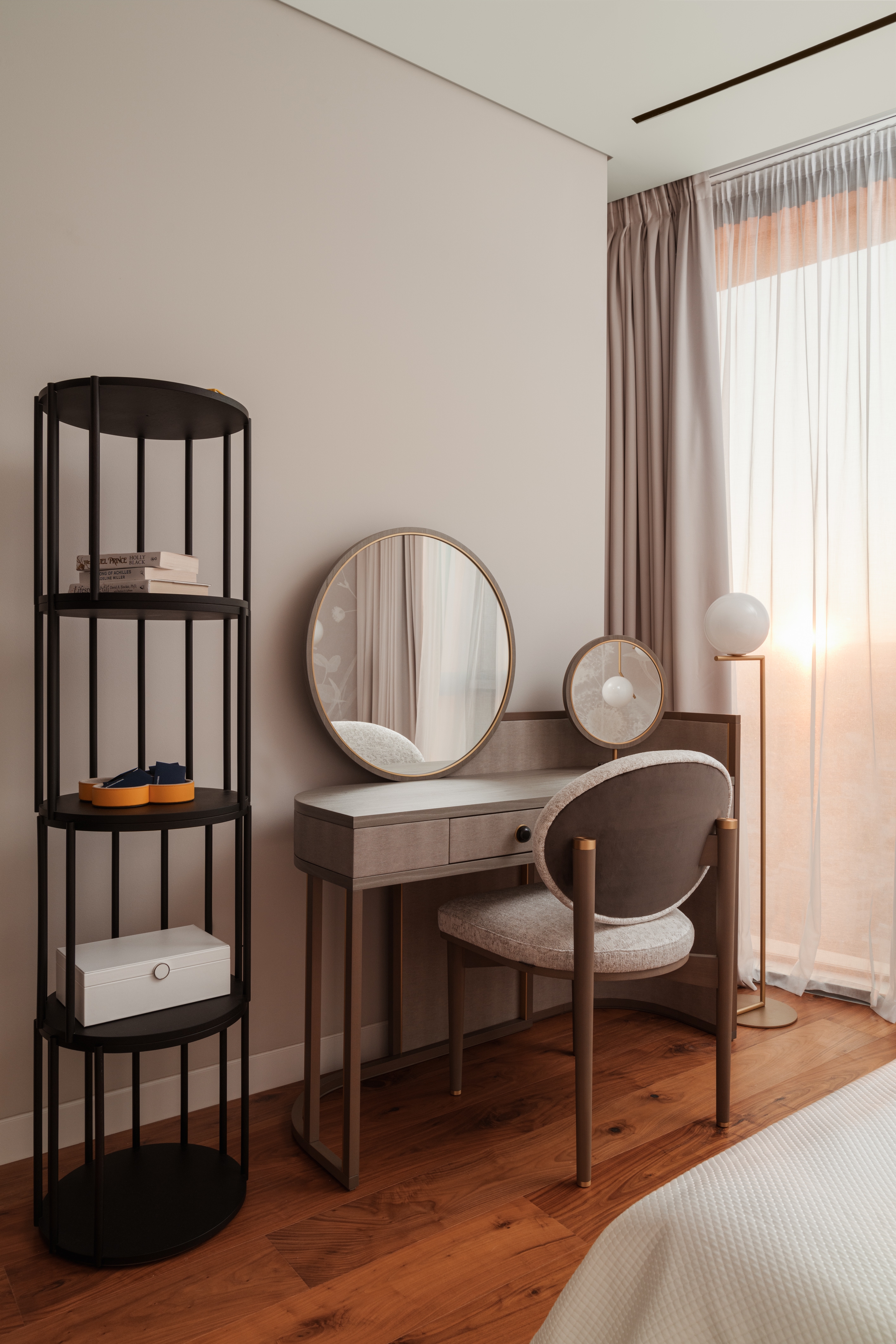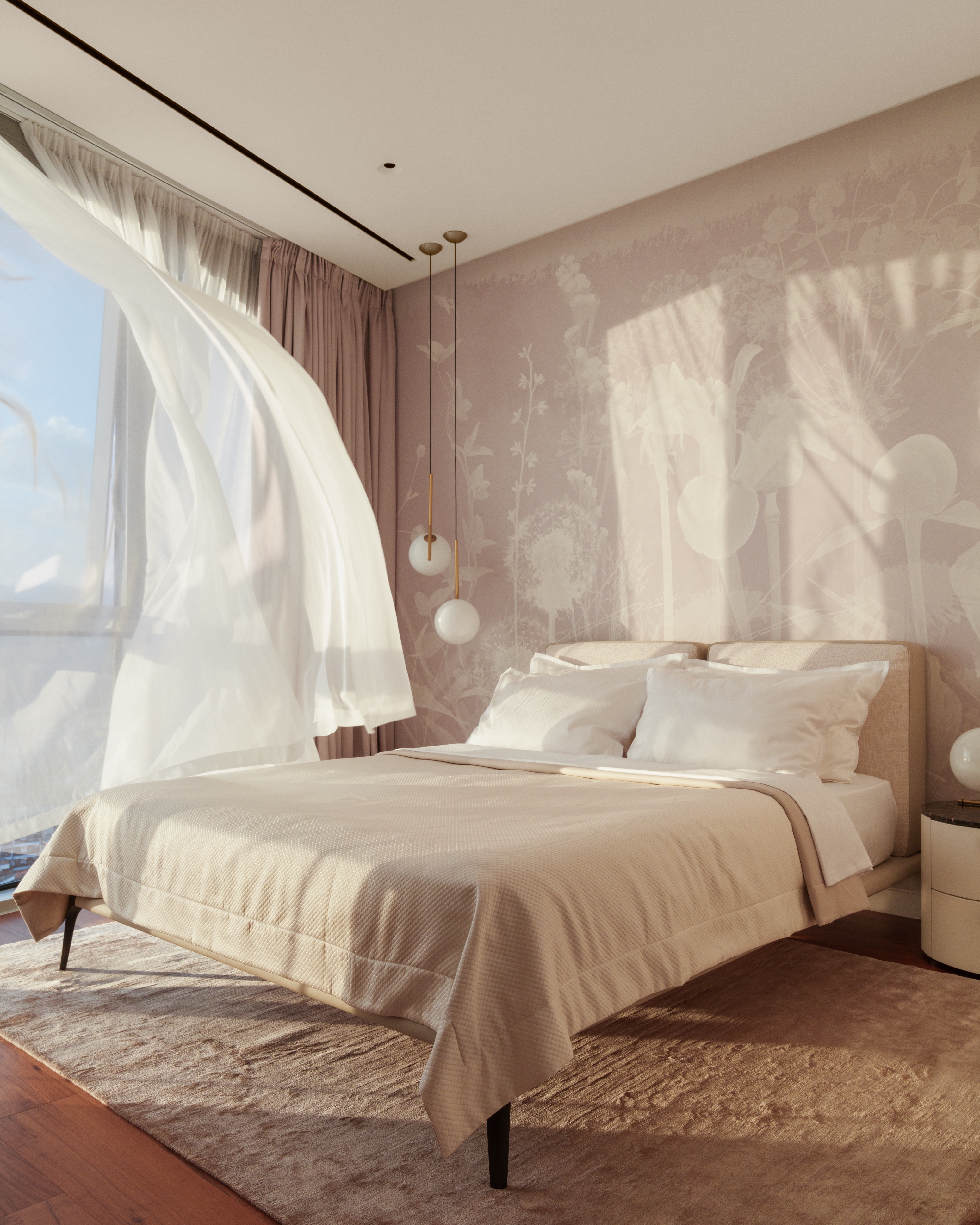 With an underlying effortless, minimalist-chic approach, the apartment's design style can be described as modern Mediterranean, characterized by the dominance of beige shades such as pearl, creamy, cotton, and seashell.