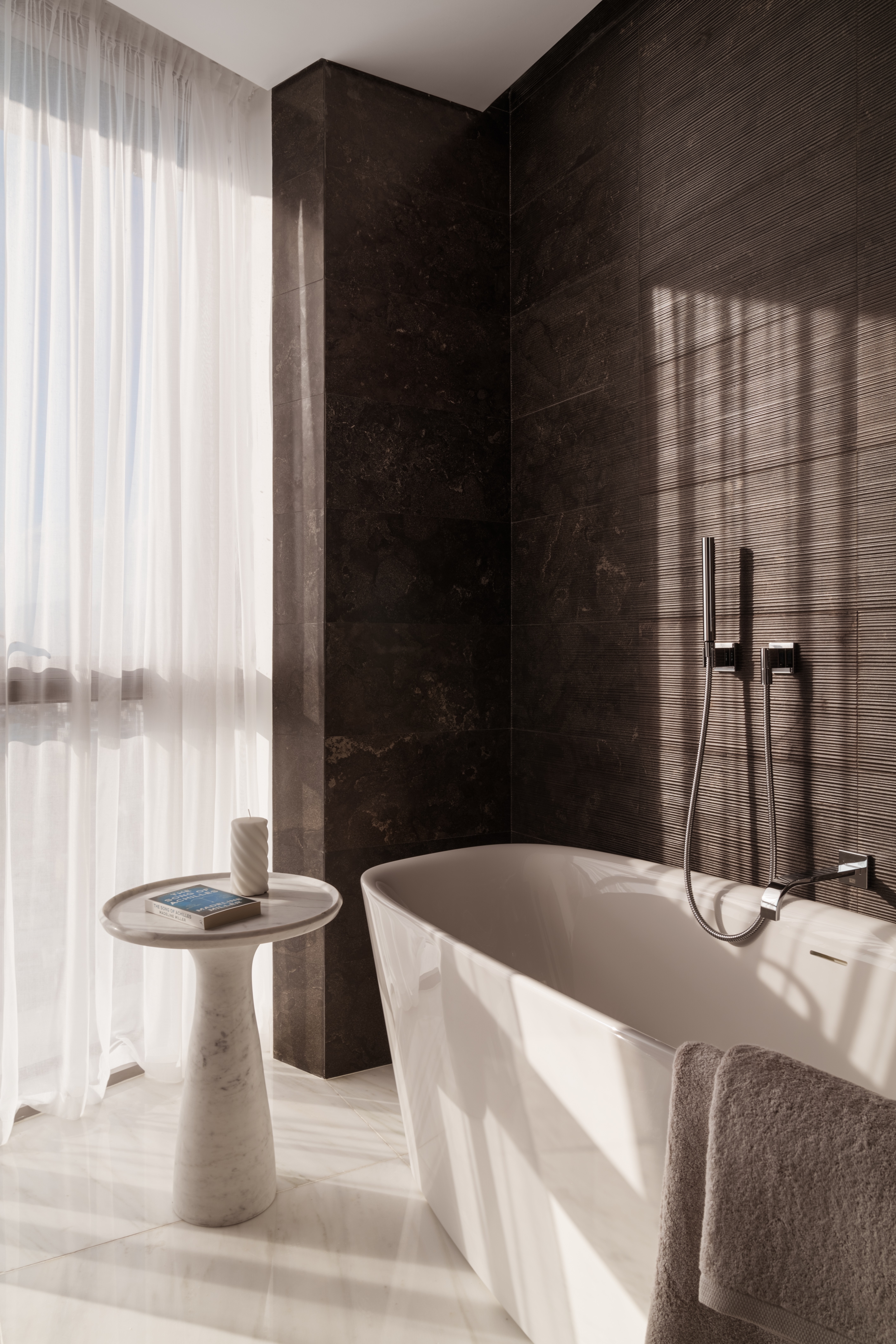 The most extensive challenge the design team faced while working on this project was altering the space's layout. Therefore, Nataly Bolshakova suggested creating a separate laundry room and wardrobe. Additionally, the team expanded the kitchen area by reconfiguring the layout and positioning a kitchen island closer to the spacious terrace. As a result, the apartment received a harmoniously organized space that seamlessly combines functionality and aesthetics.