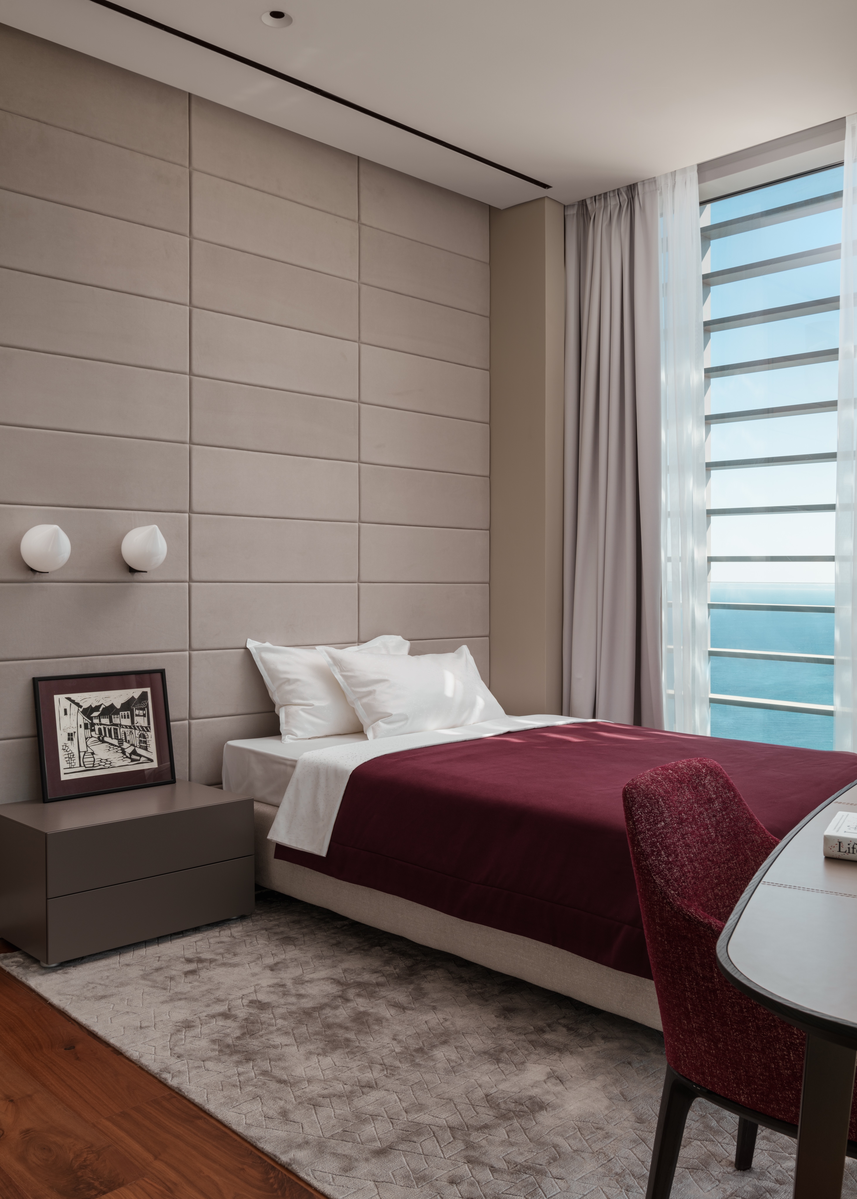 The 127 sq.m apartment comprises a master bedroom, a son’s room, a guest room, an open-space kitchen and living room, and a spacious terrace.