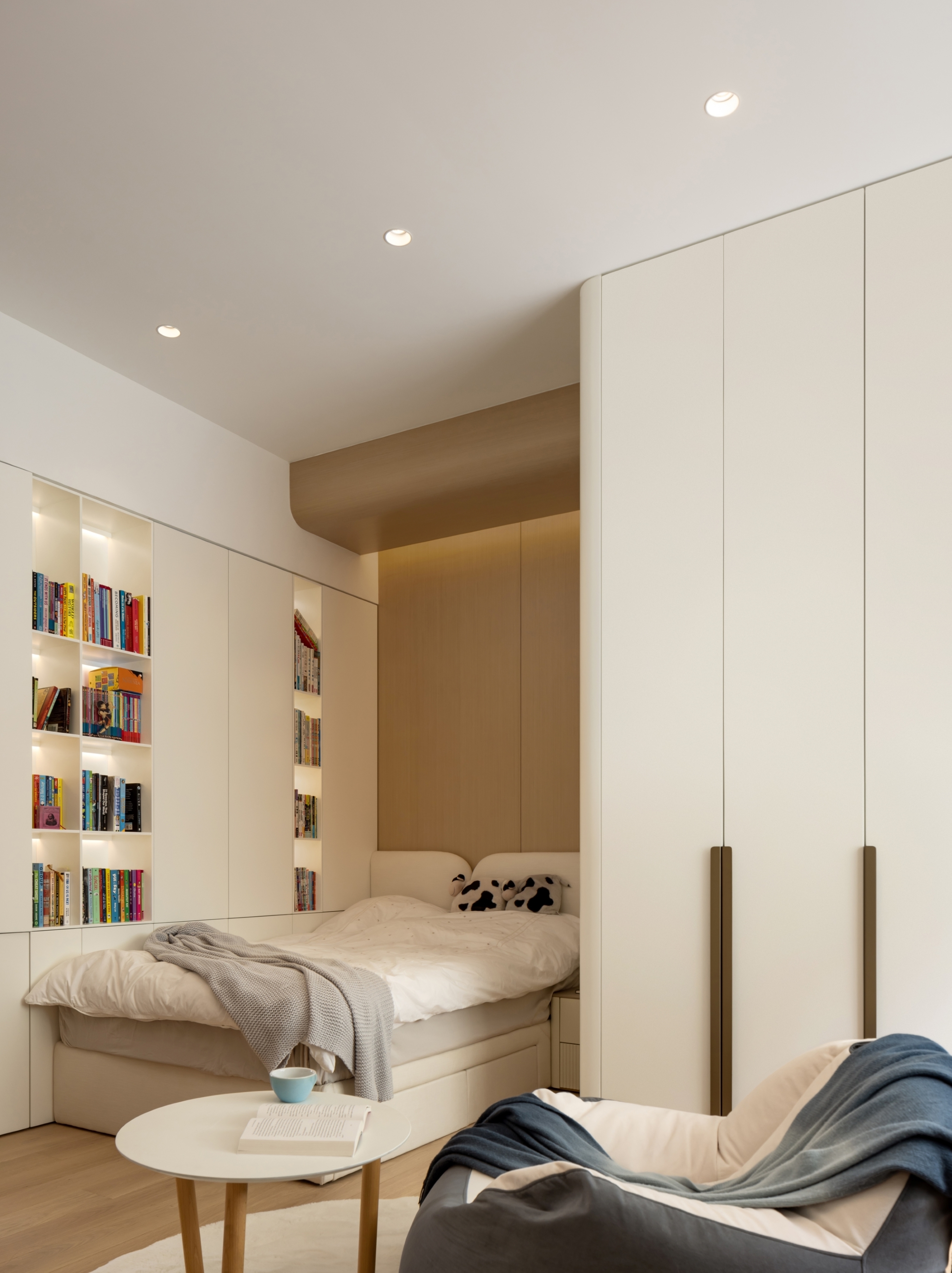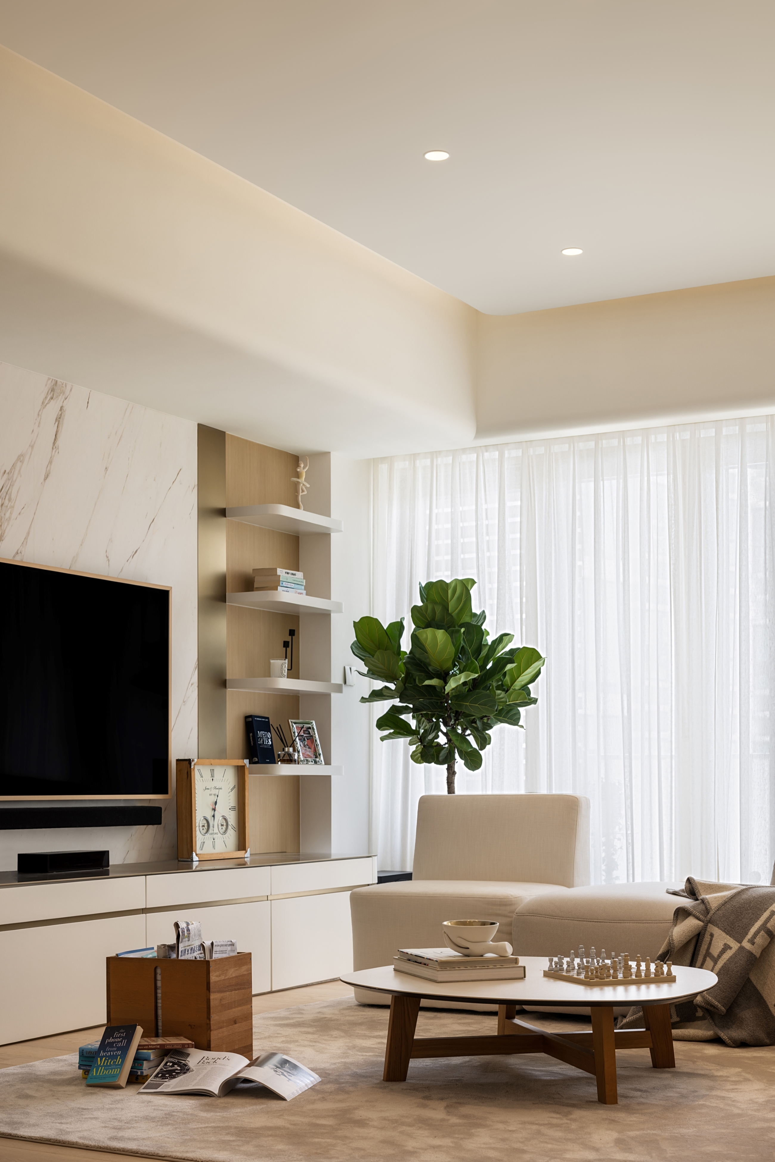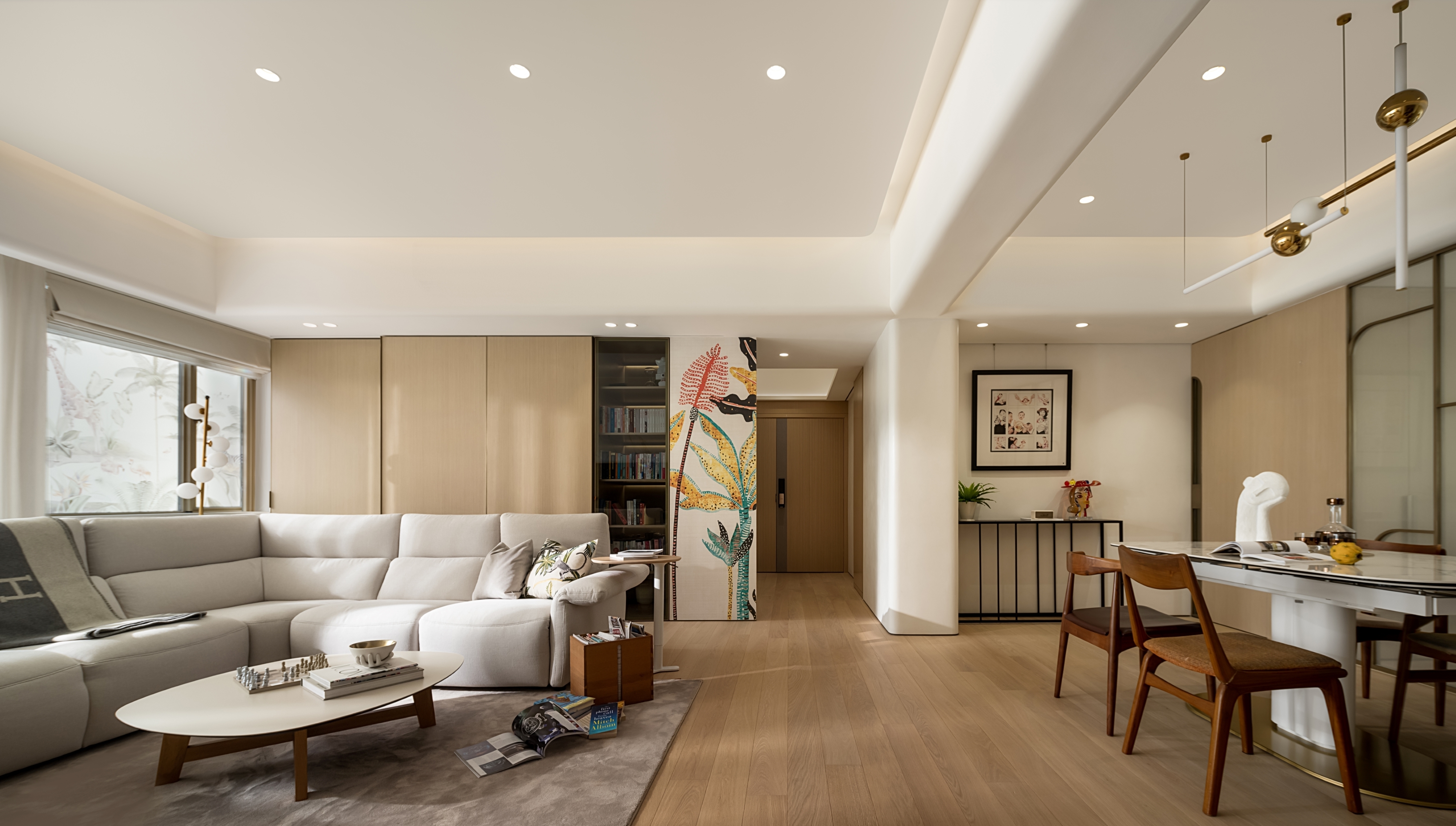 This residential project blends earthy tones, calming ambiance, and rounded silhouettes to create a peaceful living space amidst the urban landscape. The color palette is inspired by nature, with shades of beige, soft greys grounded by oaks and accented with muted blush and amber. The statement silhouettes and botanical wallpaper accentuates the owners’ taste in their abode, while also being durable and children-friendly. We create a calming atmosphere through the seamless flow between rooms, the rounded shapes in furniture, panels and space also soften rigid lines of this restful sanctuary.
