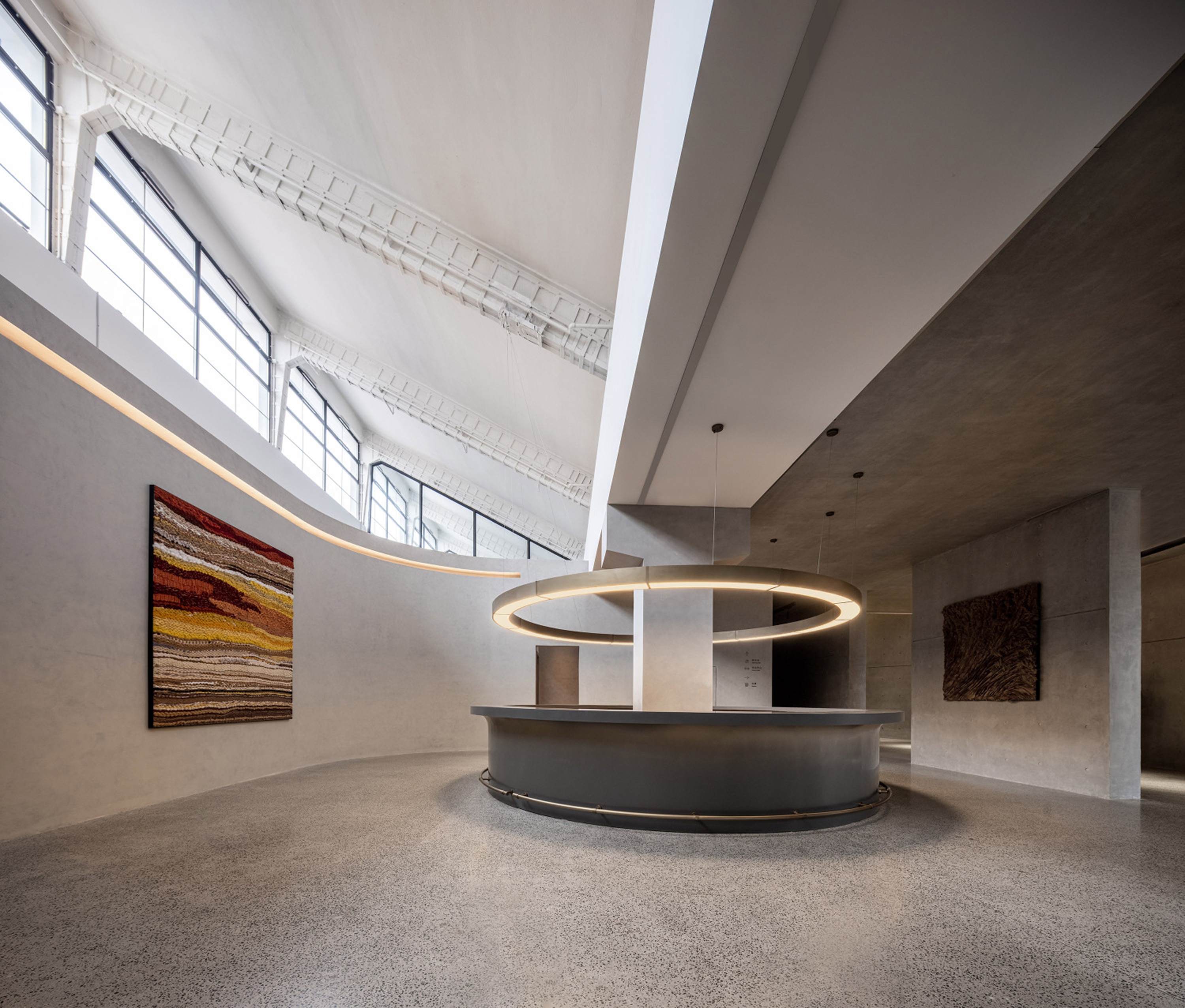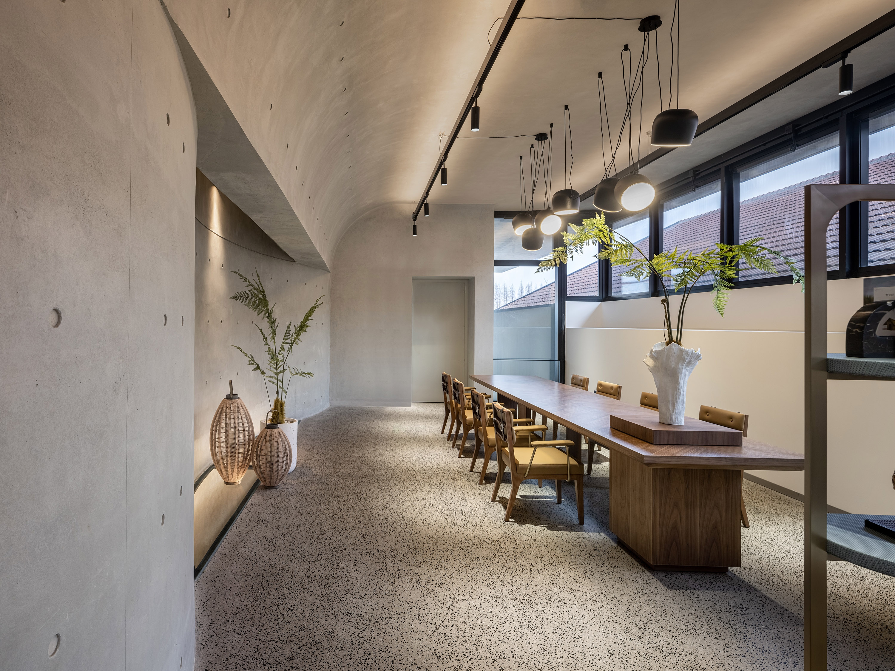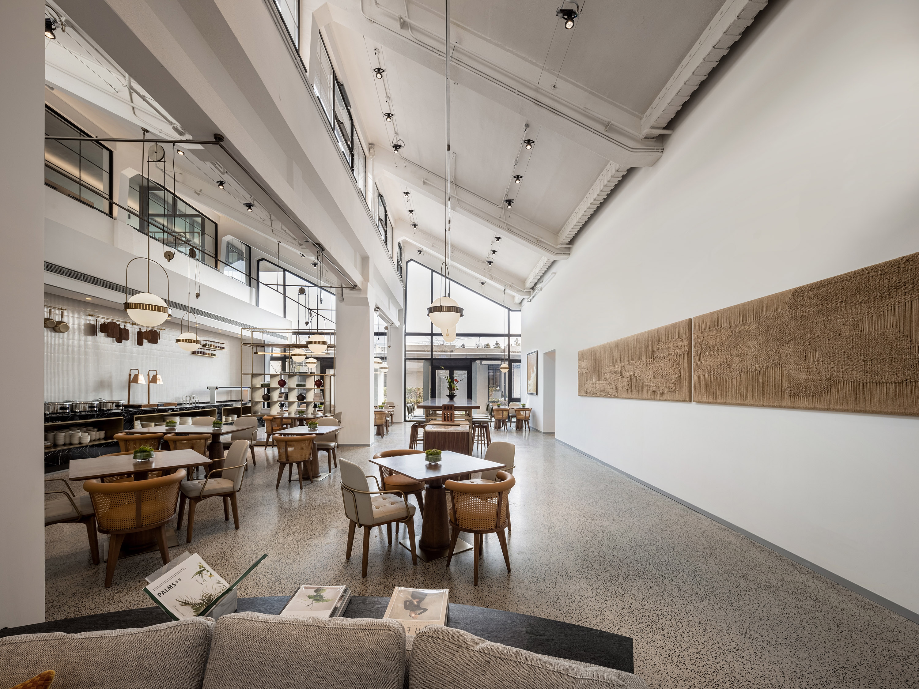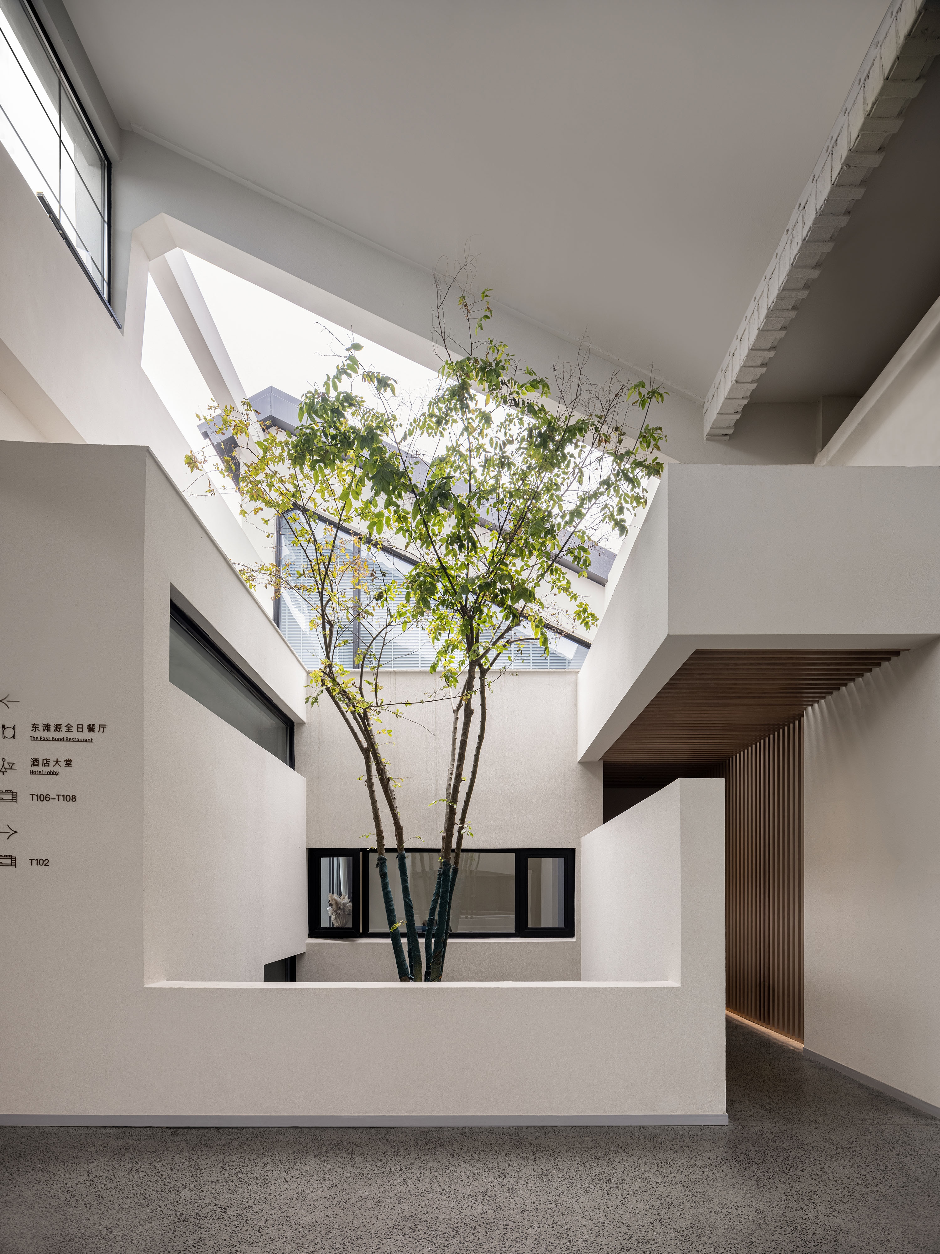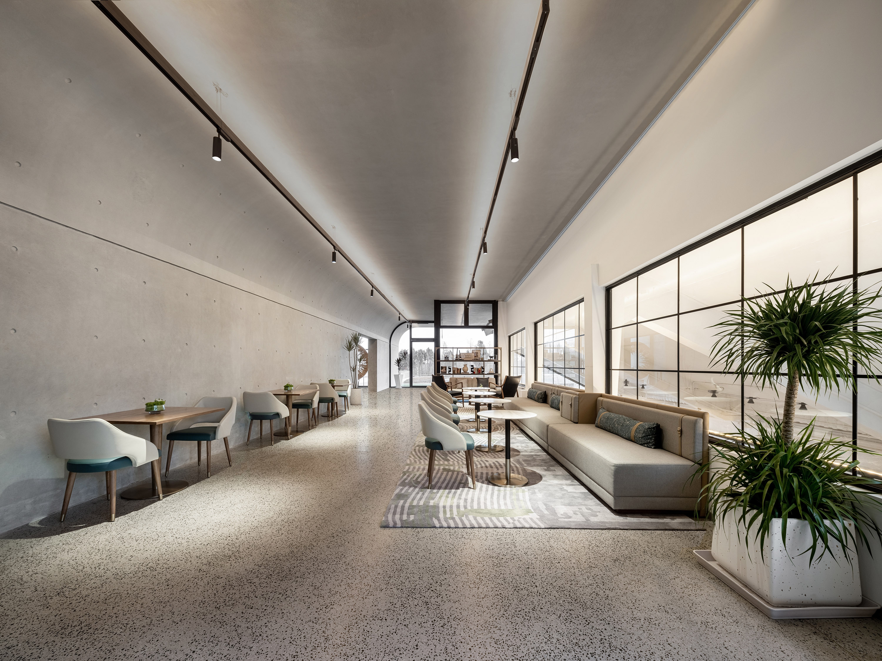 Interscape Design Associates elaborates vague historical memories and prospects for the future into its design language, in the hope of establishing a new model between farm and city; this is a space left blank, where the interior design sustains the fair-faced concrete texture of the building itself, it’s inclusive, non-exaggerated, rich and tasteful; this is a deconstruction of lights and shadows, breaking the norms, advocating for nature, harmonizing the space, and switching functions within steps in extremely simplistic moving lines.