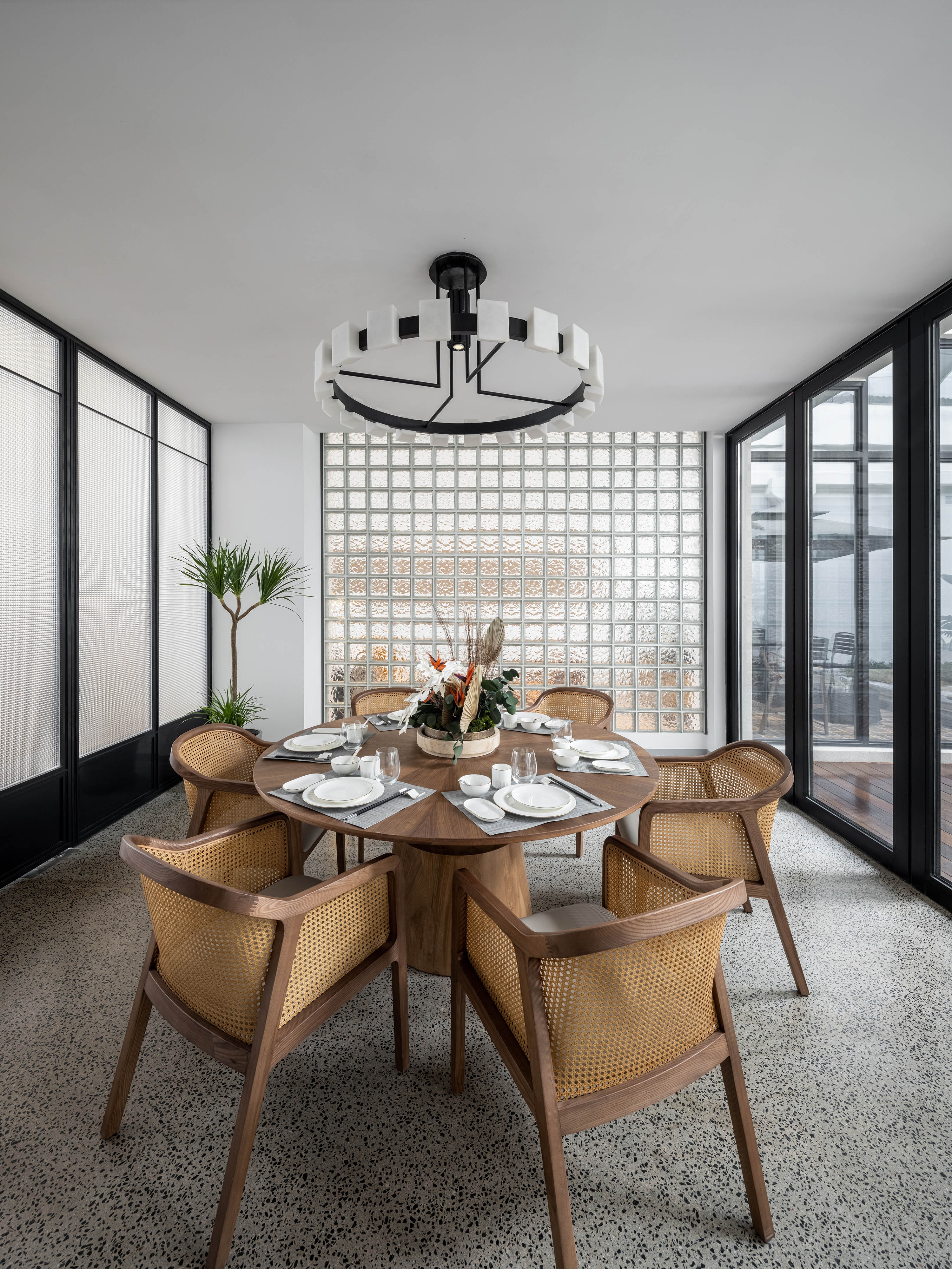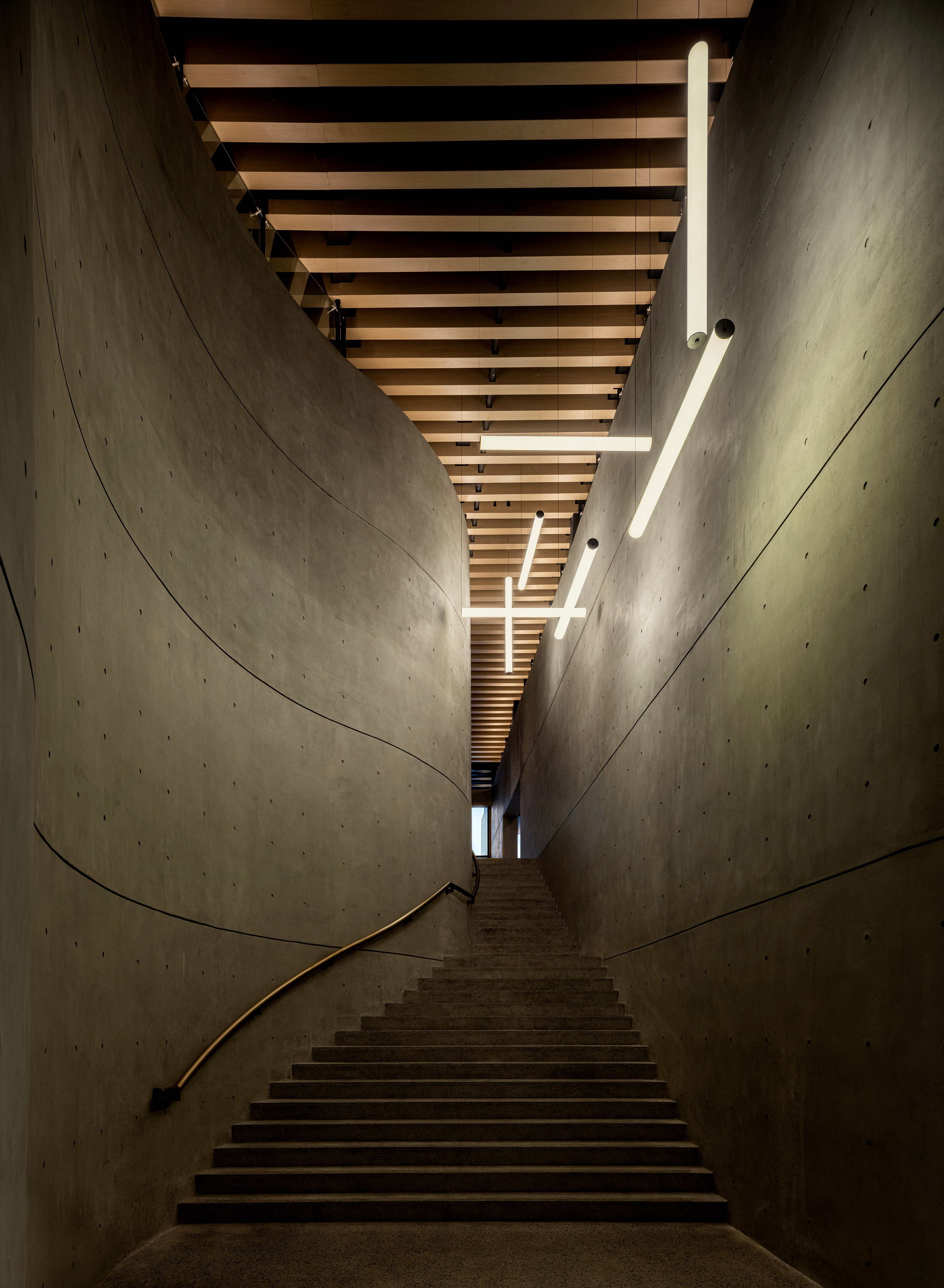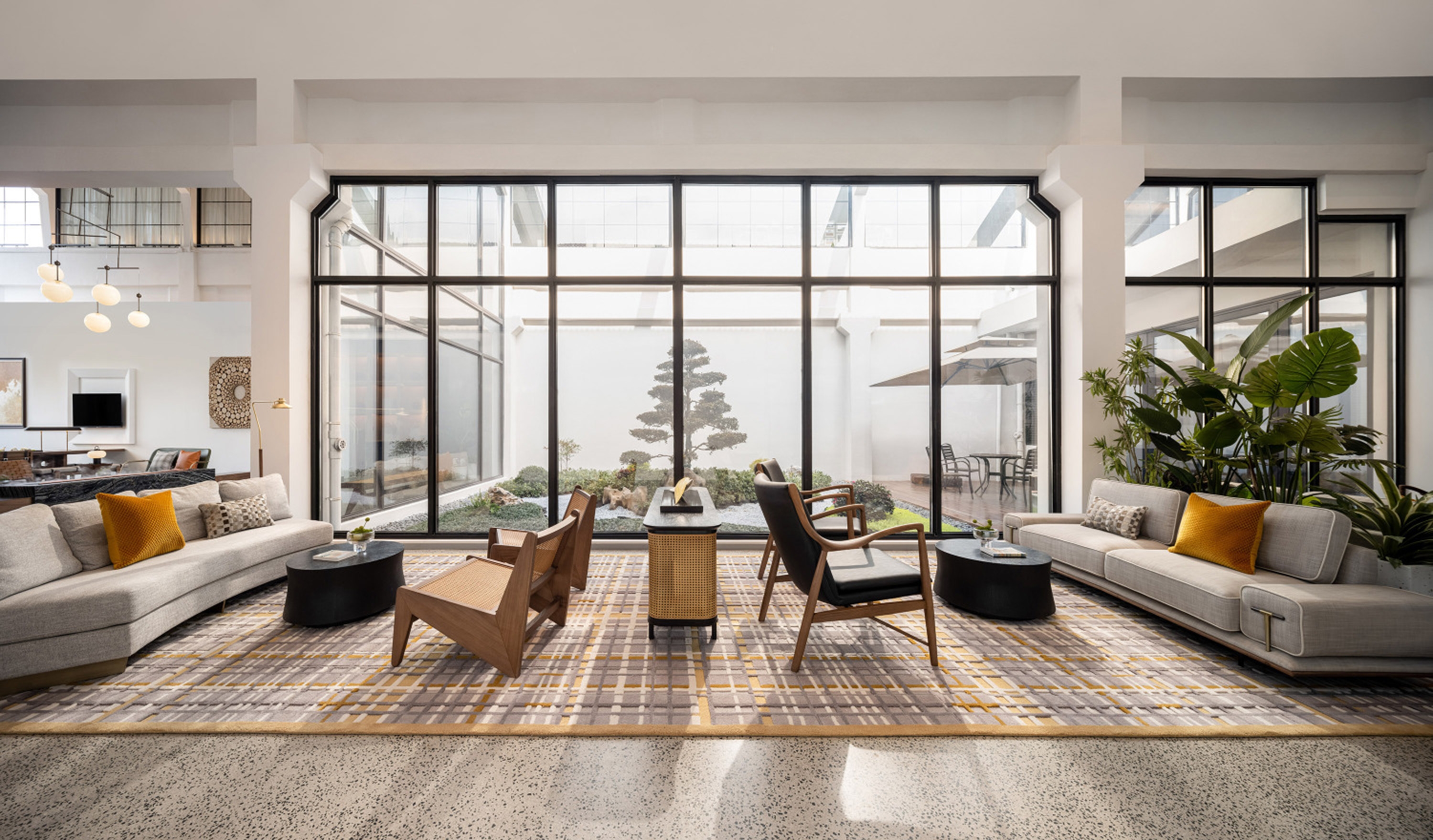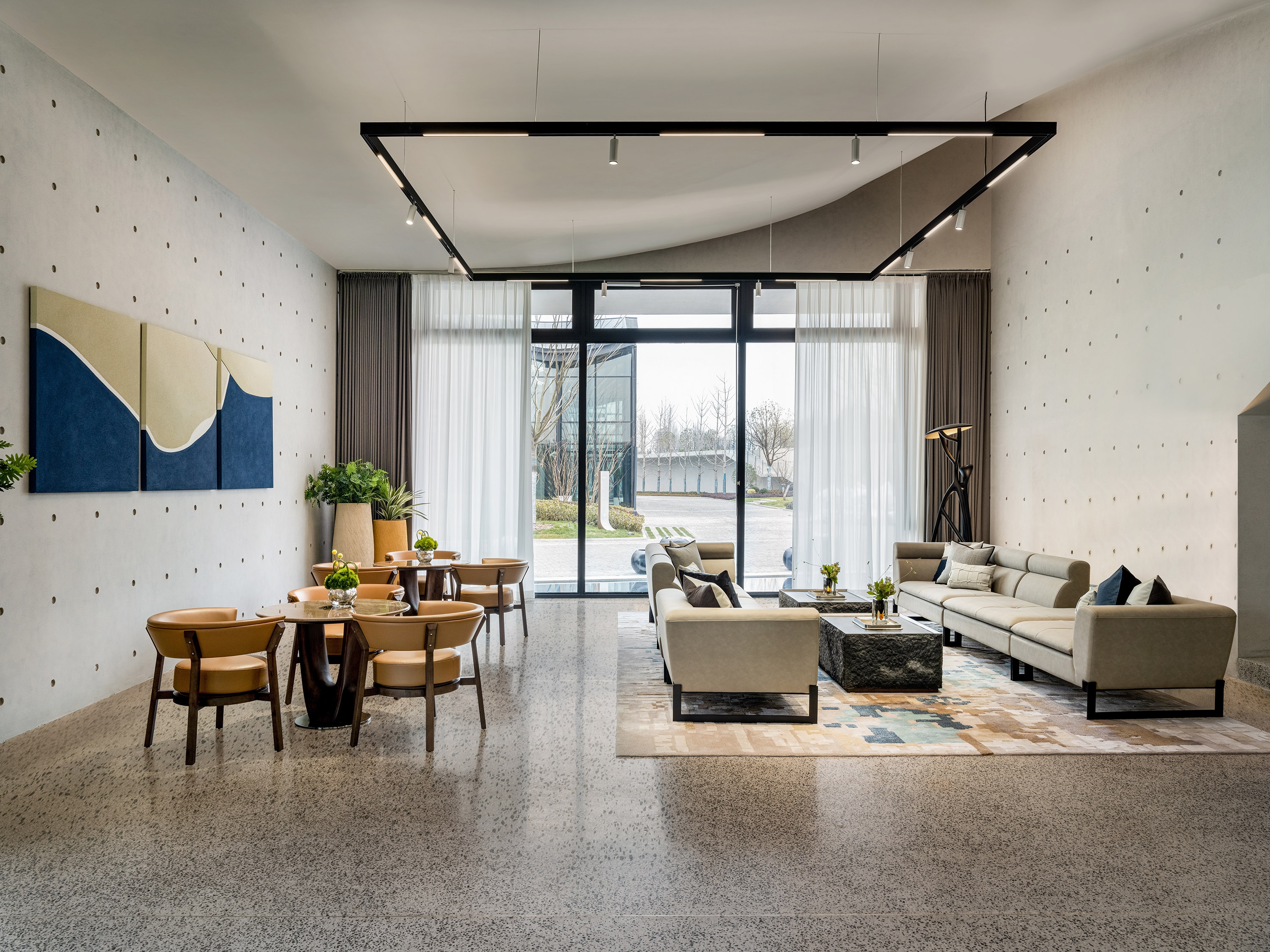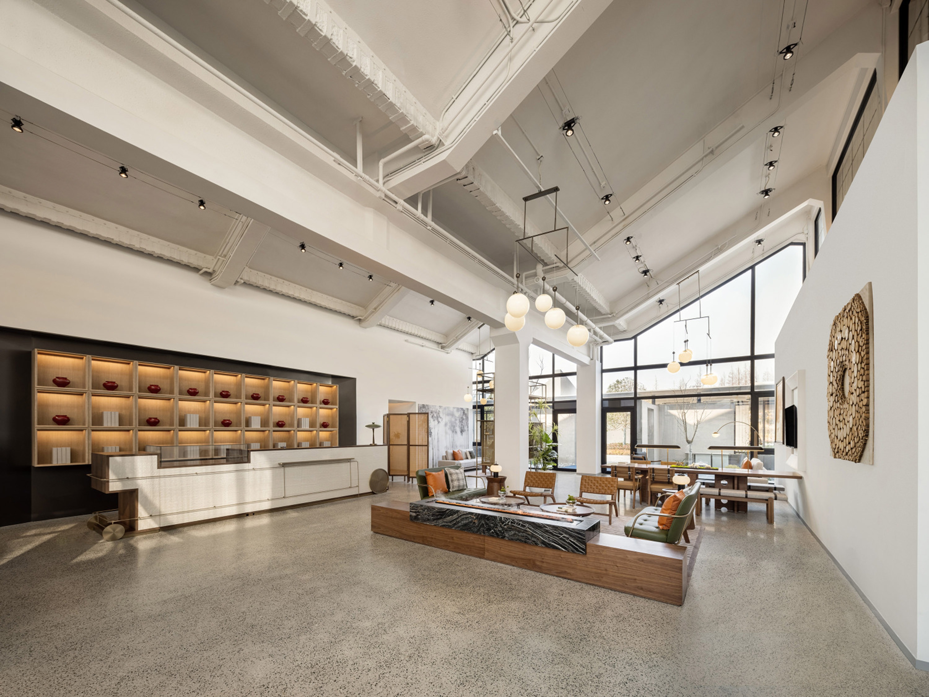 Interscape Design Associates elaborates vague historical memories and prospects for the future into its design language, in the hope of establishing a new model between farm and city; this is a space left blank, where the interior design sustains the fair-faced concrete texture of the building itself, it’s inclusive, non-exaggerated, rich and tasteful; this is a deconstruction of lights and shadows, breaking the norms, advocating for nature, harmonizing the space, and switching functions within steps in extremely simplistic moving lines.