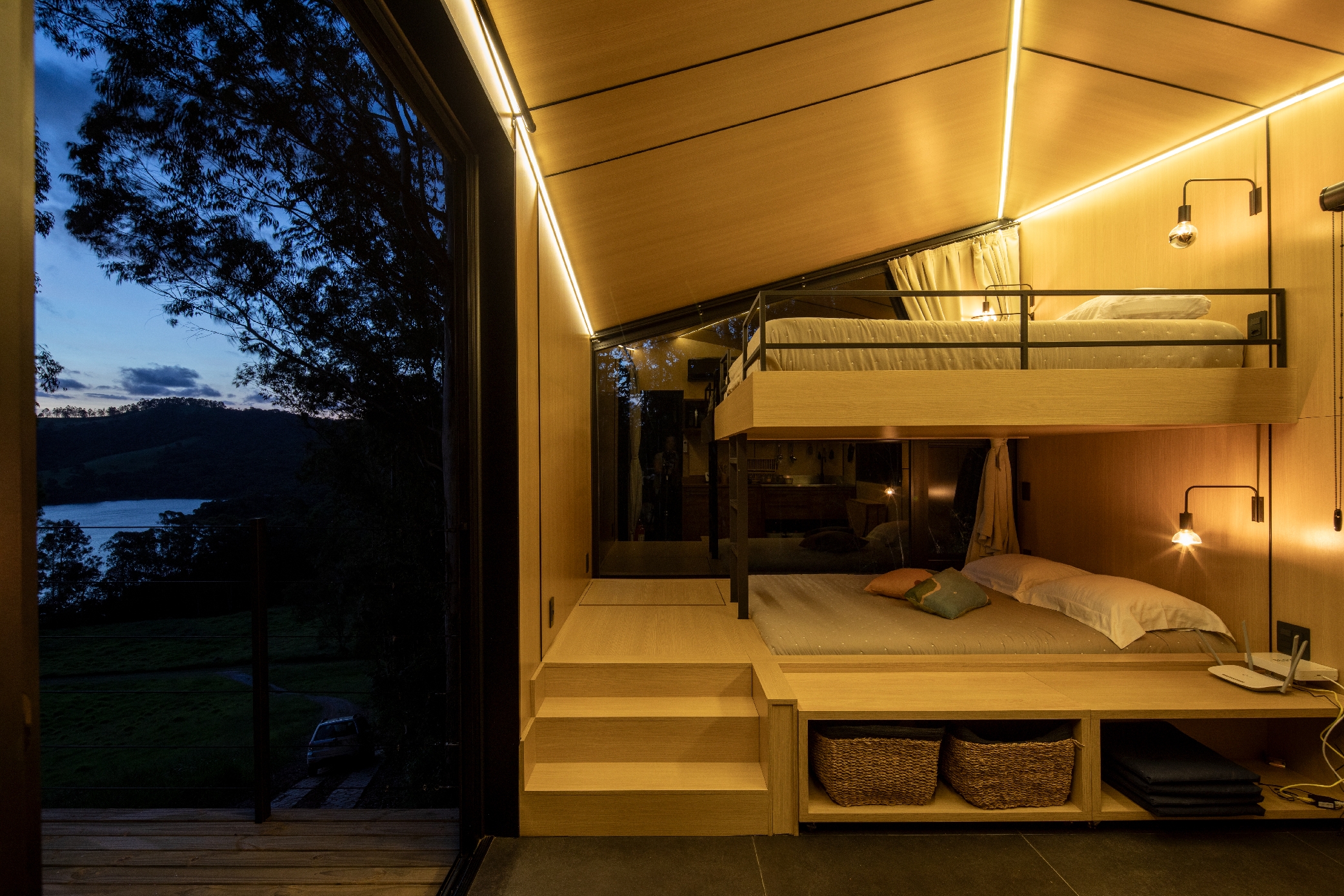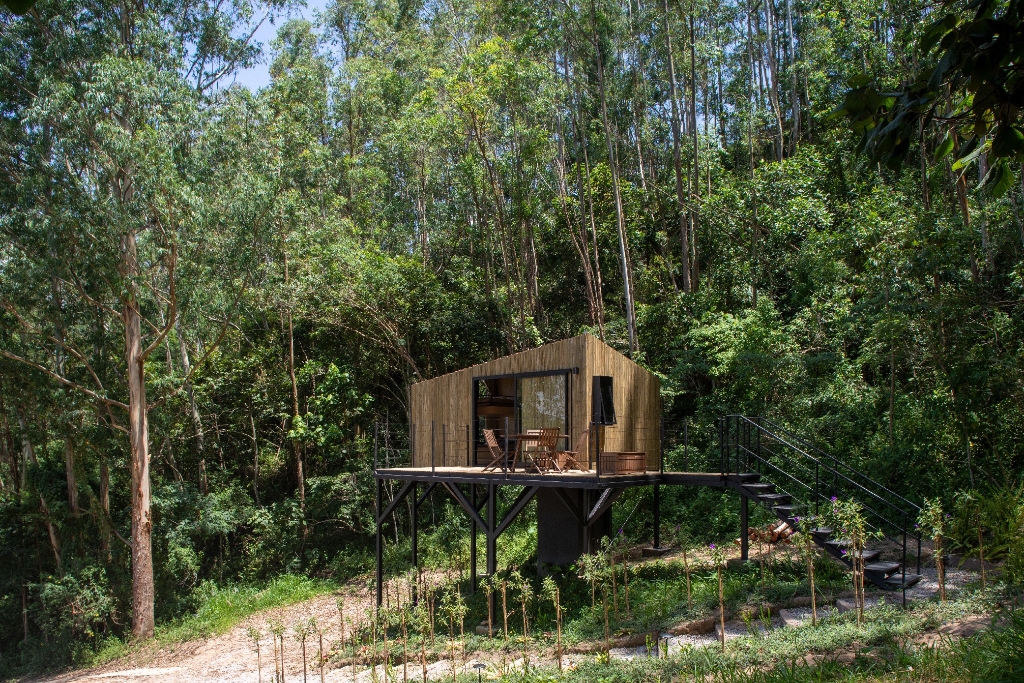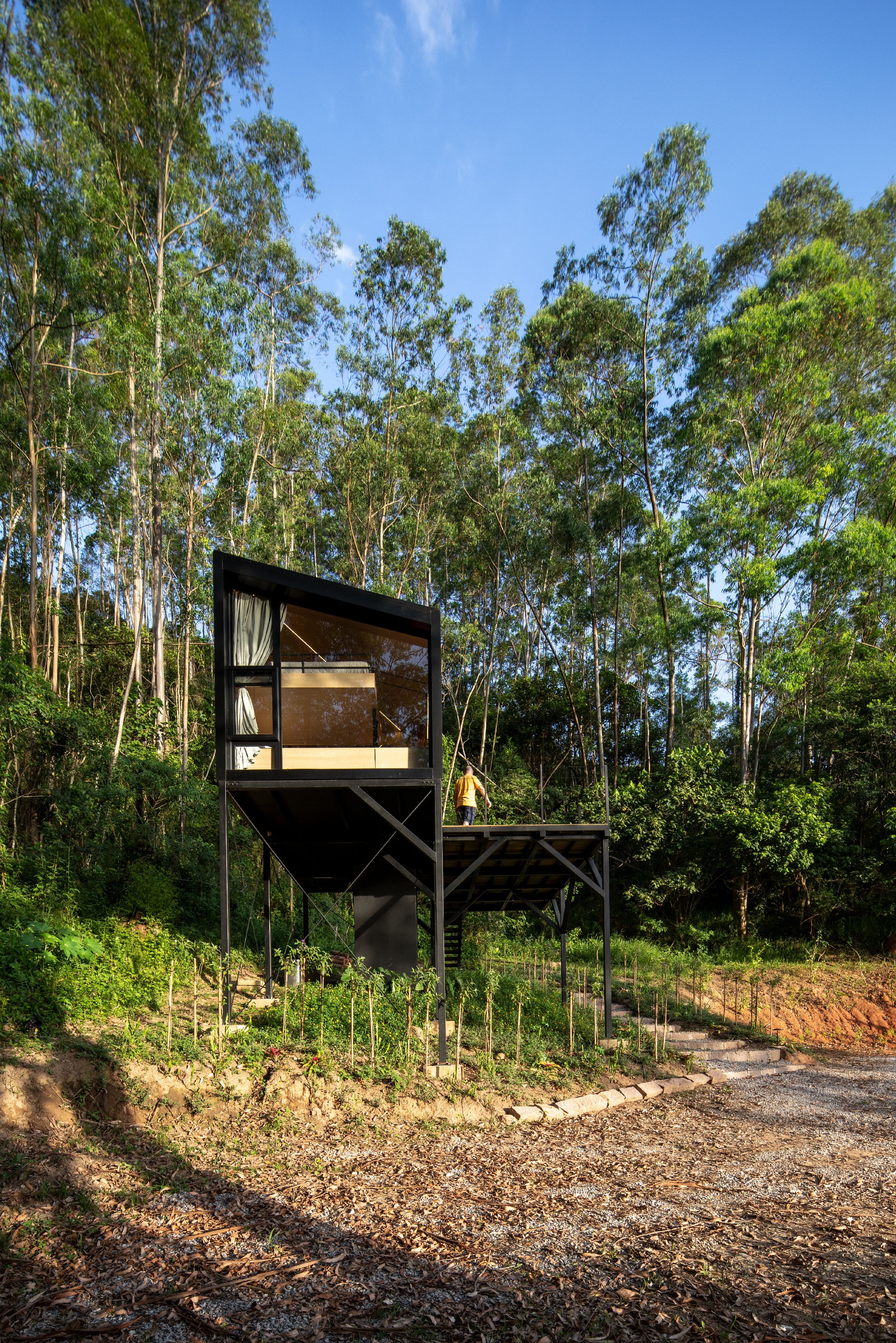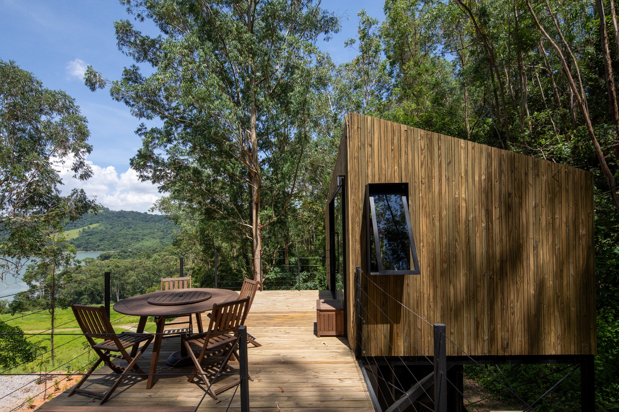 Altar Ninho is a unique refuge at Pedra Alta farm, offering an exclusive stay in a house elevated among trees, providing stunning views of Joanópolis Reservoir in São Paulo, Brazil. The innovative tiny house, nestled in the Atlantic Forest, features a queen-size bunk bed overlooking the reservoir, an outdoor deck, and a bathroom with a zenithal opening for bathing with views of the sky and treetops.