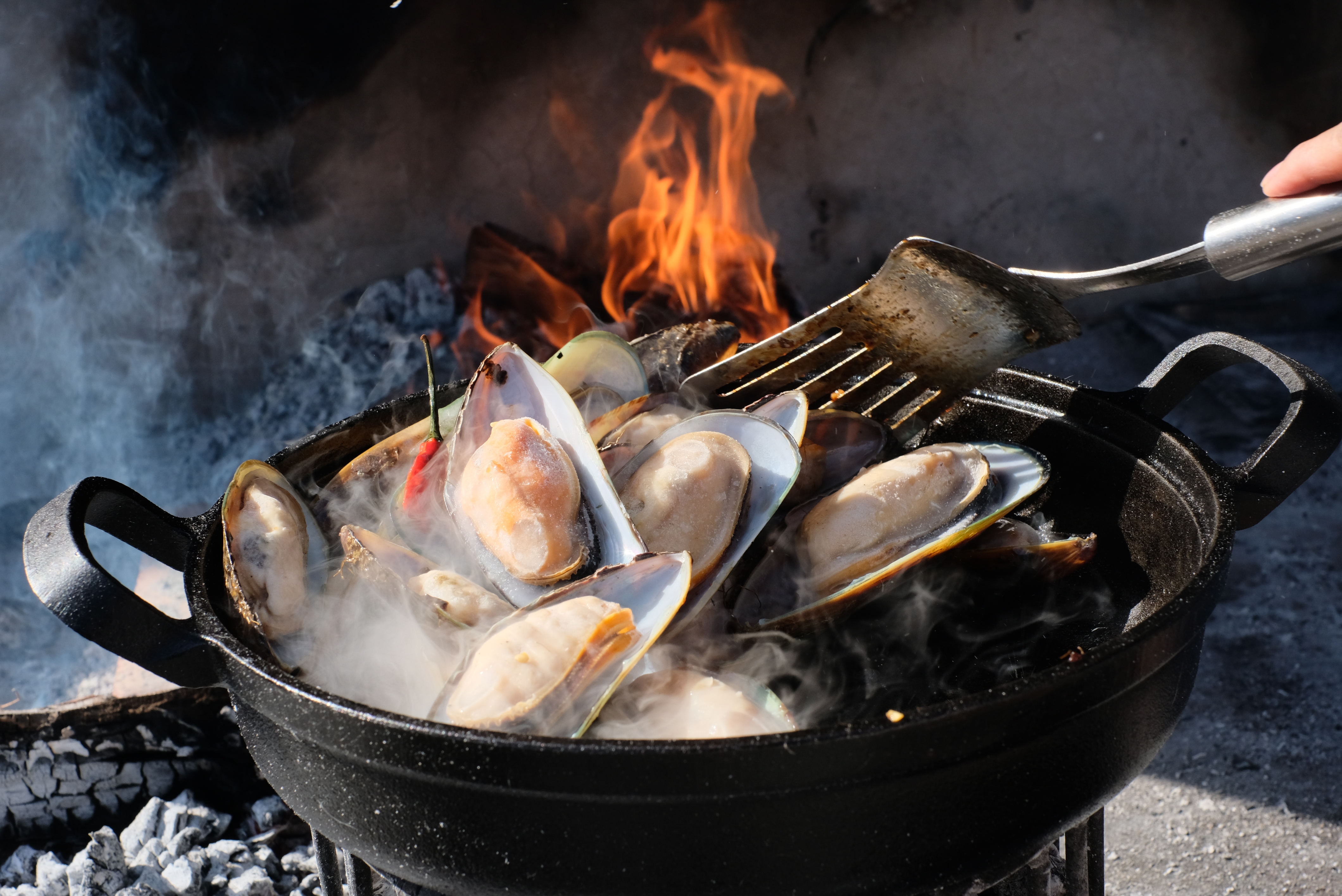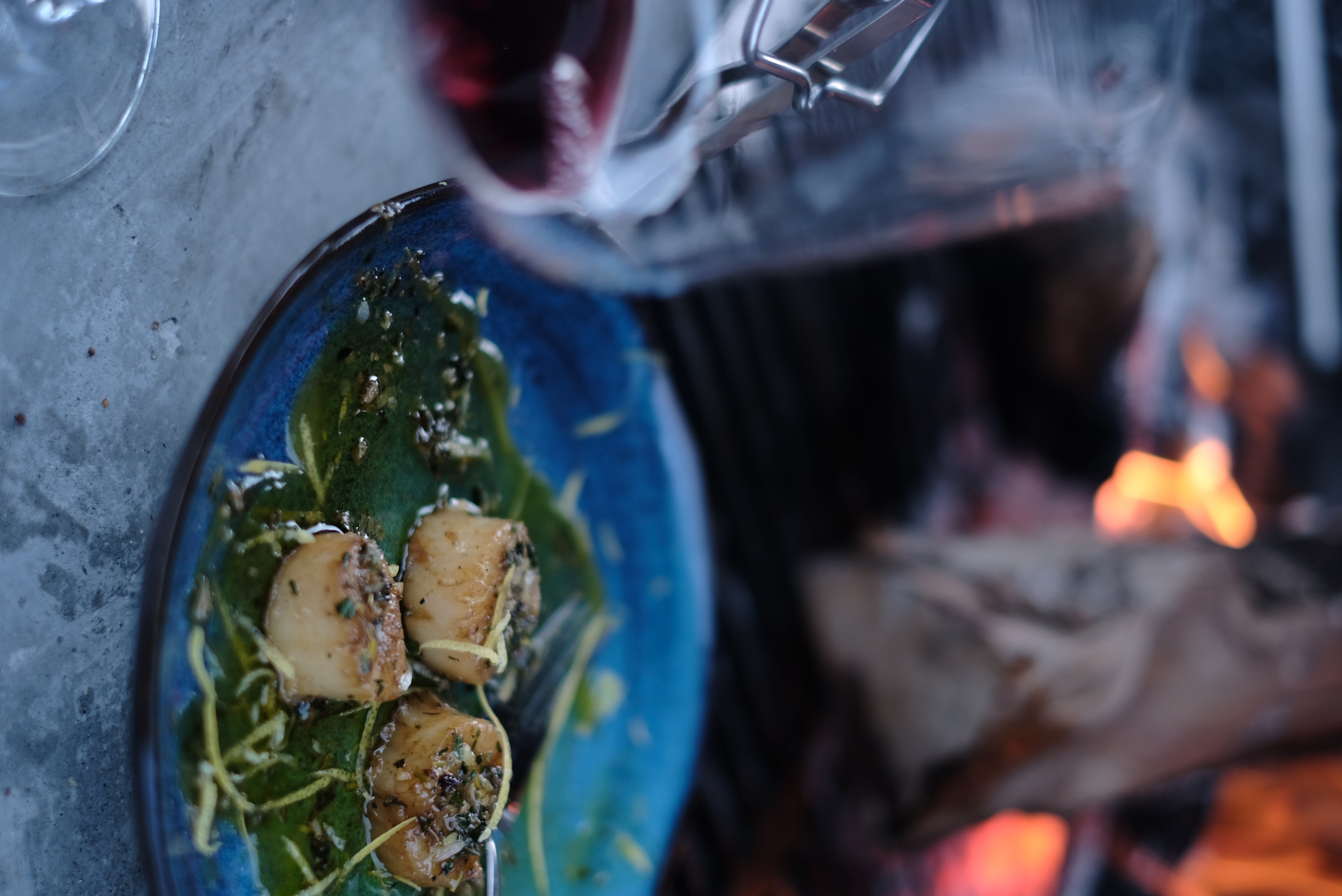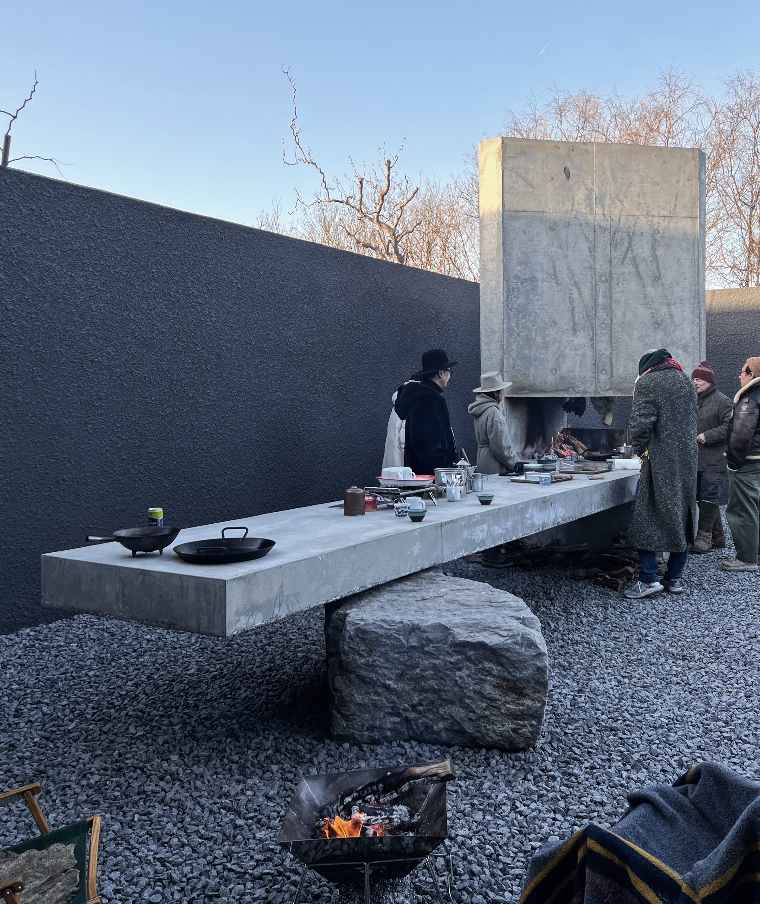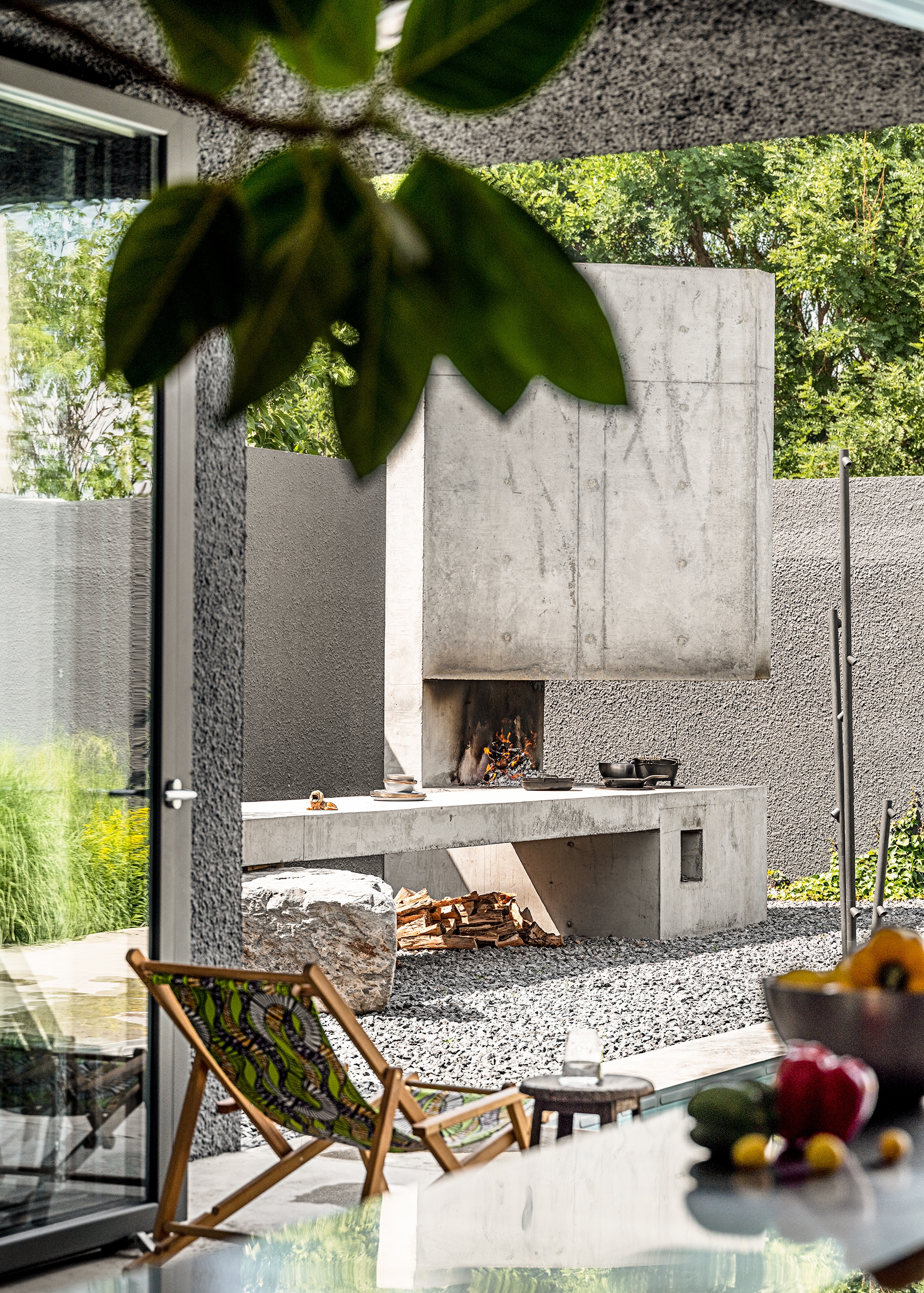 The outdoor kitchen design takes cues from brutalist buildings. The main volume of the concrete cubature serves as a fireplace, an open-fire kitchen, a stove with two solid steel cooking plates, and a smoking hood. The 7-meter-long concrete dining table rests on a 1000 kg heavy rock. The clients asked for an outdoor BBQ area for people to gather around the fire to participate in the cooking process. The open-fire kitchen brings friends and family a unique BBQ and cooking experience. The combination of the kitchen, bar, and outdoor dining table creates a vibrant social space.
