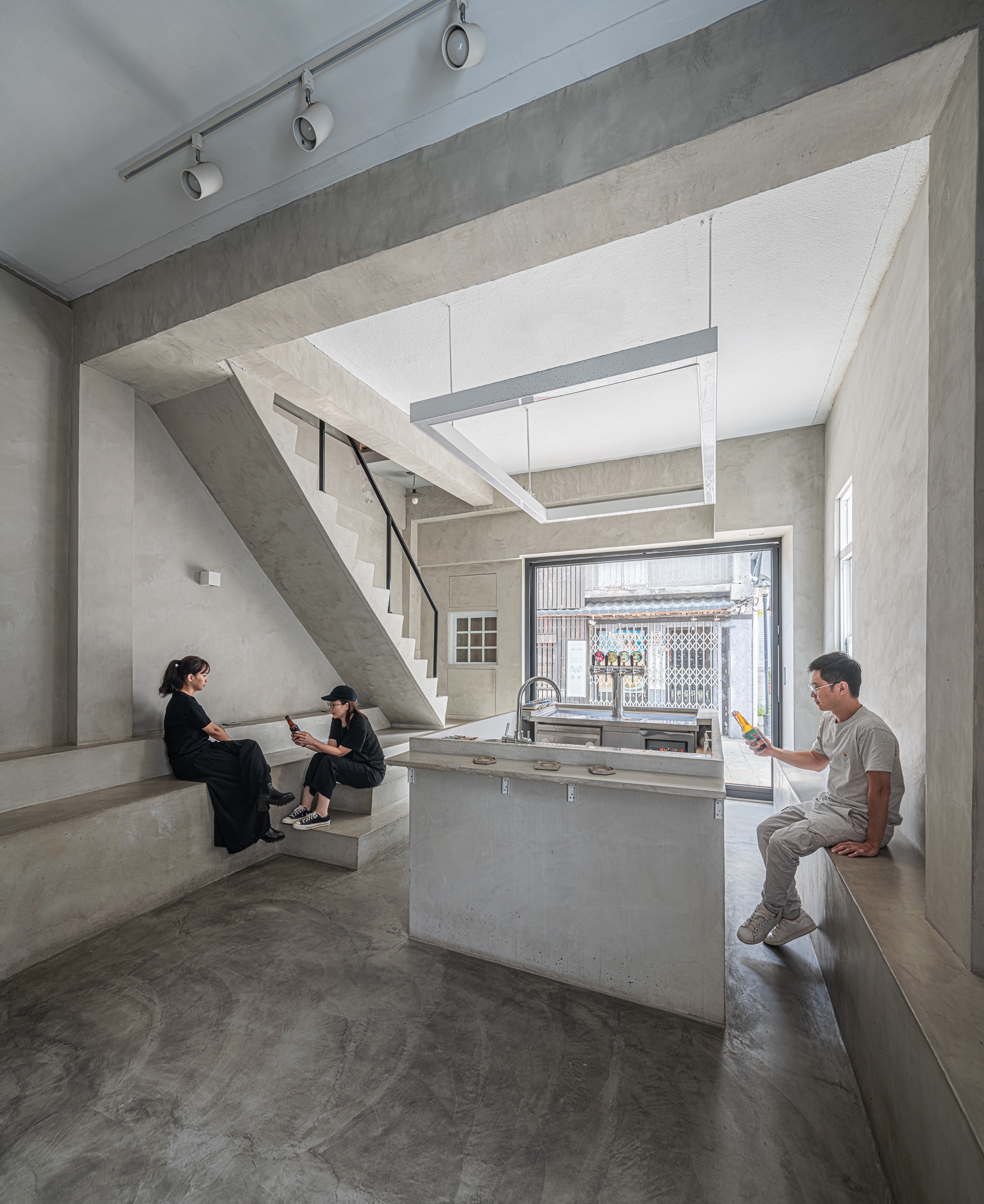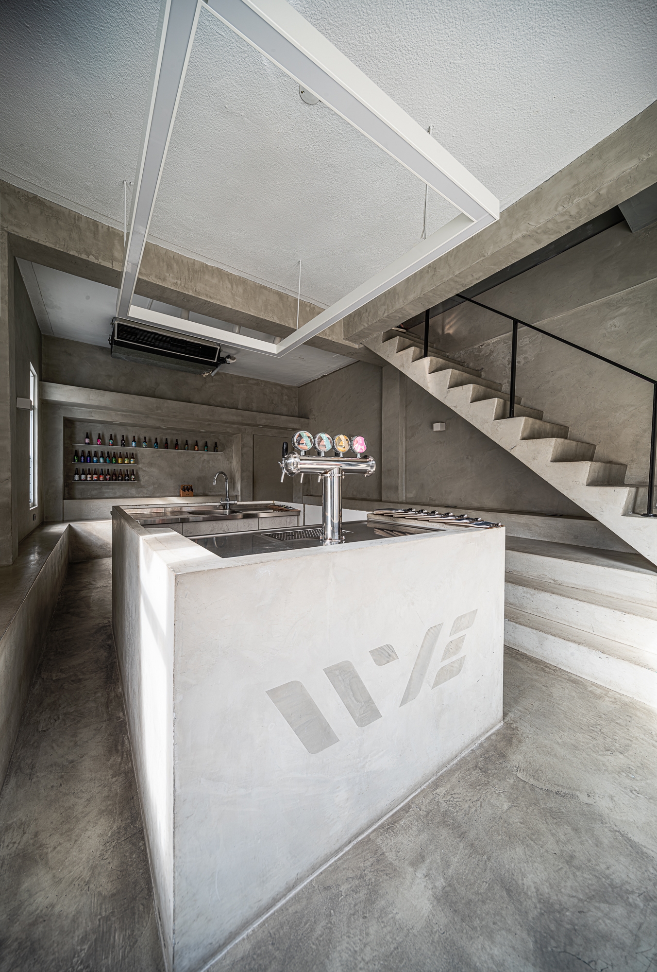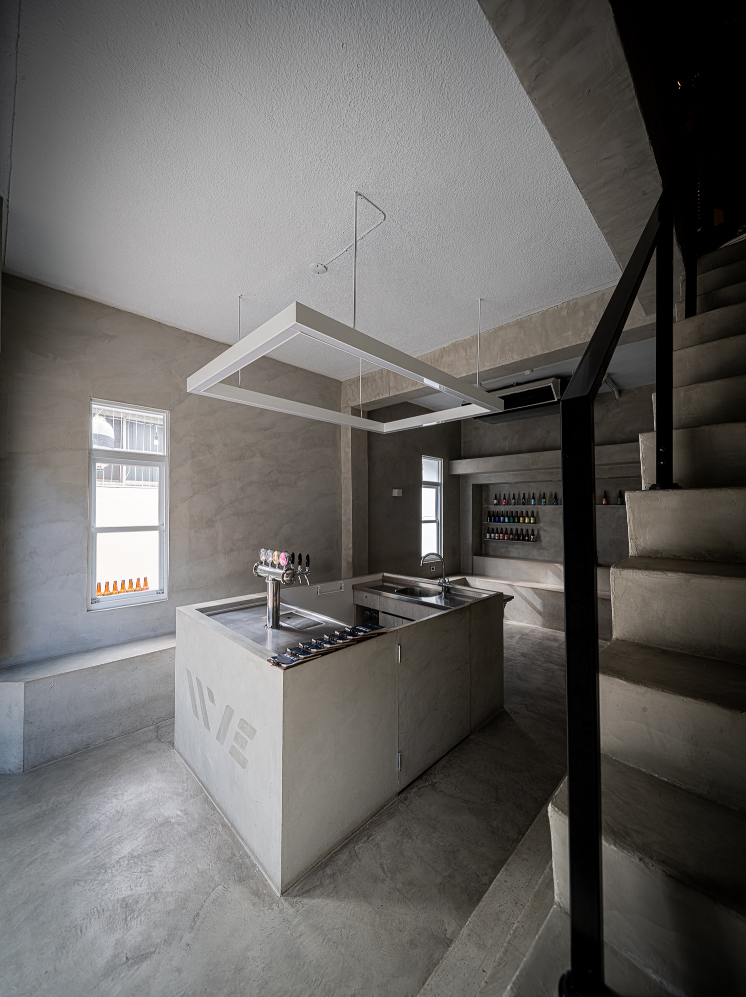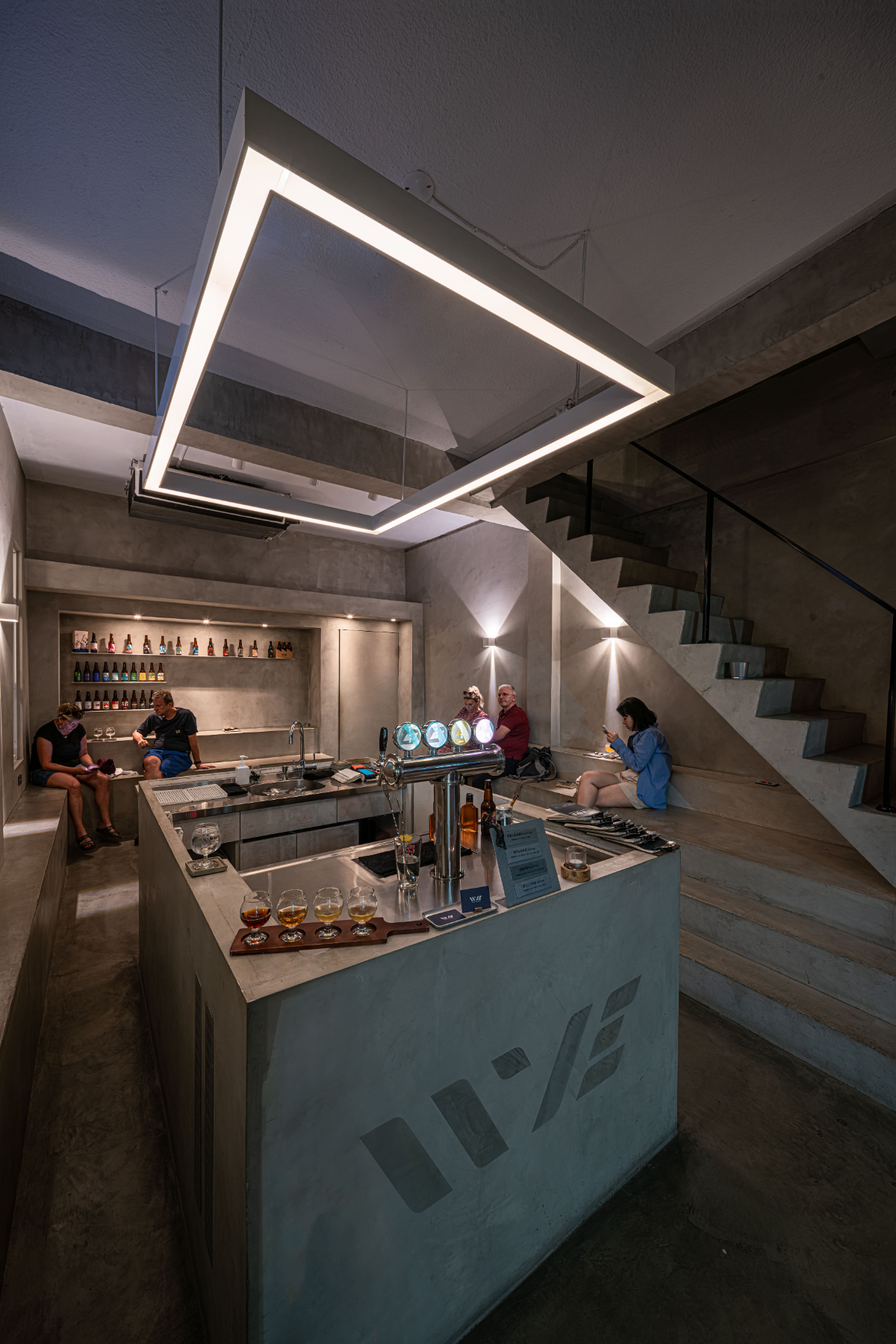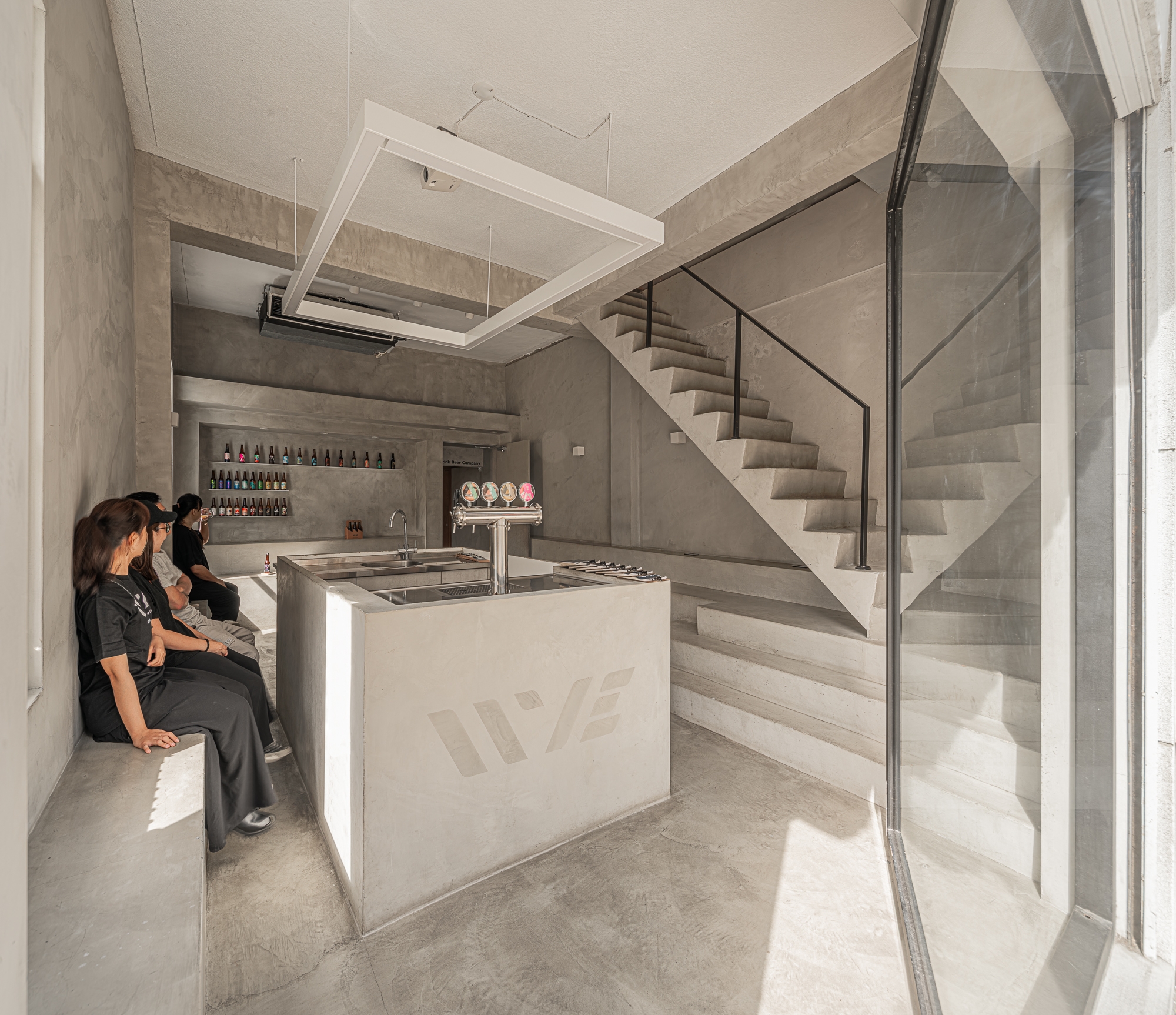 The minimalist cement design creates a serene ambiance, drawing attention to the vibrantly colored wine bottles. The stairway design extends into the seating area, offering various relaxed seating options to soothe the body, and thus reaching mentally and physically relax.